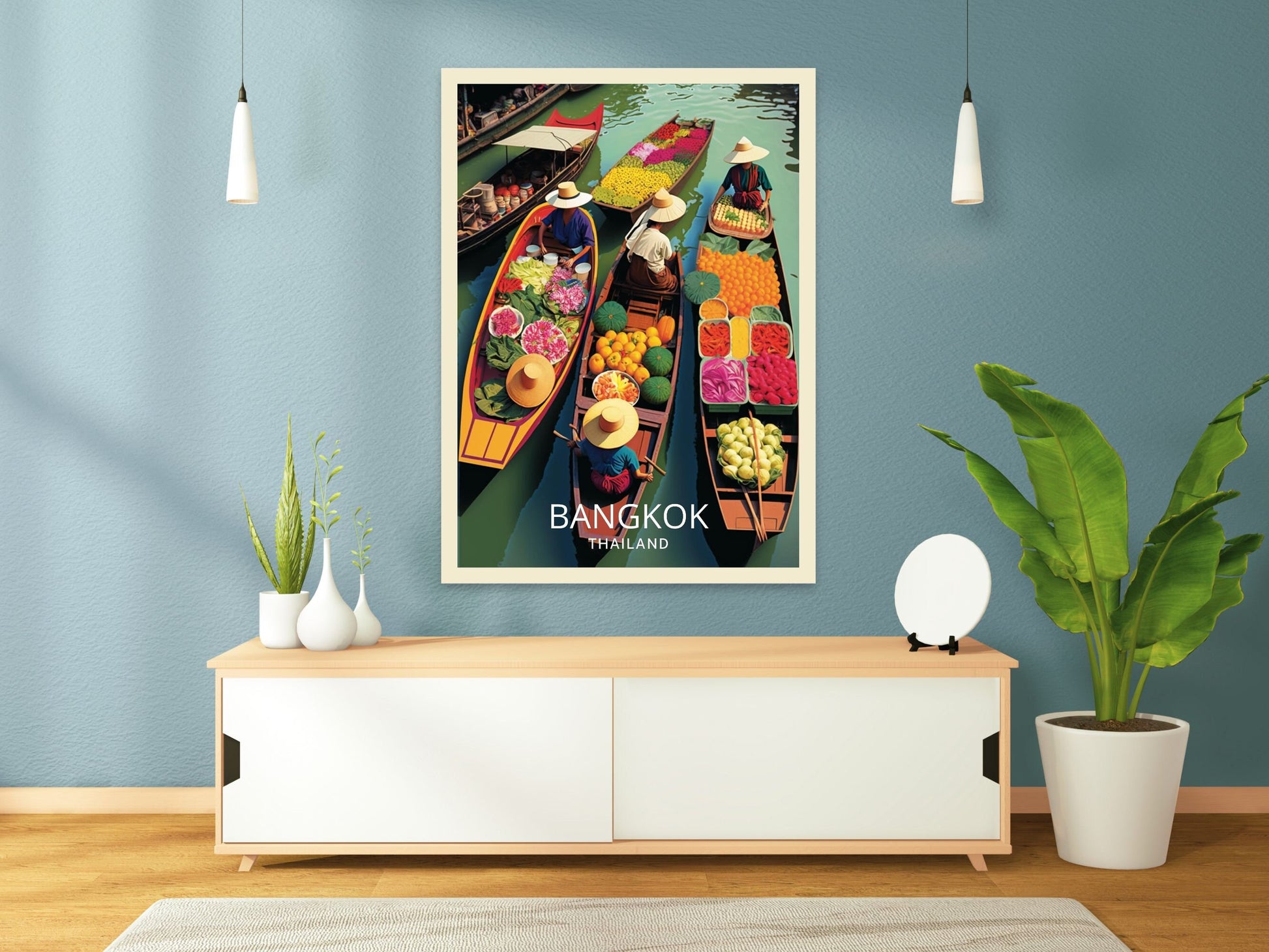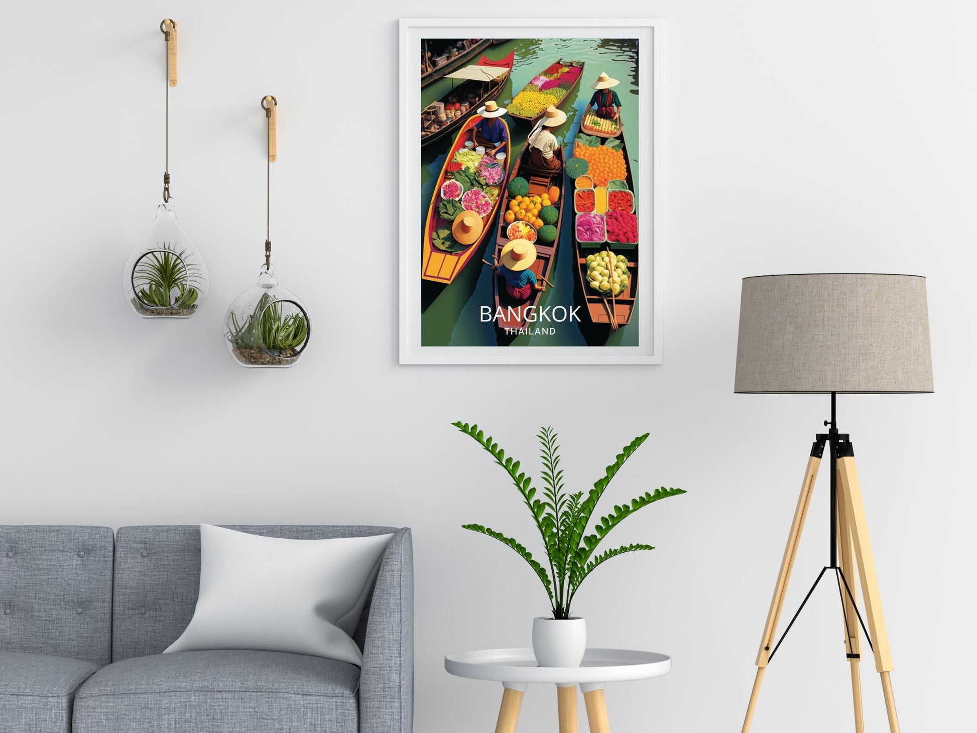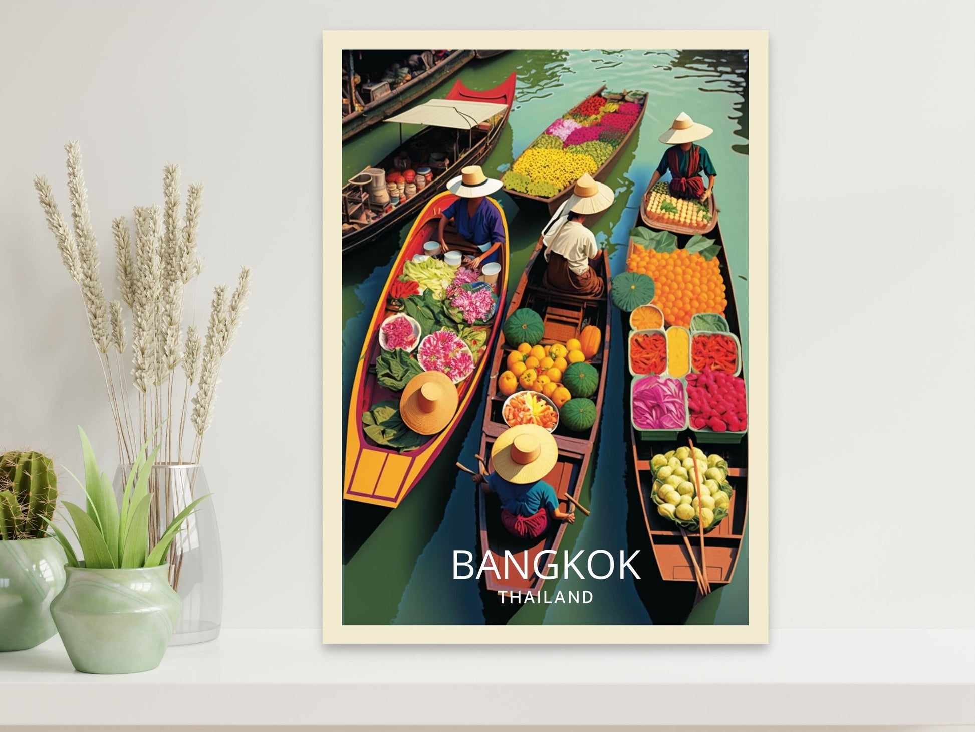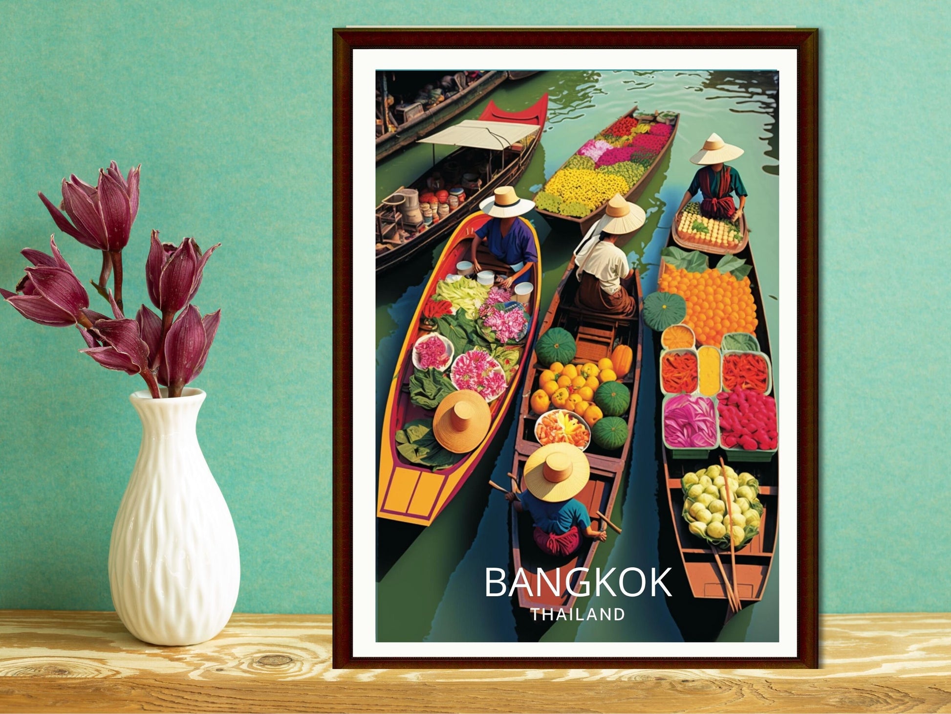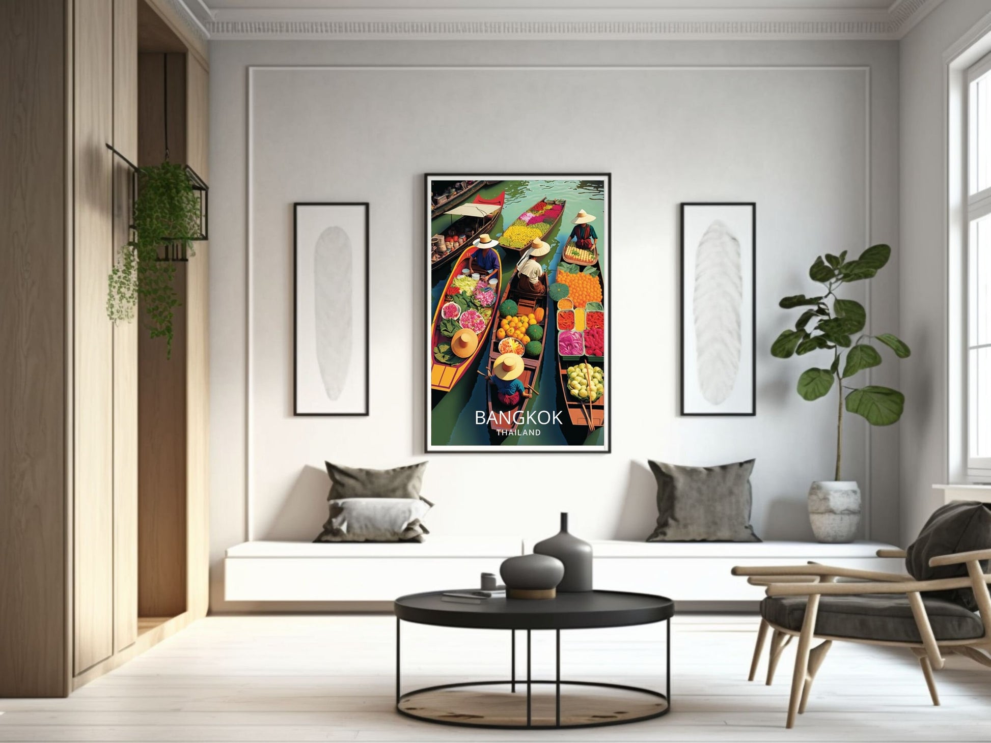 Transformez votre intérieur en un havre de paix et d'énergie à Bangkok grâce à cette œuvre captivante. Idéale pour les salons, les cuisines ou les espaces inspirés par le voyage, elle s'harmonise parfaitement avec d'autres œuvres d'art d'Asie du Sud-Est. Cette affiche de voyage est bien plus qu'un simple objet de décoration : c'est un voyage sur les marchés flottants de Bangkok.