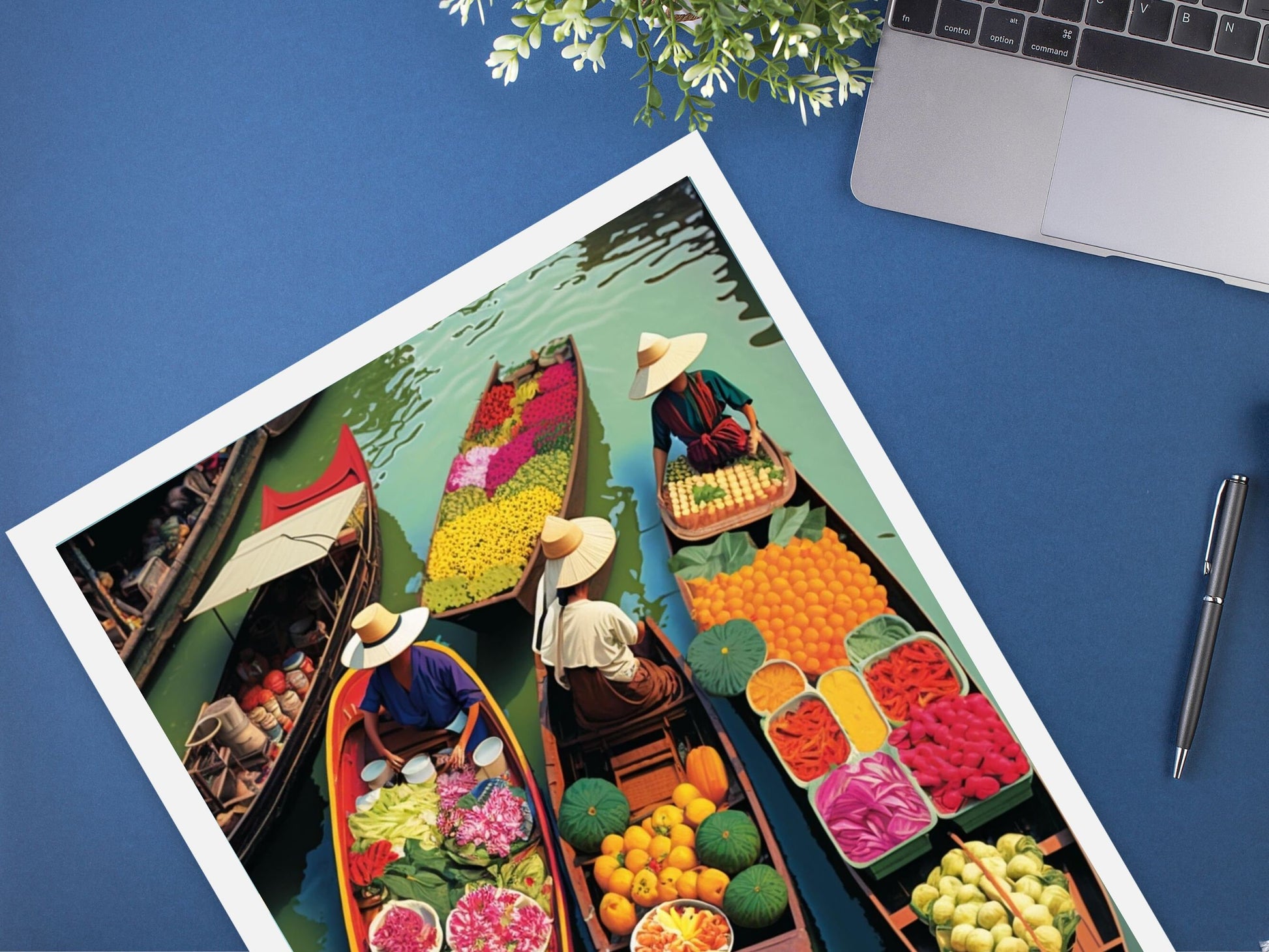 Cette œuvre mêle des bleus vifs et des jaunes éclatants à l'essence même des marchés de Bangkok, mettant en valeur son charme culturel avec un style vivant. Imprimée sur un papier de qualité supérieure, elle offre une vivacité durable et une finition lisse, ce qui en fait un cadeau idéal pour les aventuriers ou les collectionneurs d'art. Cette affiche de Bangkok apporte une touche de dynamisme thaïlandais à tous vos murs.