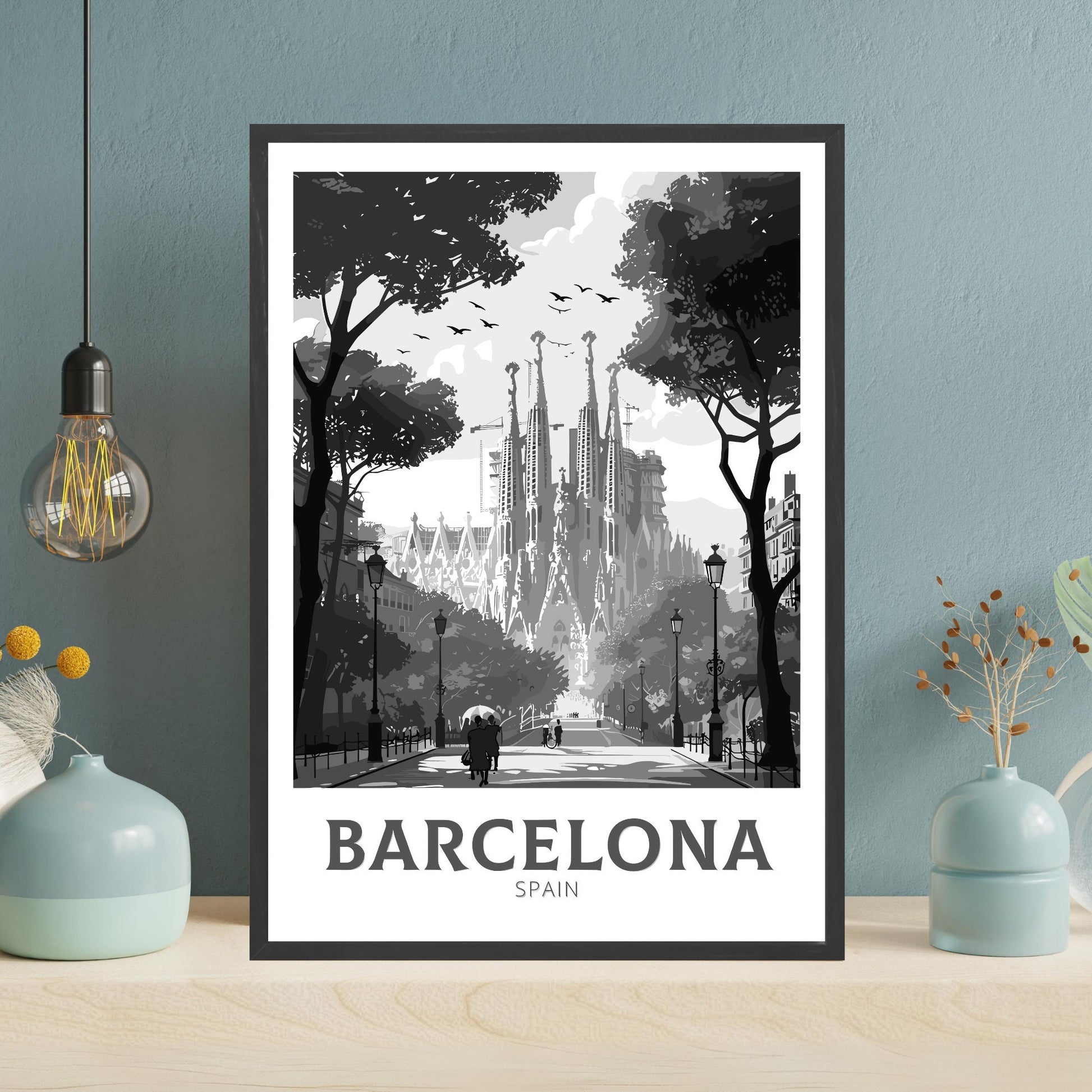 Inspirez l'esprit artistique de la Catalogne espagnole avec cette affiche de voyage en noir et blanc de Barcelone . Mettant en valeur des monuments emblématiques comme la Sagrada Família, le parc Güell et le quartier gothique dans un monochrome saisissant, cette affiche apporte sophistication et charme à tout espace. Parfaite pour les amateurs d'art, les passionnés de voyages ou toute personne recherchant une décoration murale minimaliste.