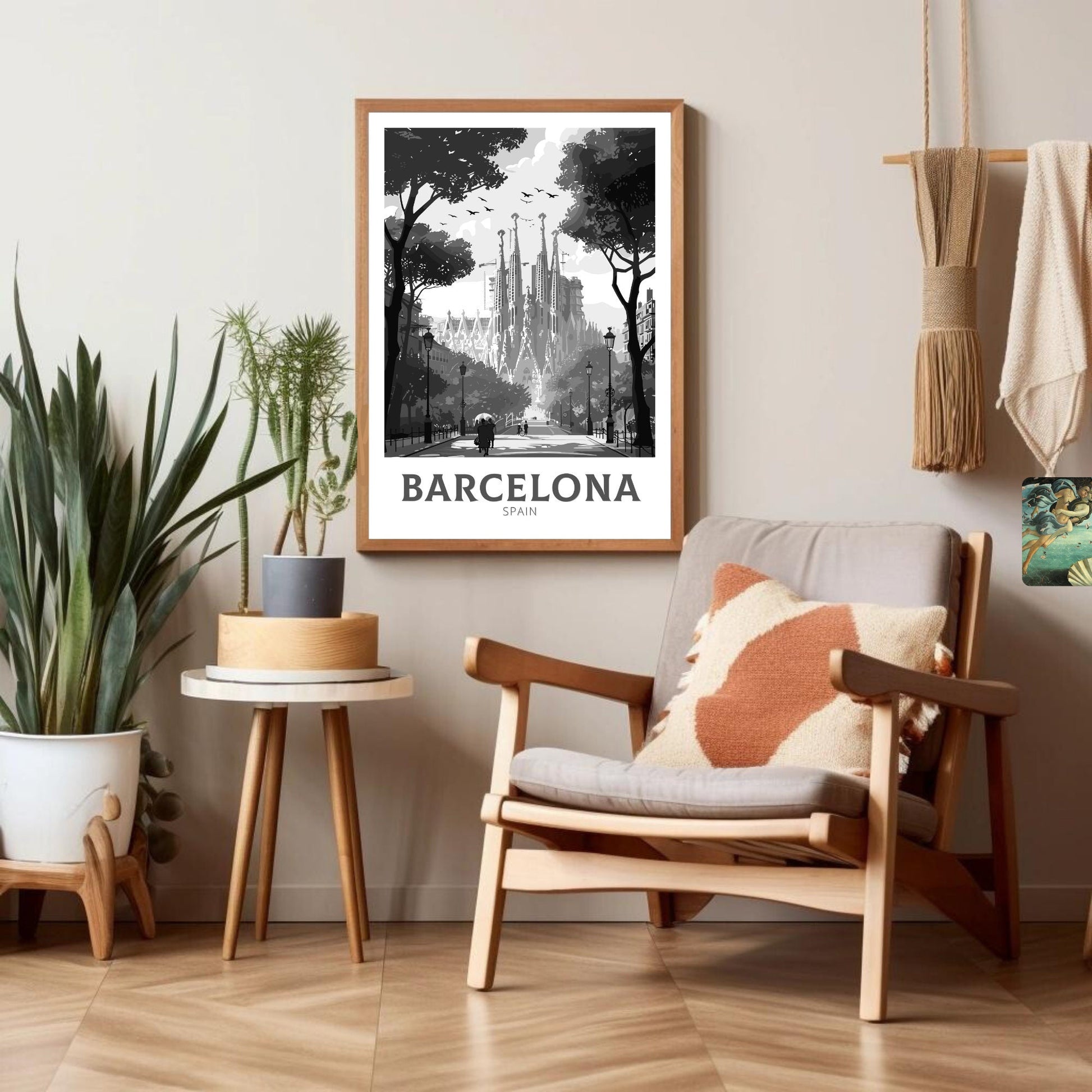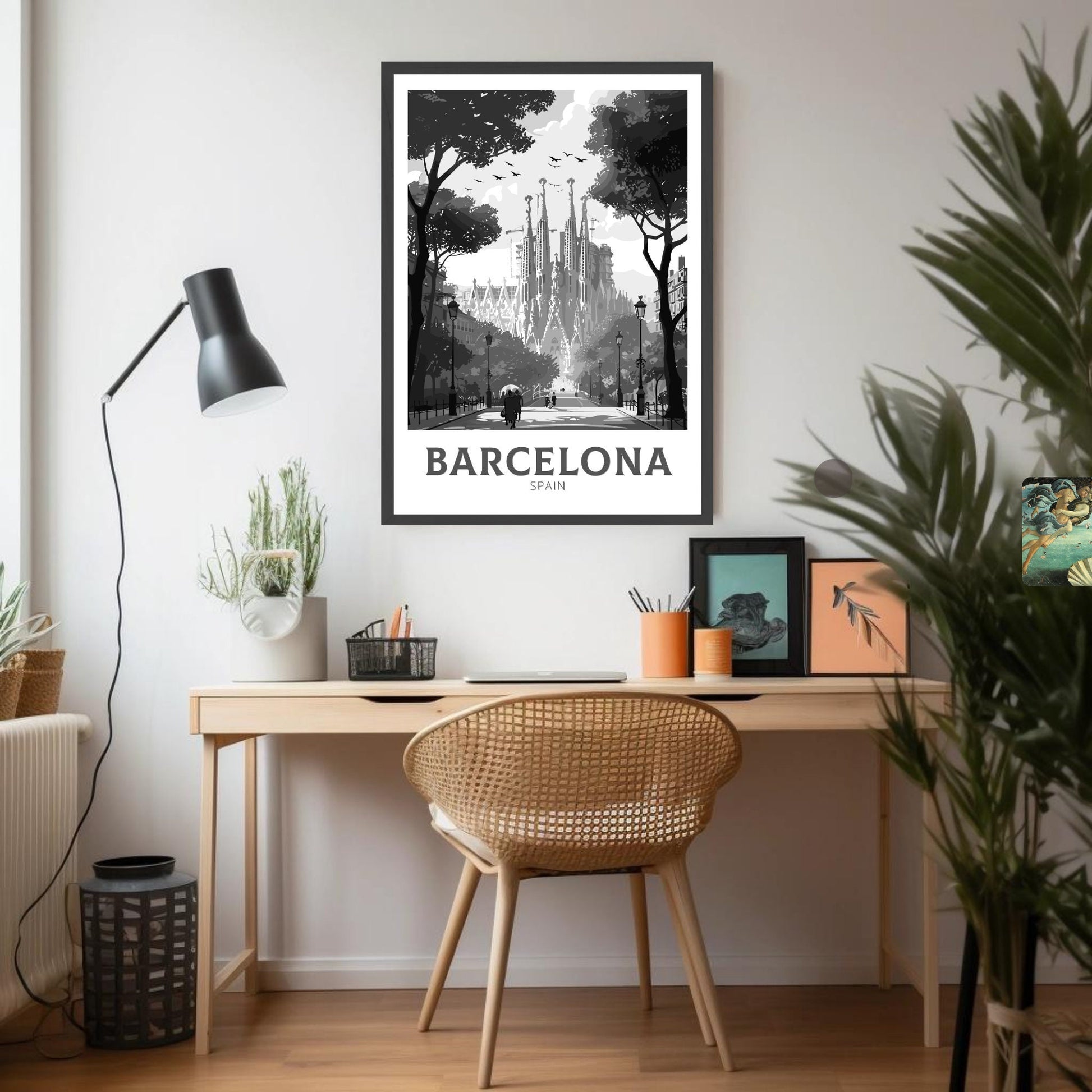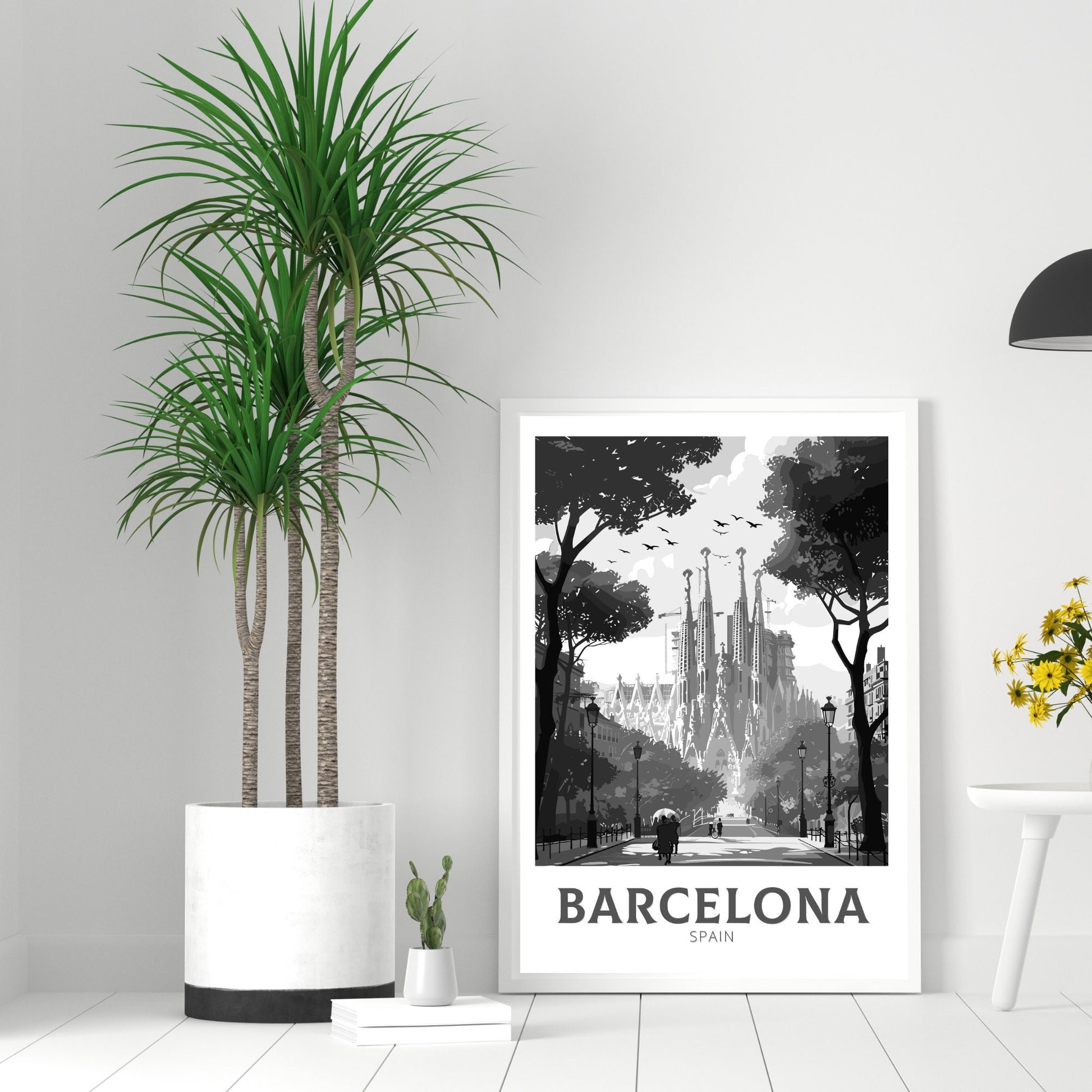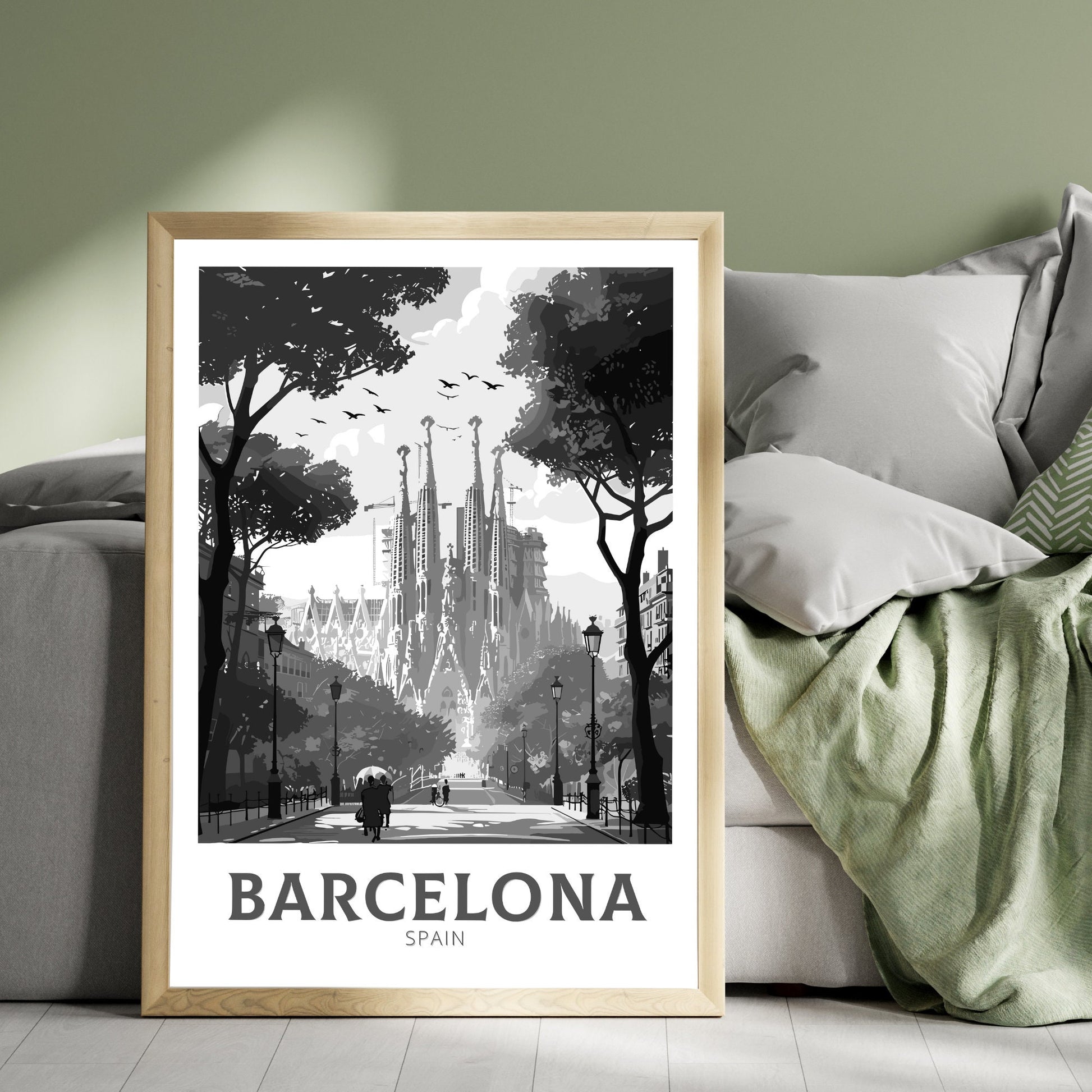 Cette affiche de voyage de Barcelone est disponible en plusieurs formats, idéale pour le salon, le bureau ou comme cadeau élégant. Son design contrasté met en valeur l'architecture unique et la culture vibrante de la ville, créant ainsi une œuvre d'art murale intemporelle.