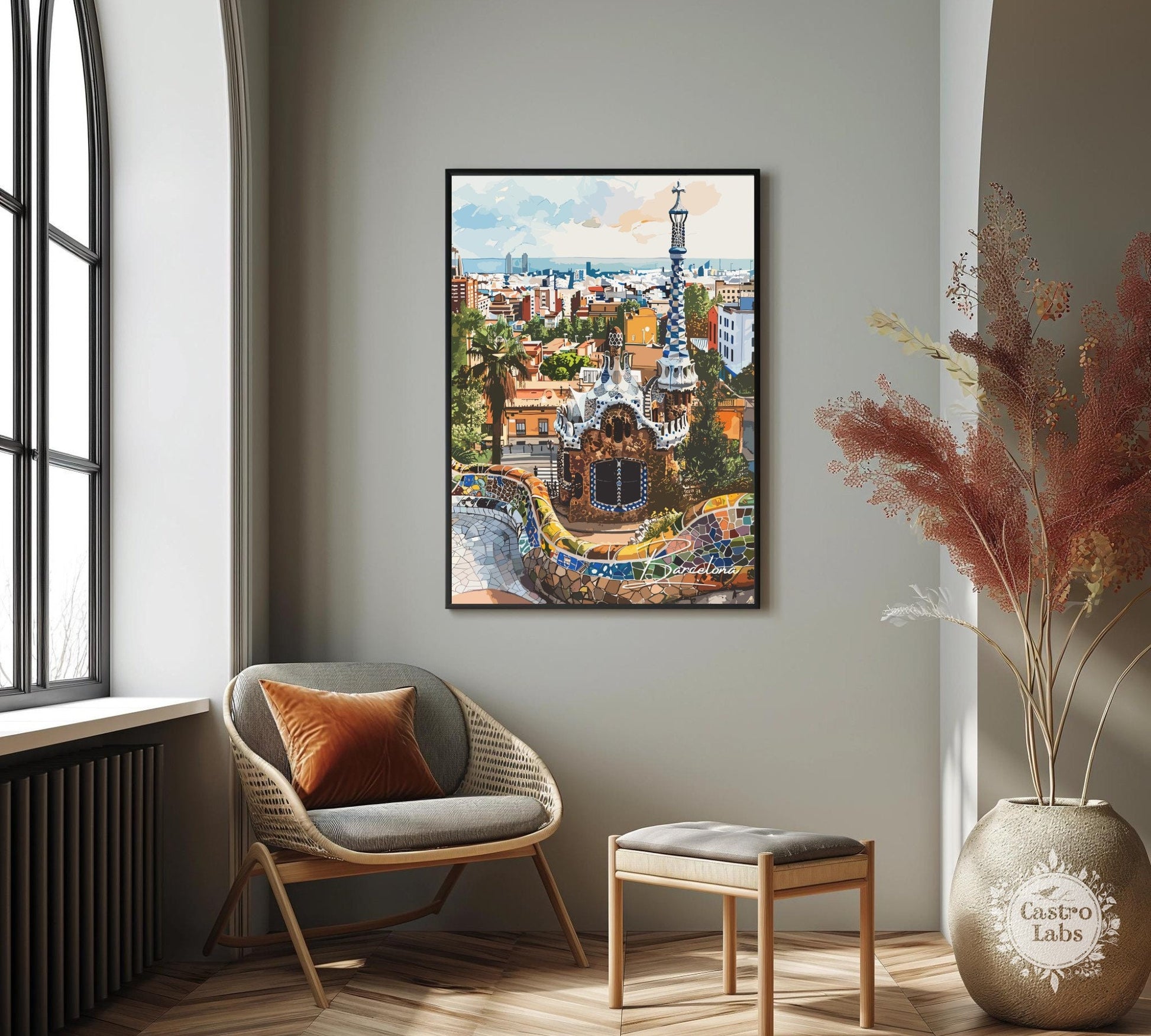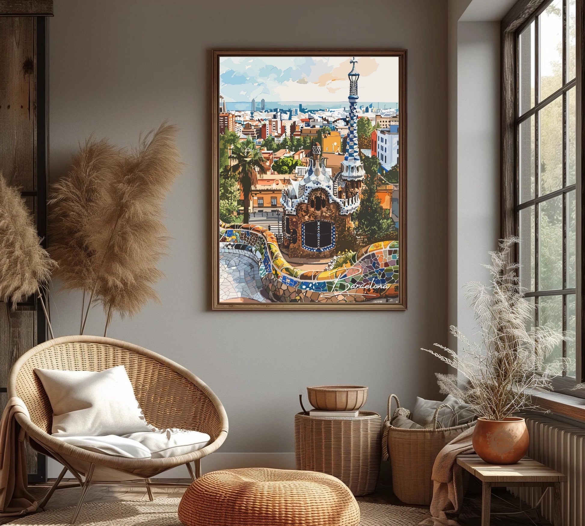 Faites entrer l'esprit vibrant de Barcelone chez vous avec cette superbe affiche de voyage sur le Parc Güell . Mettant en valeur les mosaïques colorées et l'architecture fantaisiste du célèbre parc de Gaudí, cette œuvre capture le charme unique et la créativité de l'un des monuments les plus emblématiques d'Espagne.