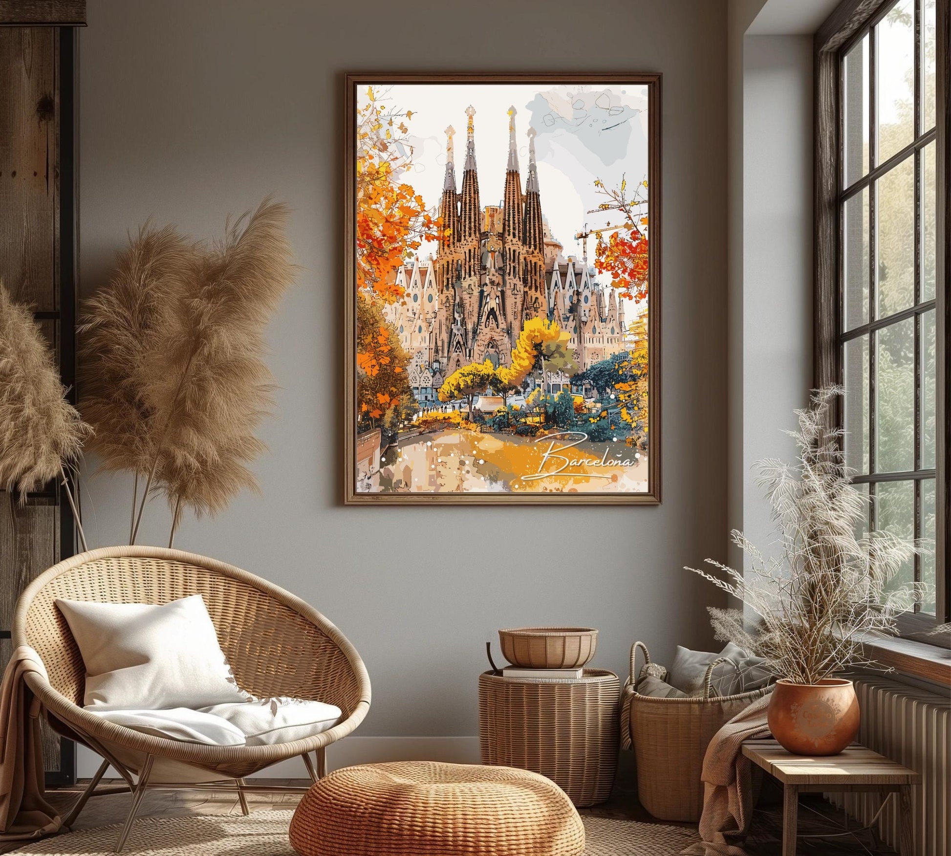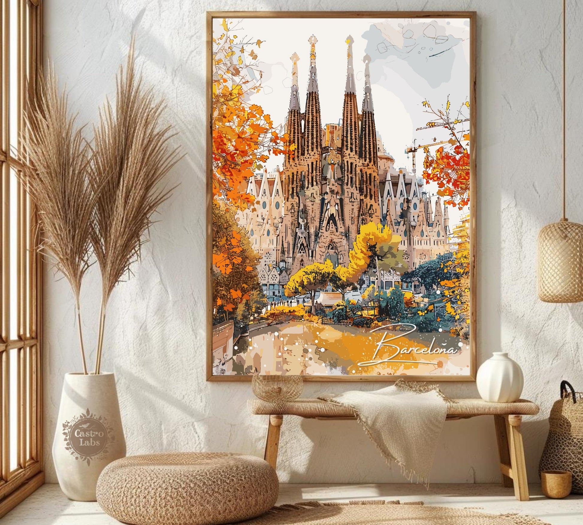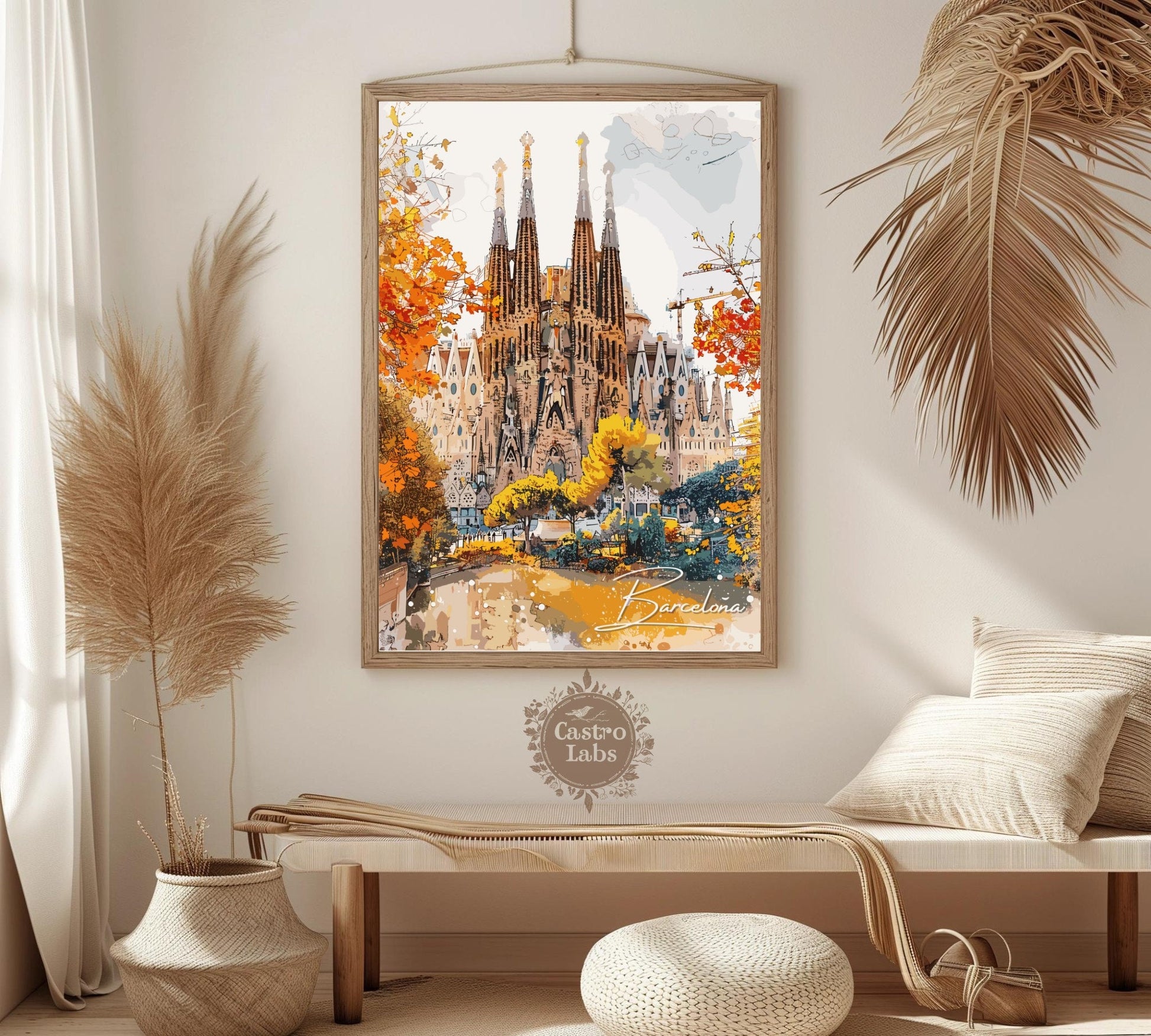 Apportez l'esprit de Barcelone chez vous avec cet élégant imprimé de voyage Sagrada Familia.