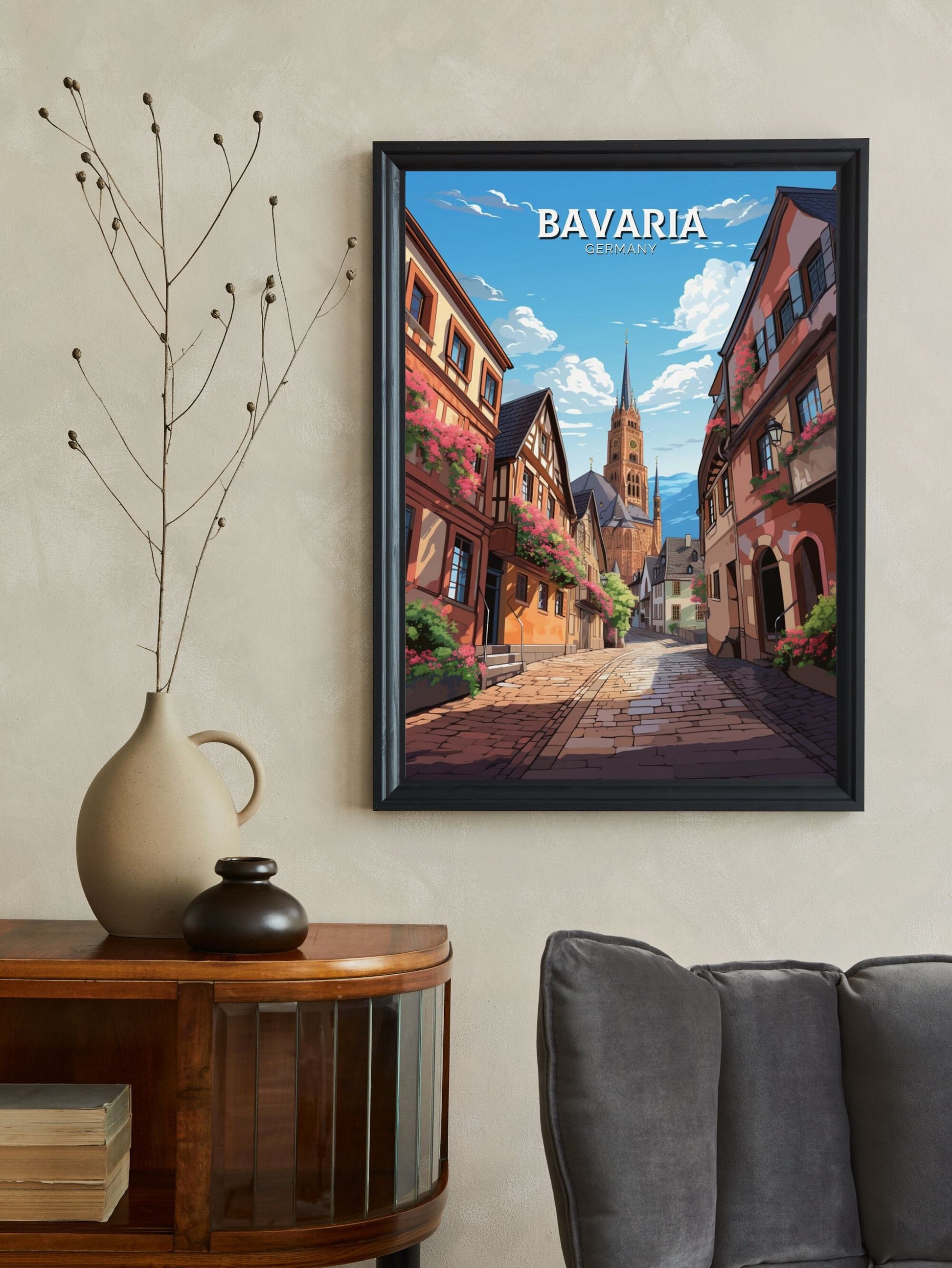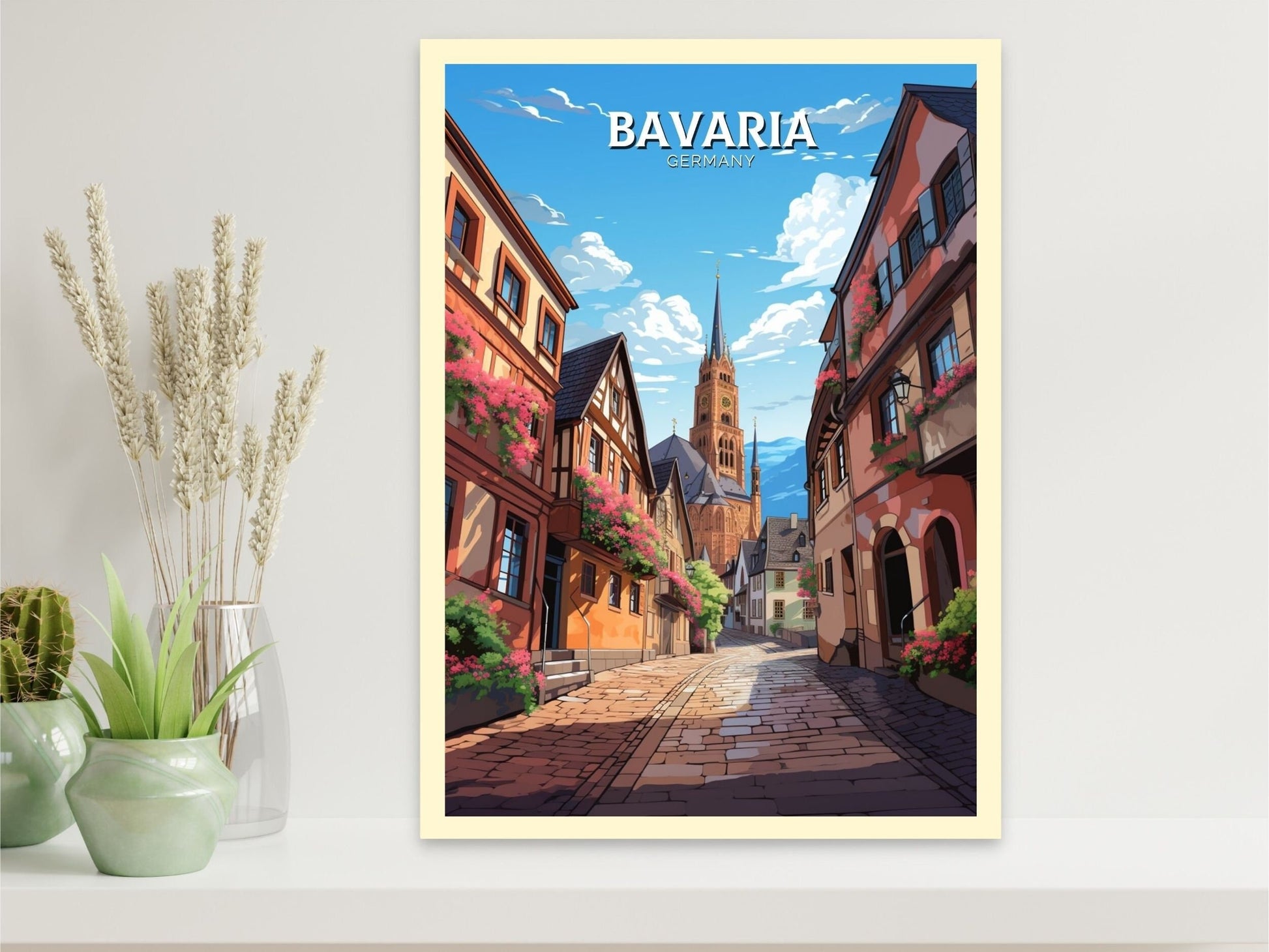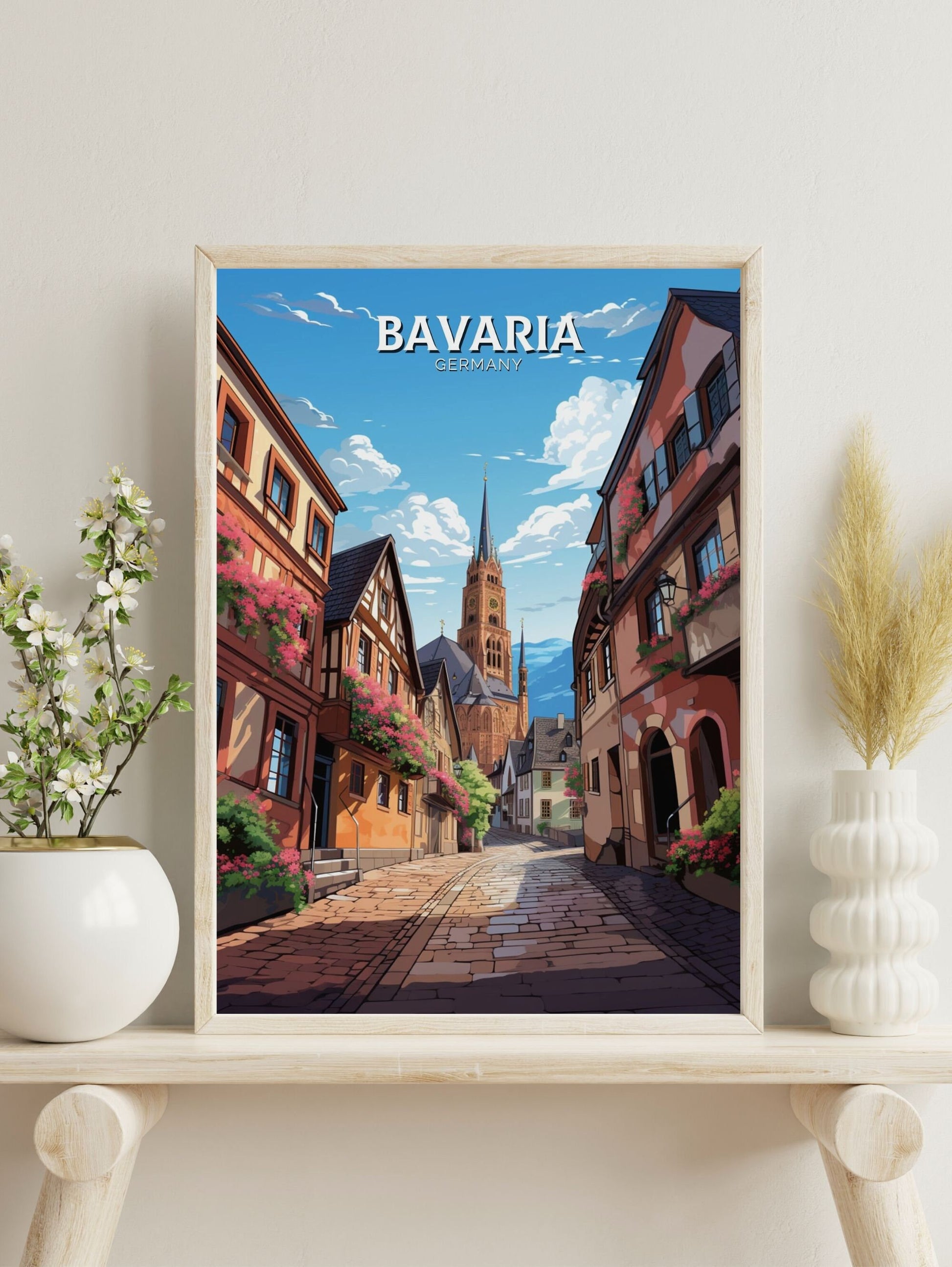Capturez le charme féérique du sud de l'Allemagne avec cette charmante affiche de voyage bavaroise , magnifiquement conçue comme une œuvre d'art allemande. Des majestueux sommets alpins aux maisons traditionnelles en bois et aux châteaux comme Neuschwanstein, cette œuvre incarne l'esprit bavarois.