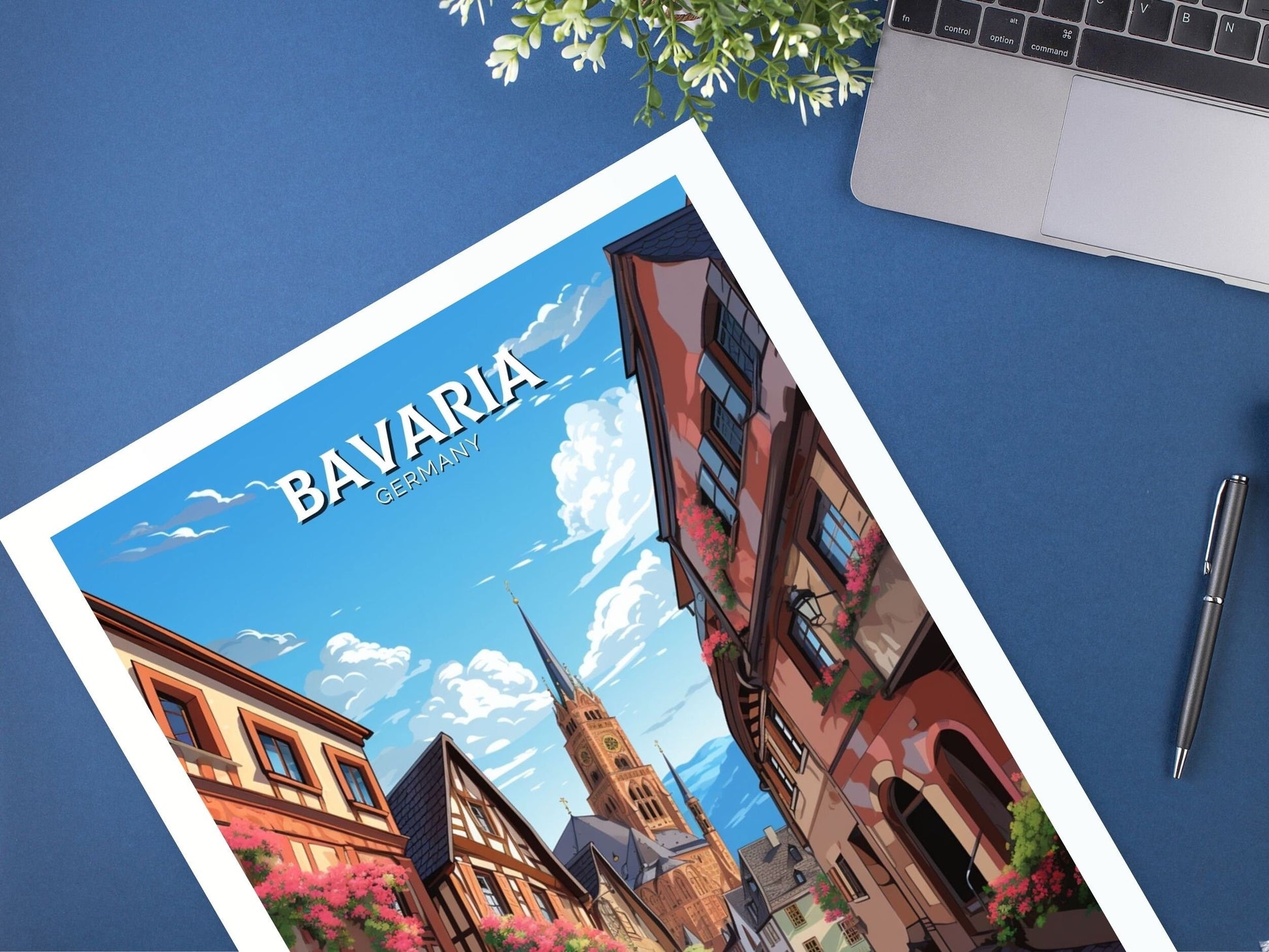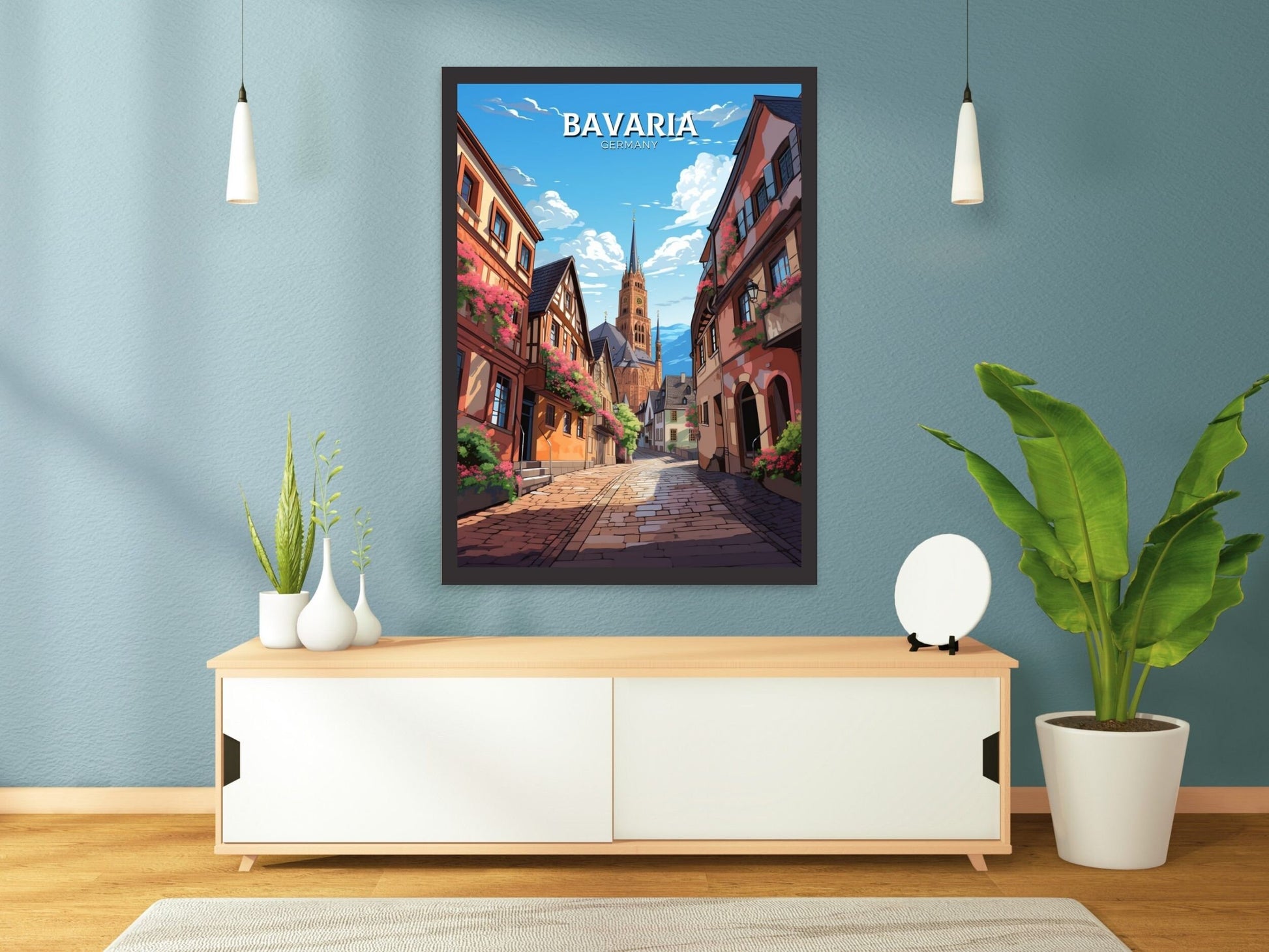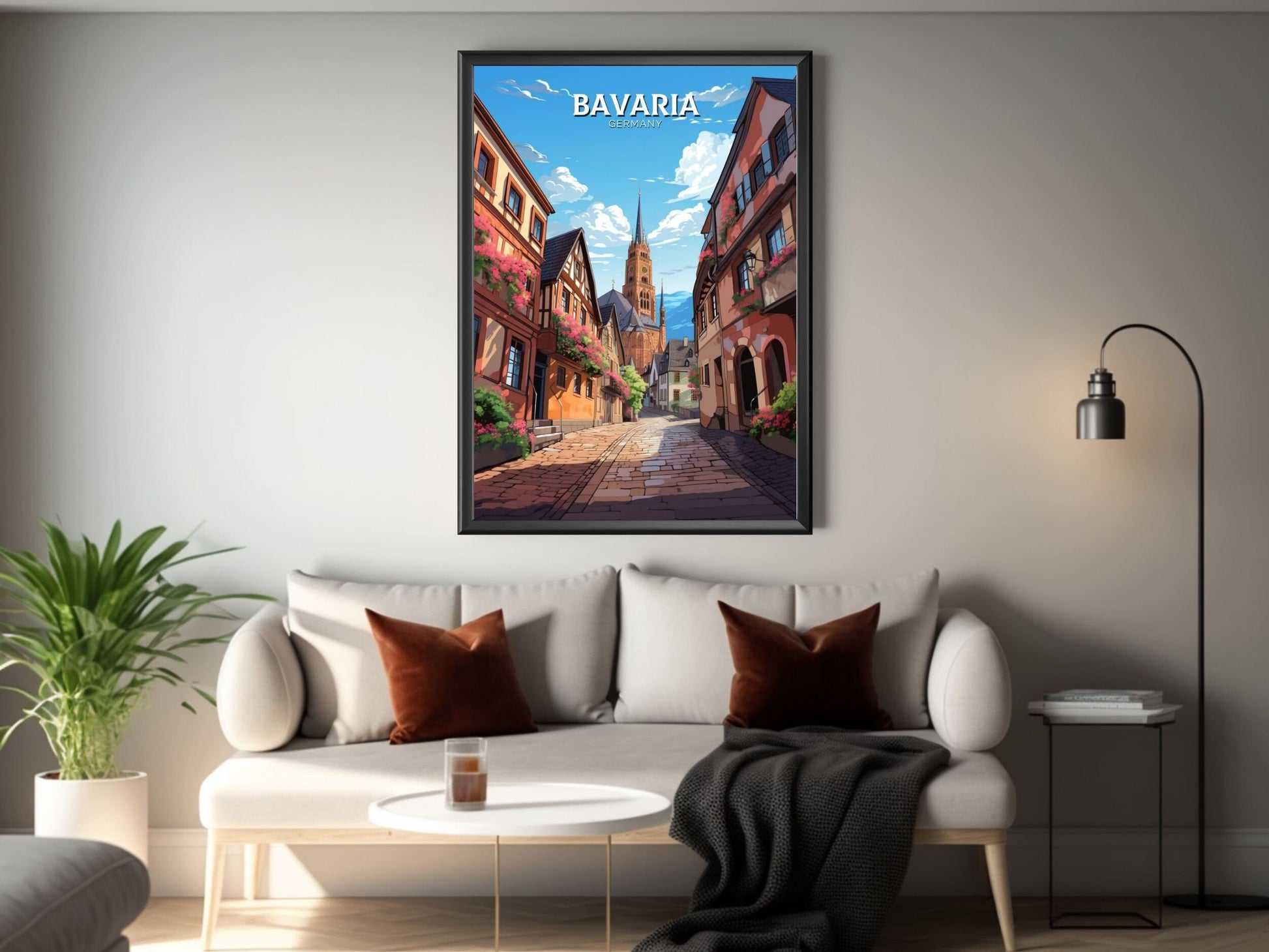 Capturez le charme féérique du sud de l'Allemagne avec cette charmante affiche de voyage bavaroise , magnifiquement conçue comme une œuvre d'art allemande. Des majestueux sommets alpins aux maisons traditionnelles en bois et aux châteaux comme Neuschwanstein, cette œuvre incarne l'esprit bavarois.