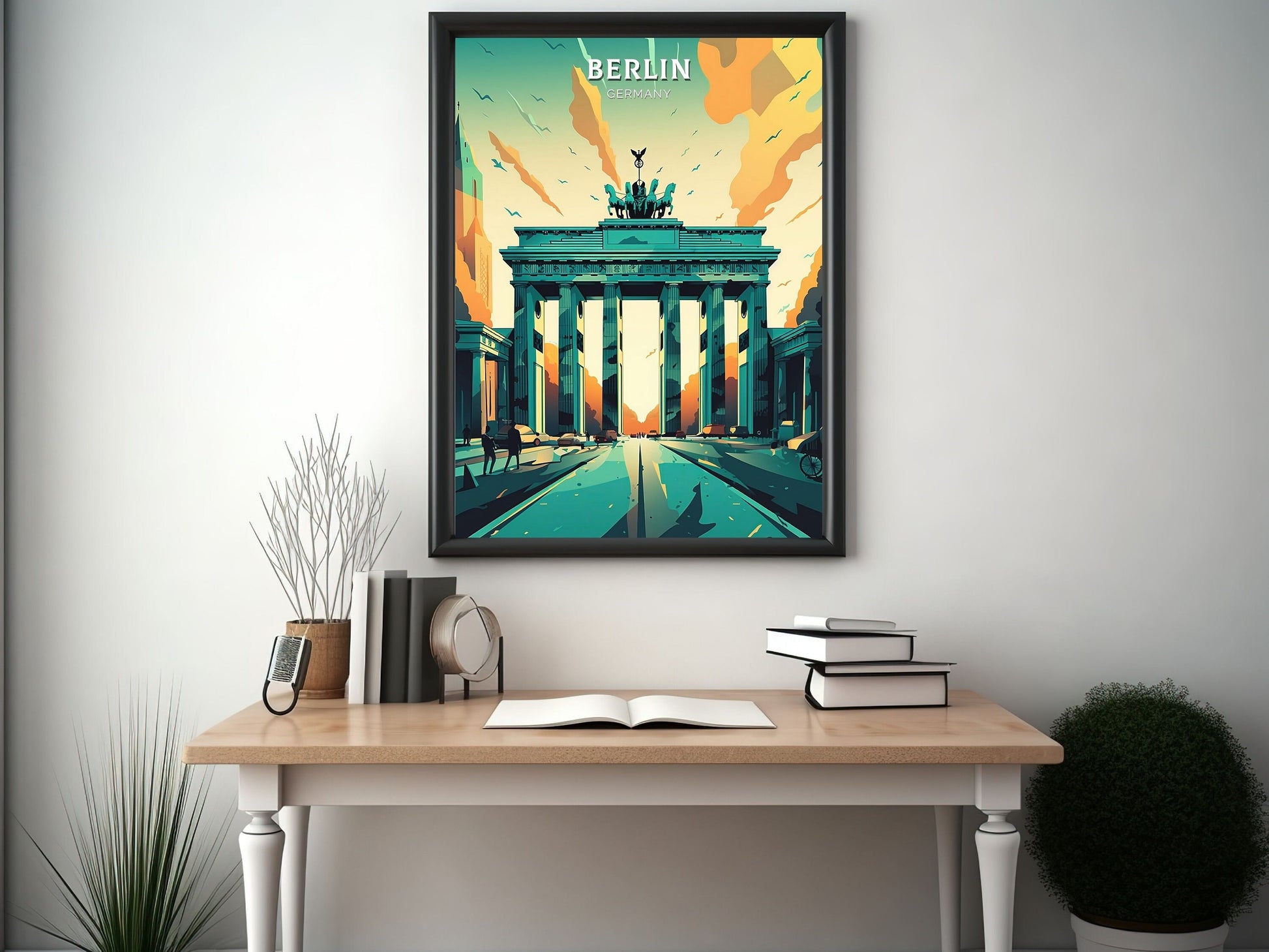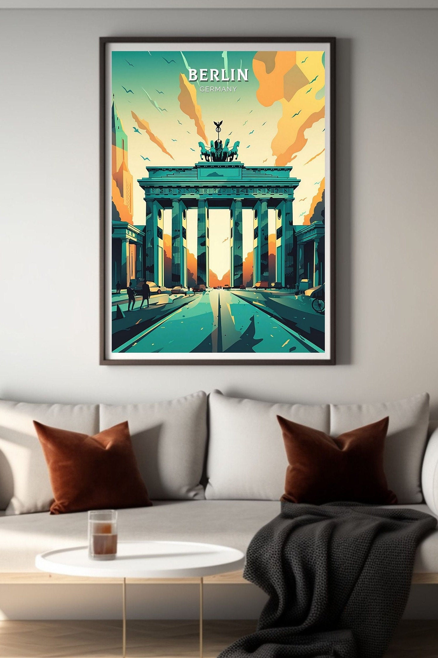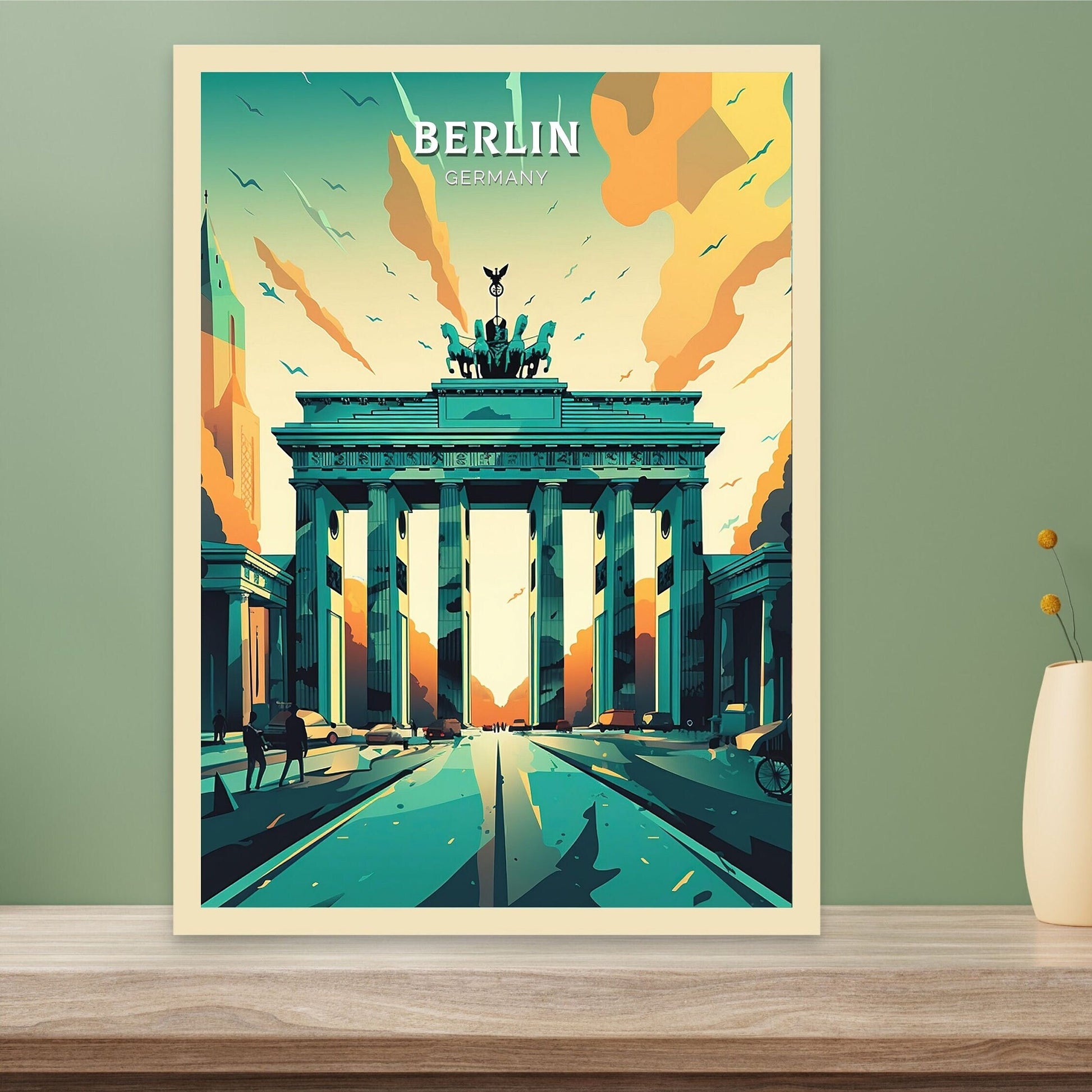 Célébrez la grandeur de l'un des monuments les plus emblématiques d'Allemagne avec cette élégante affiche de voyage de Berlin , représentant la Porte de Brandebourg dans toute sa beauté néoclassique. Cette œuvre détaillée capture le cœur historique de Berlin, symbolisant l'unité, la résilience et le riche héritage culturel de la ville.