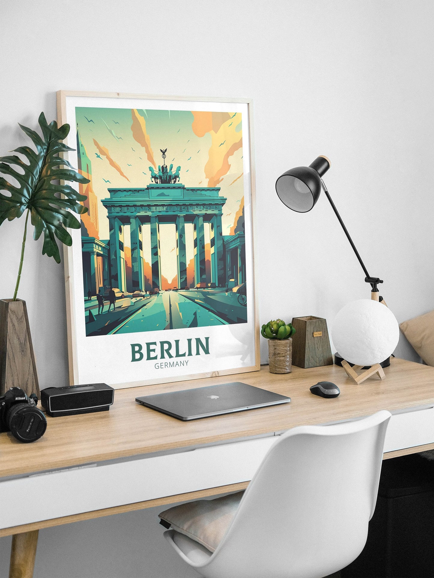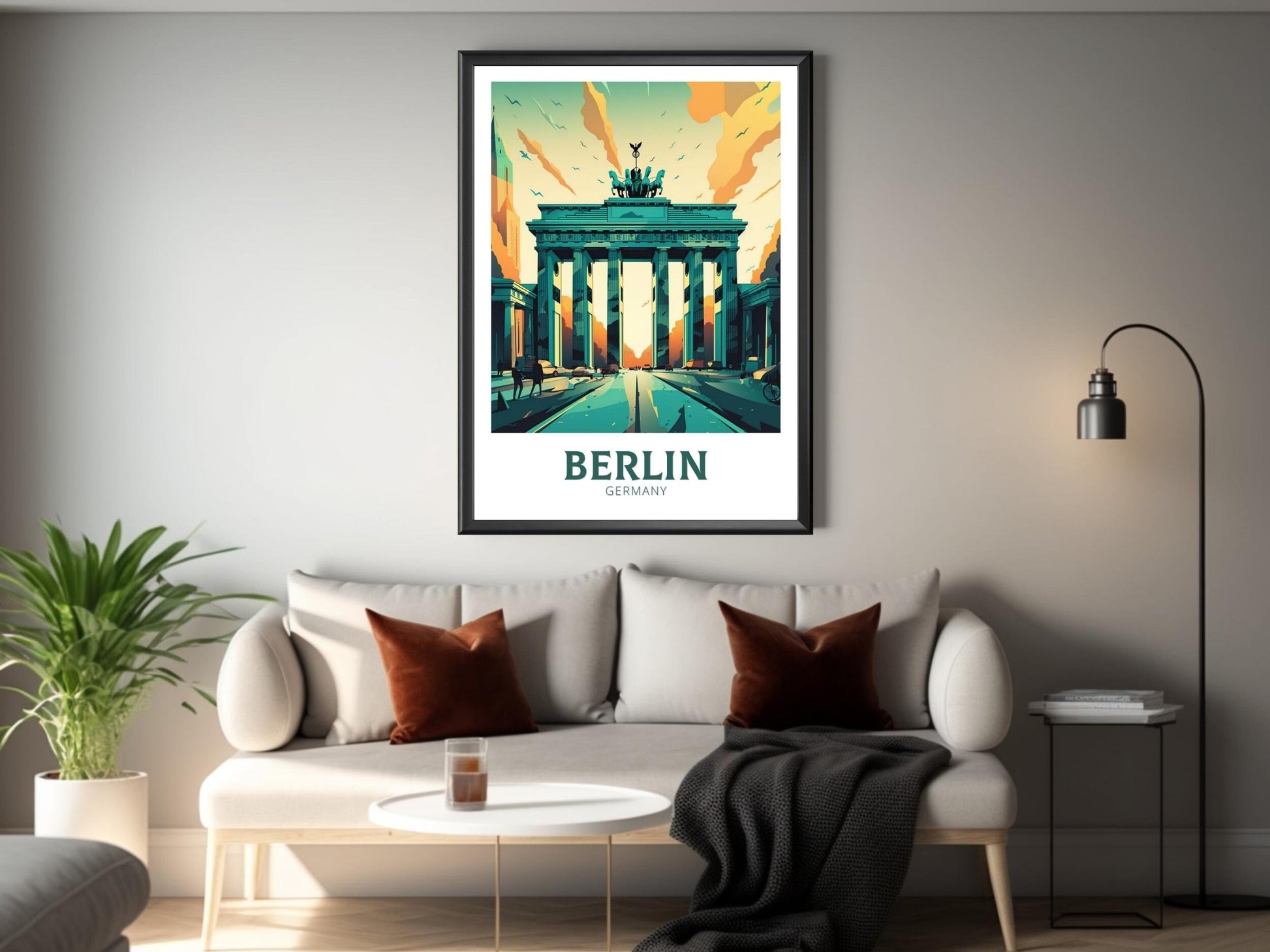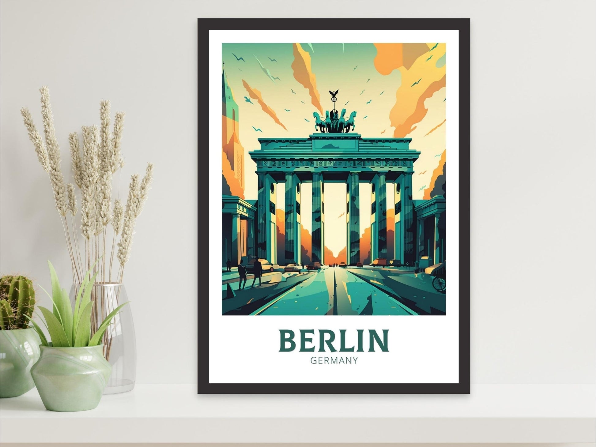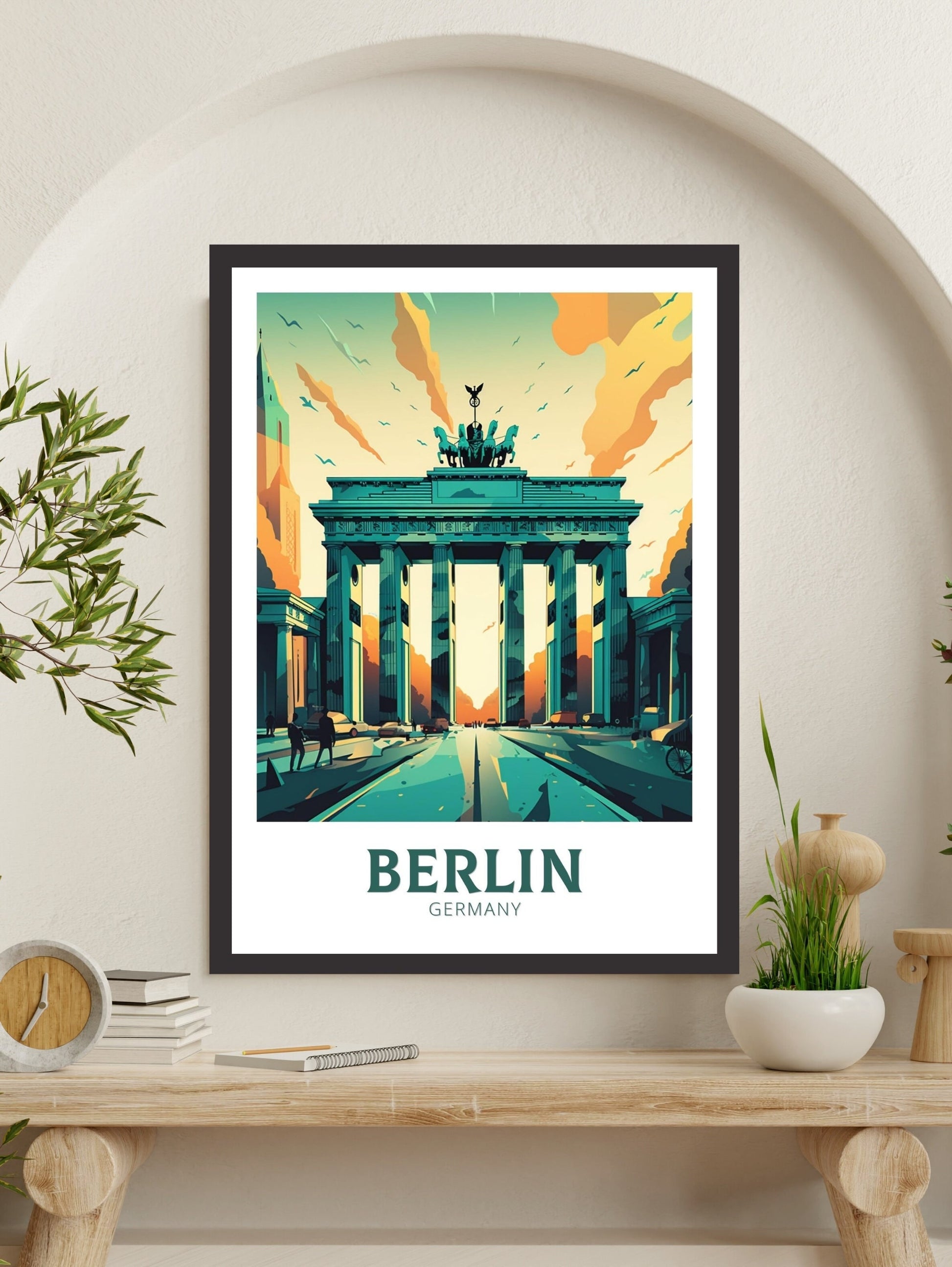 Apportez un peu de la riche histoire de Berlin chez vous avec cette élégante affiche de voyage , représentant la Porte de Brandebourg dans un design magnifiquement stylisé. Symbole intemporel d'unité et de force, la Porte se dresse au cœur de la capitale allemande et est ici immortalisée avec finesse et couleur.