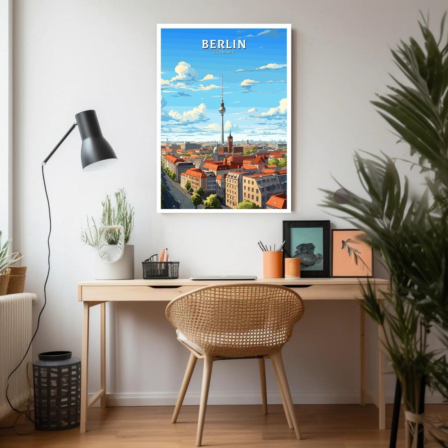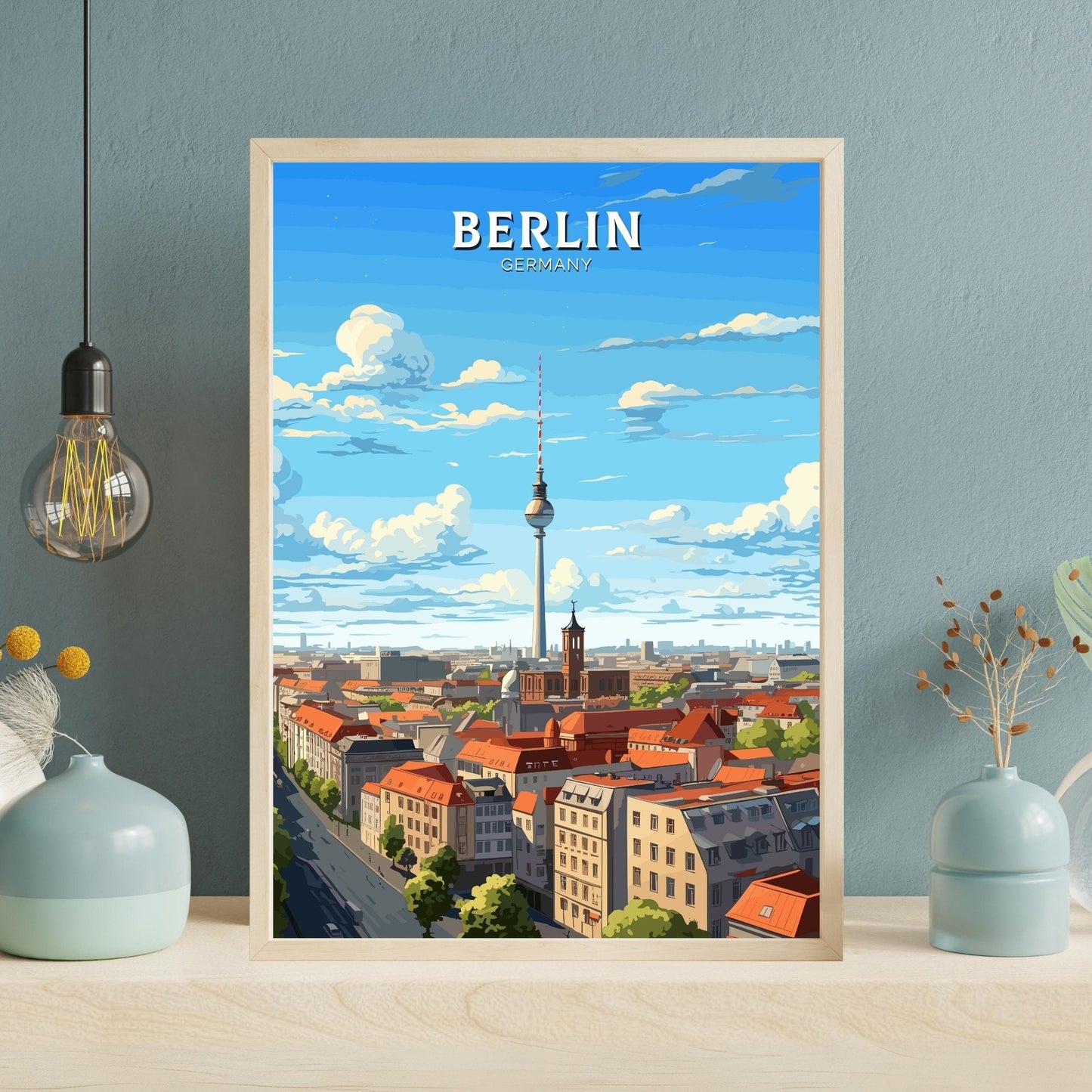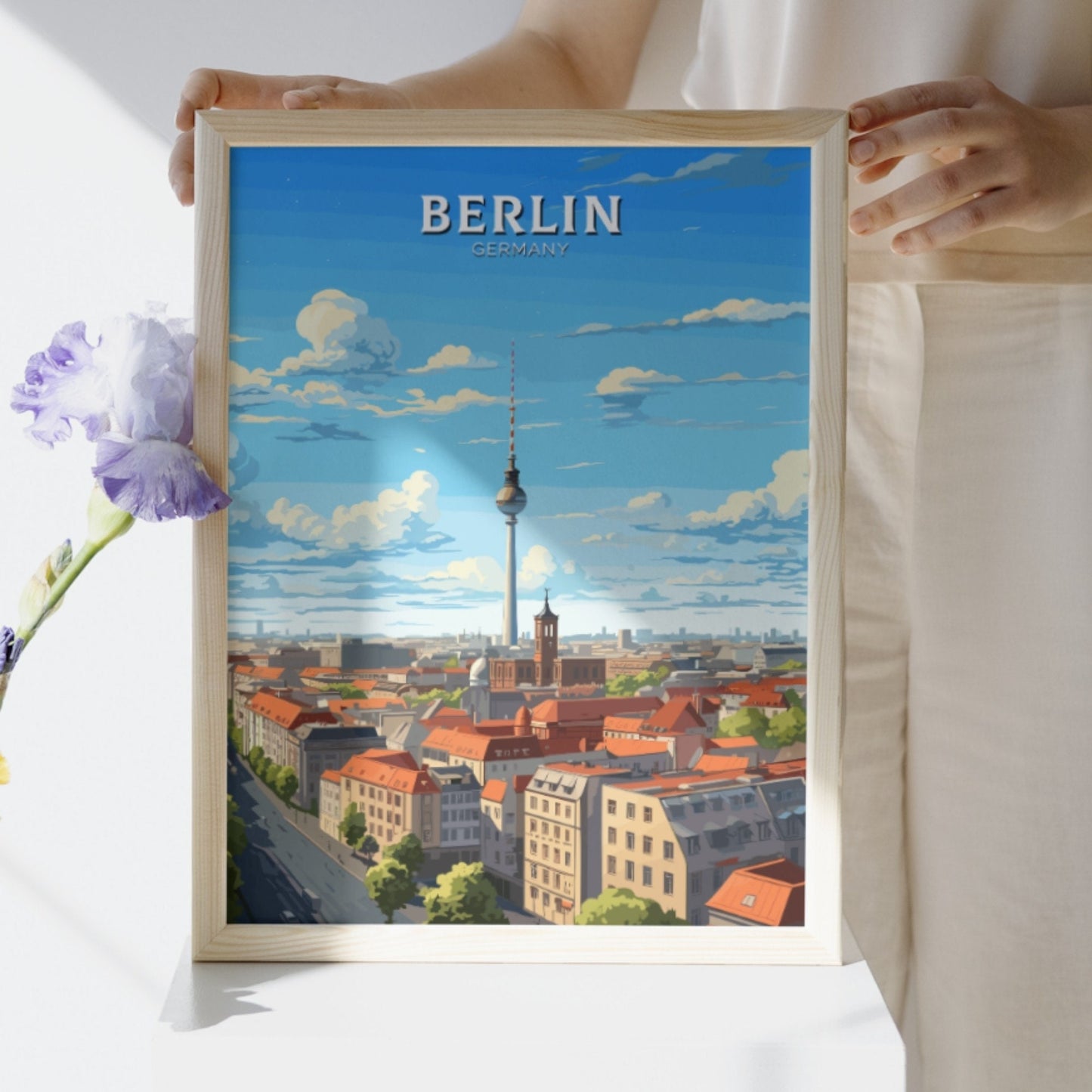 Ajoutez une touche culturelle audacieuse à votre espace avec cette affiche Berlin Travel Wallart , une affiche allemande qui capture l'énergie et l'élégance de la capitale. Mettant en vedette les monuments les plus emblématiques de Berlin, comme la porte de Brandebourg et la tour de télévision, cette œuvre allie modernité et charme historique.