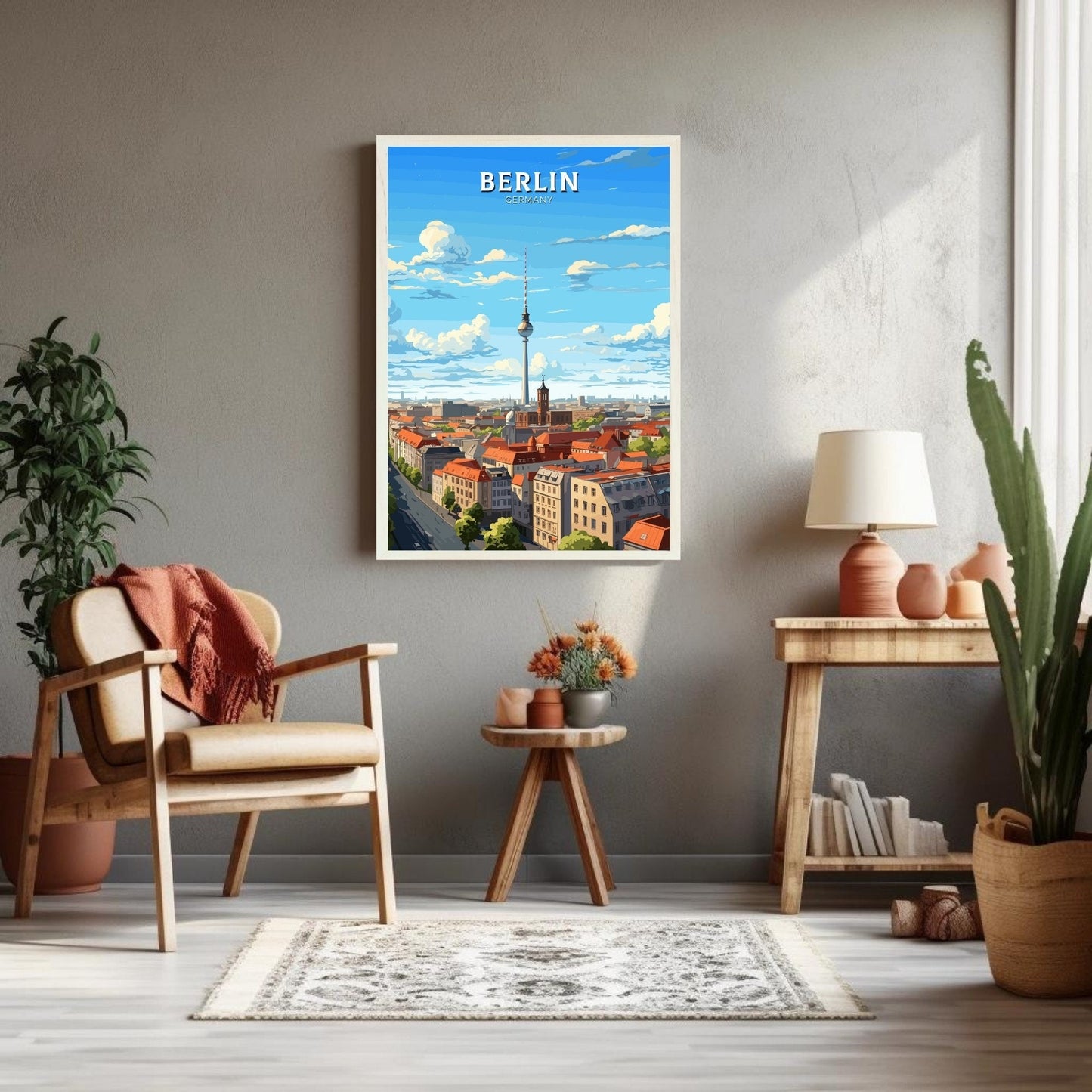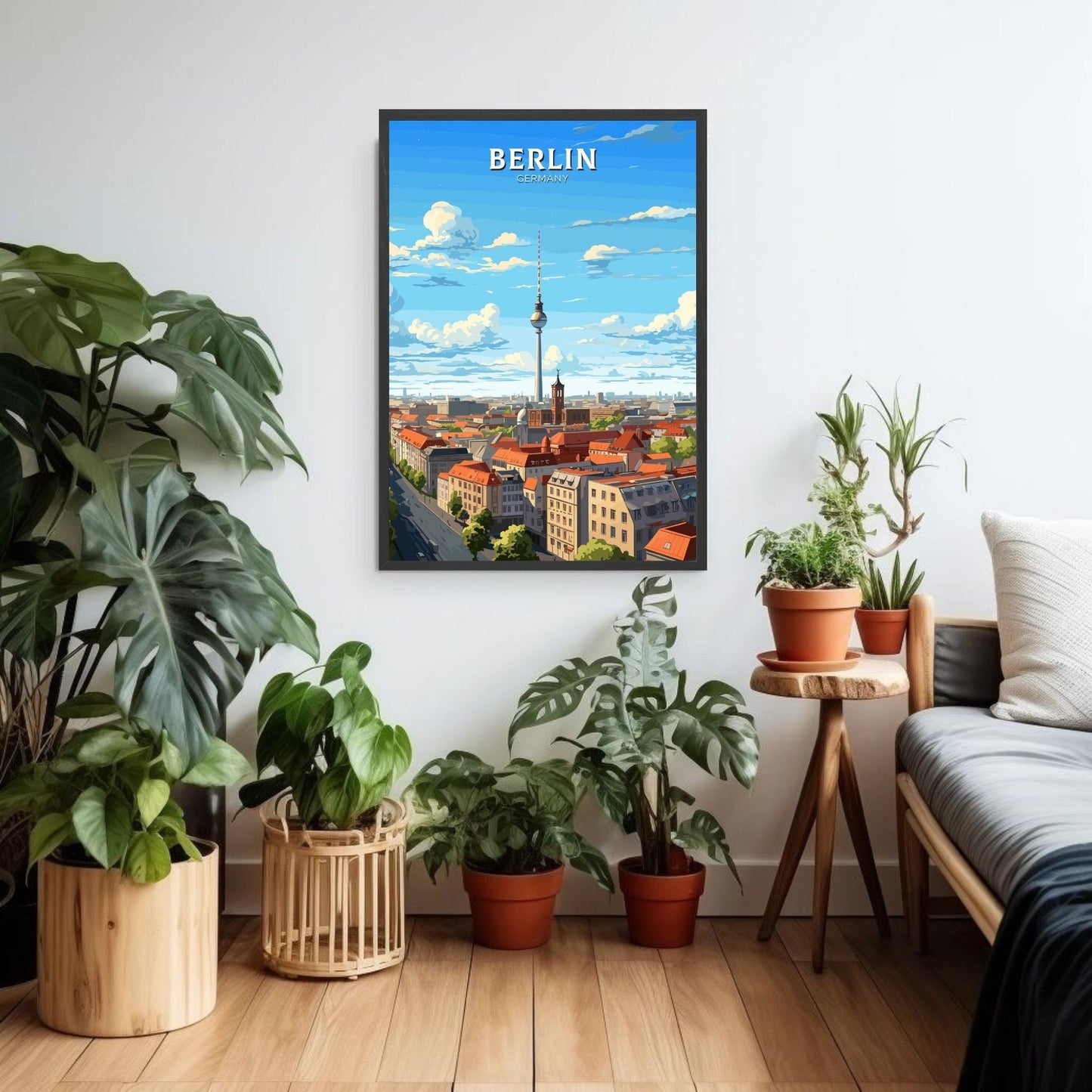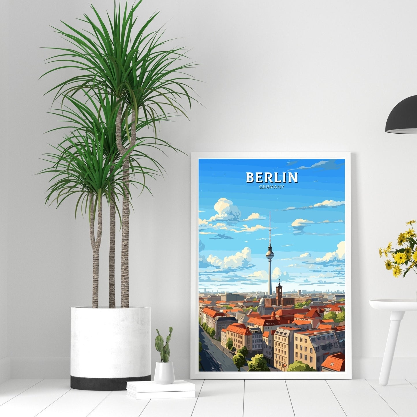 Ajoutez une touche culturelle audacieuse à votre espace avec cette affiche Berlin Travel Wallart , une affiche allemande qui capture l'énergie et l'élégance de la capitale. Mettant en vedette les monuments les plus emblématiques de Berlin, comme la porte de Brandebourg et la tour de télévision, cette œuvre allie modernité et charme historique.