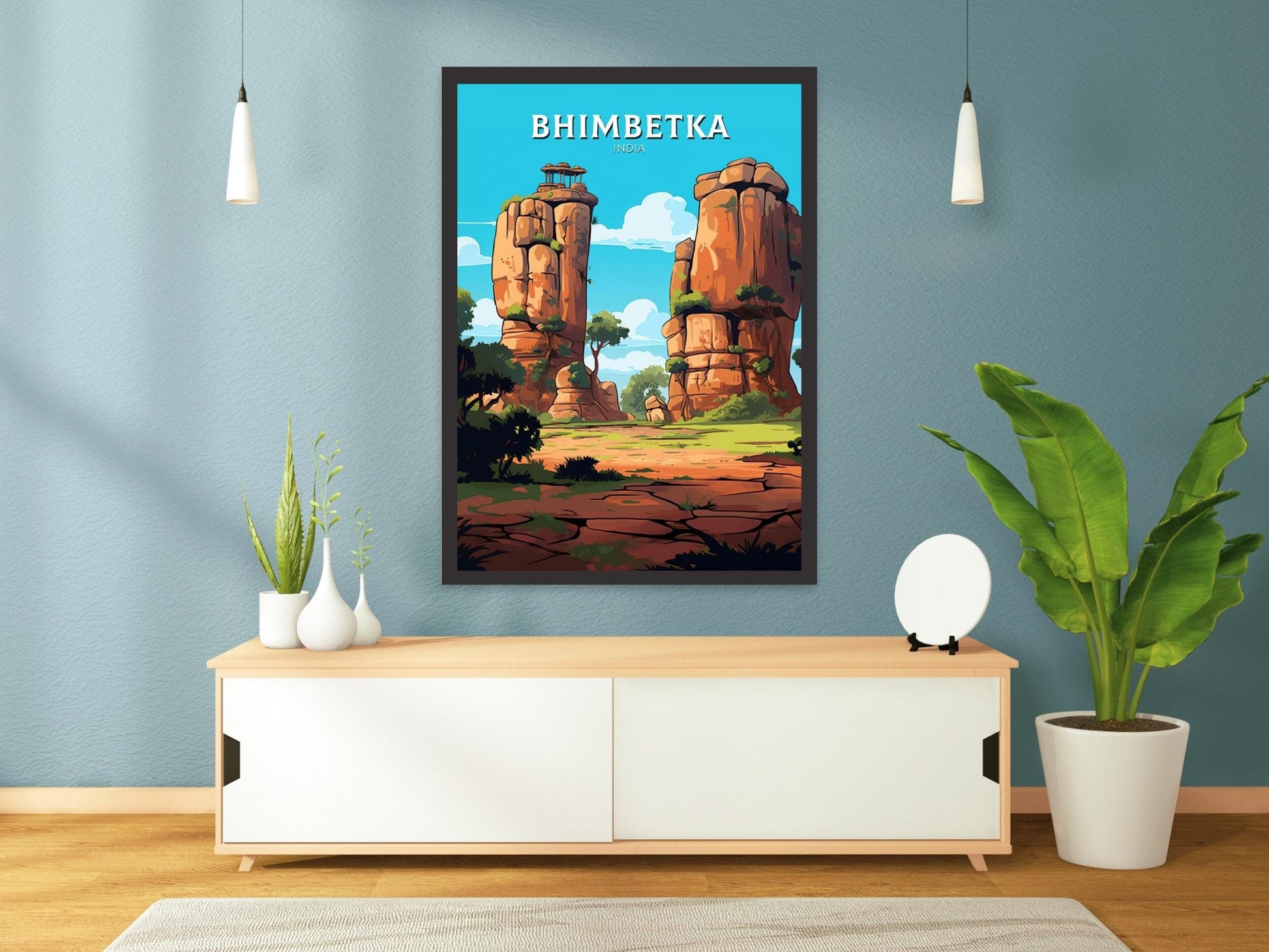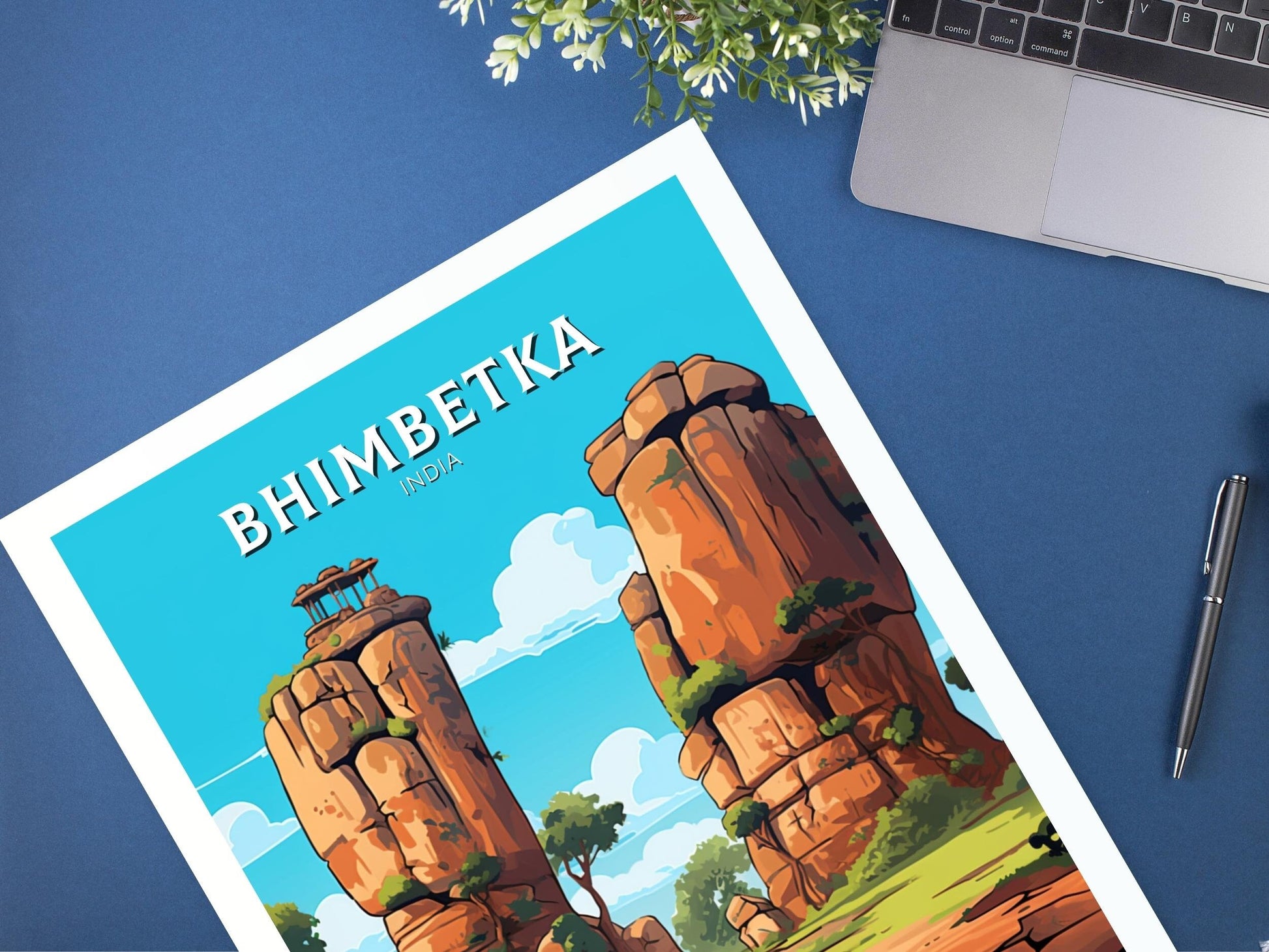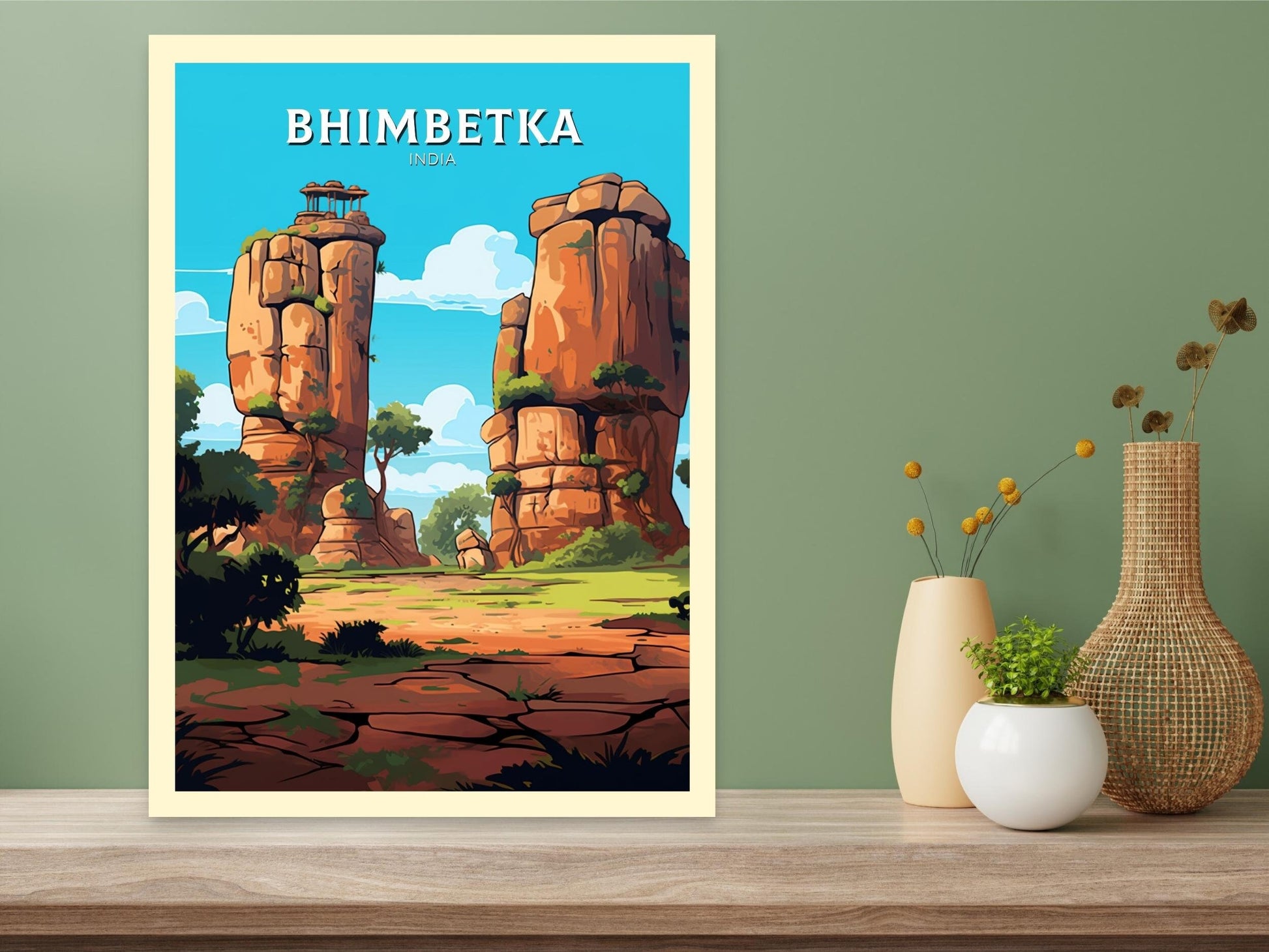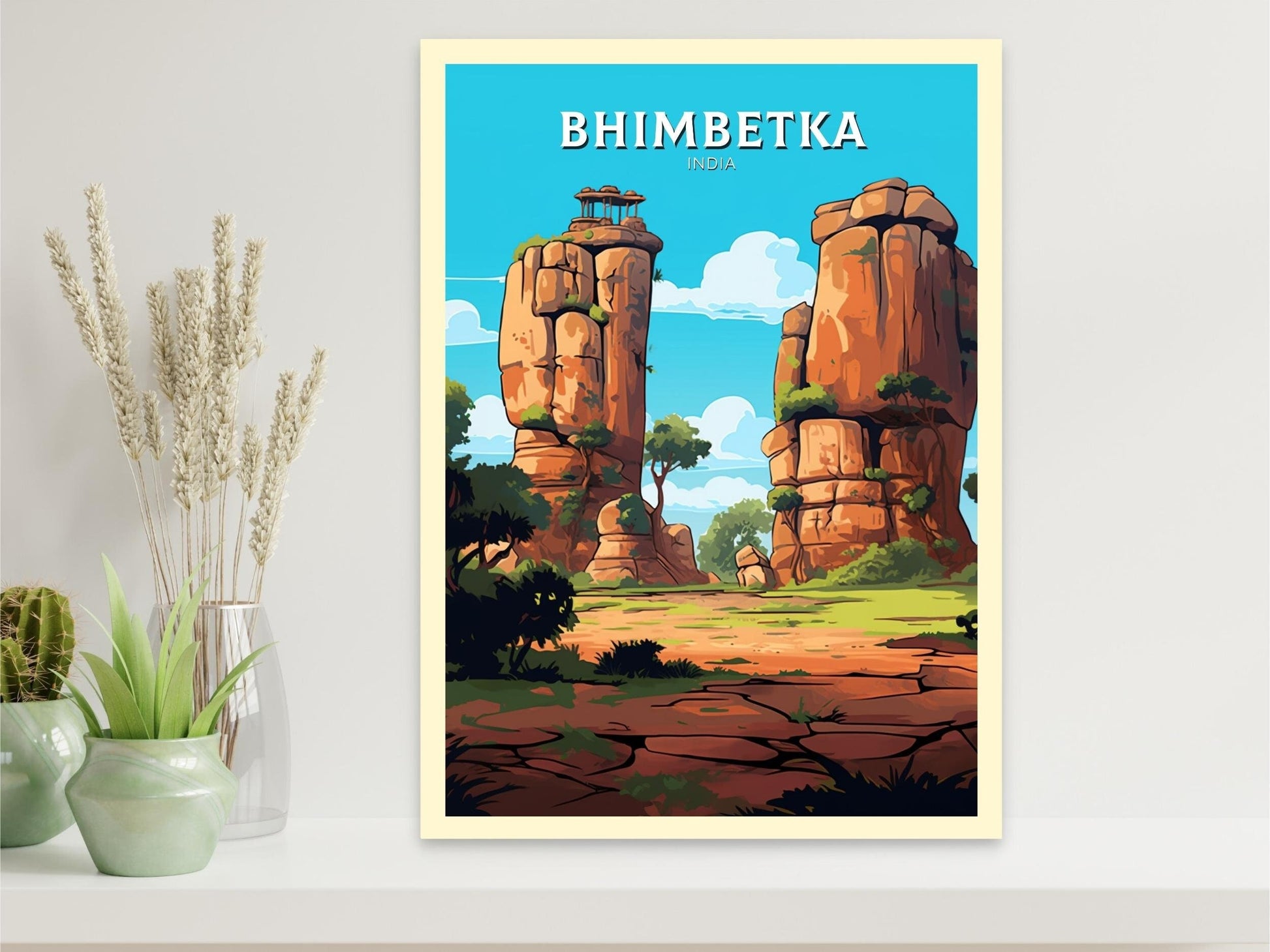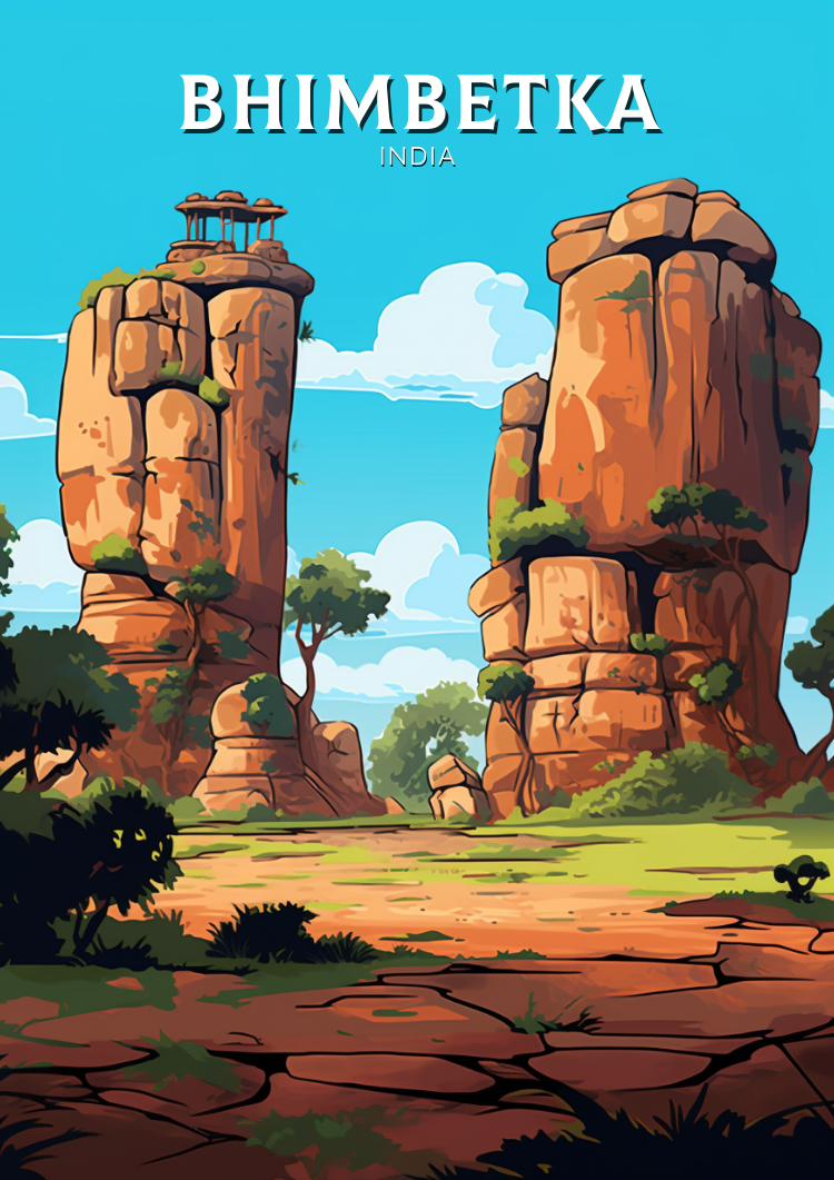 Notre affiche de voyage Bhimbetka - Retro India Art vous transporte dans les merveilles ancestrales des abris sous roche de Bhimbetka, en Inde, grâce à son design vibrant. Idéale pour les passionnés de voyages et d'art, elle capture les peintures rupestres préhistoriques et les grottes escarpées avec un détail saisissant. Que vous ayez exploré son histoire ou rêvé de son passé, cette affiche rétro Bhimbetka sera un ajout remarquable à votre décoration.