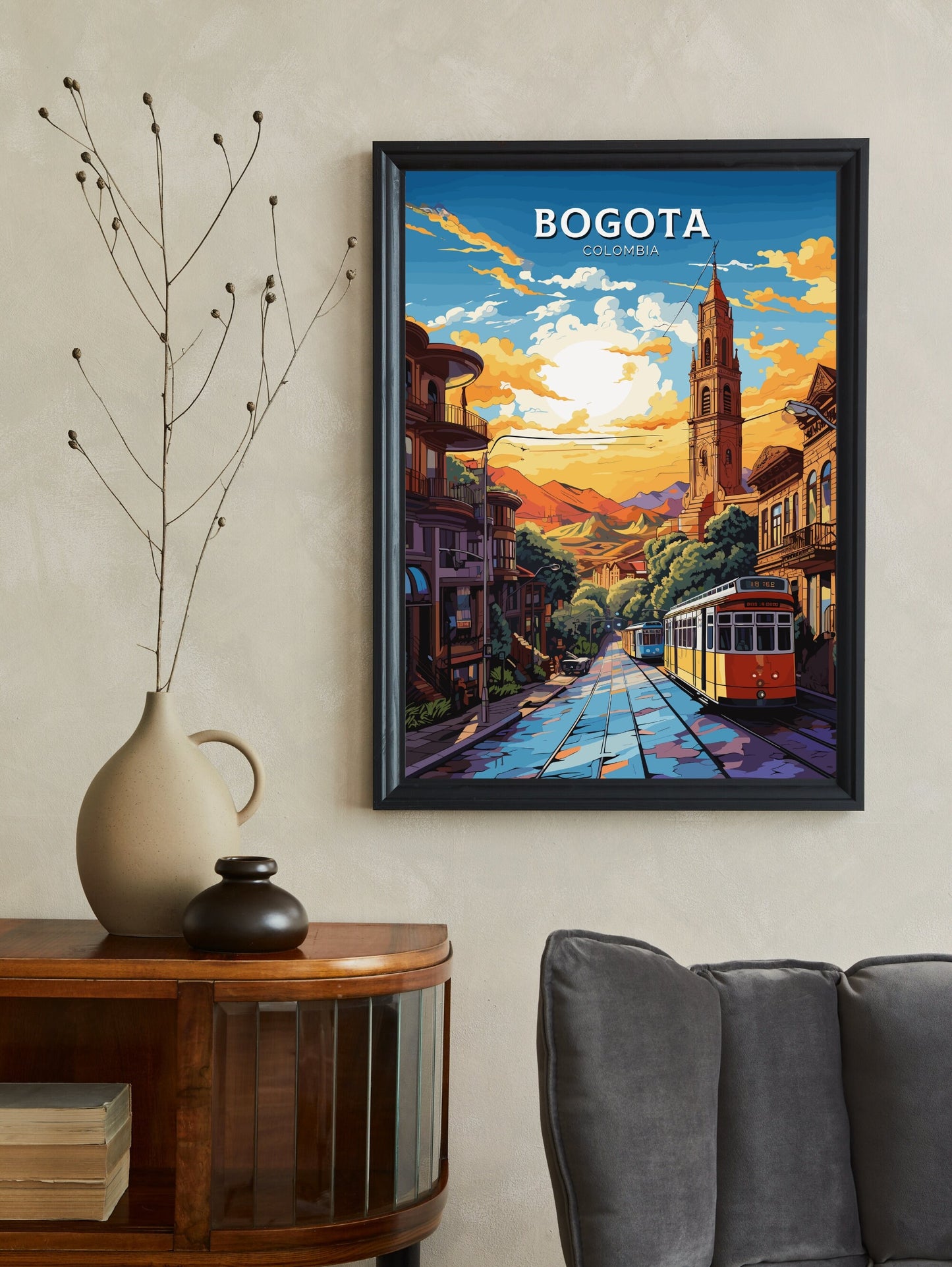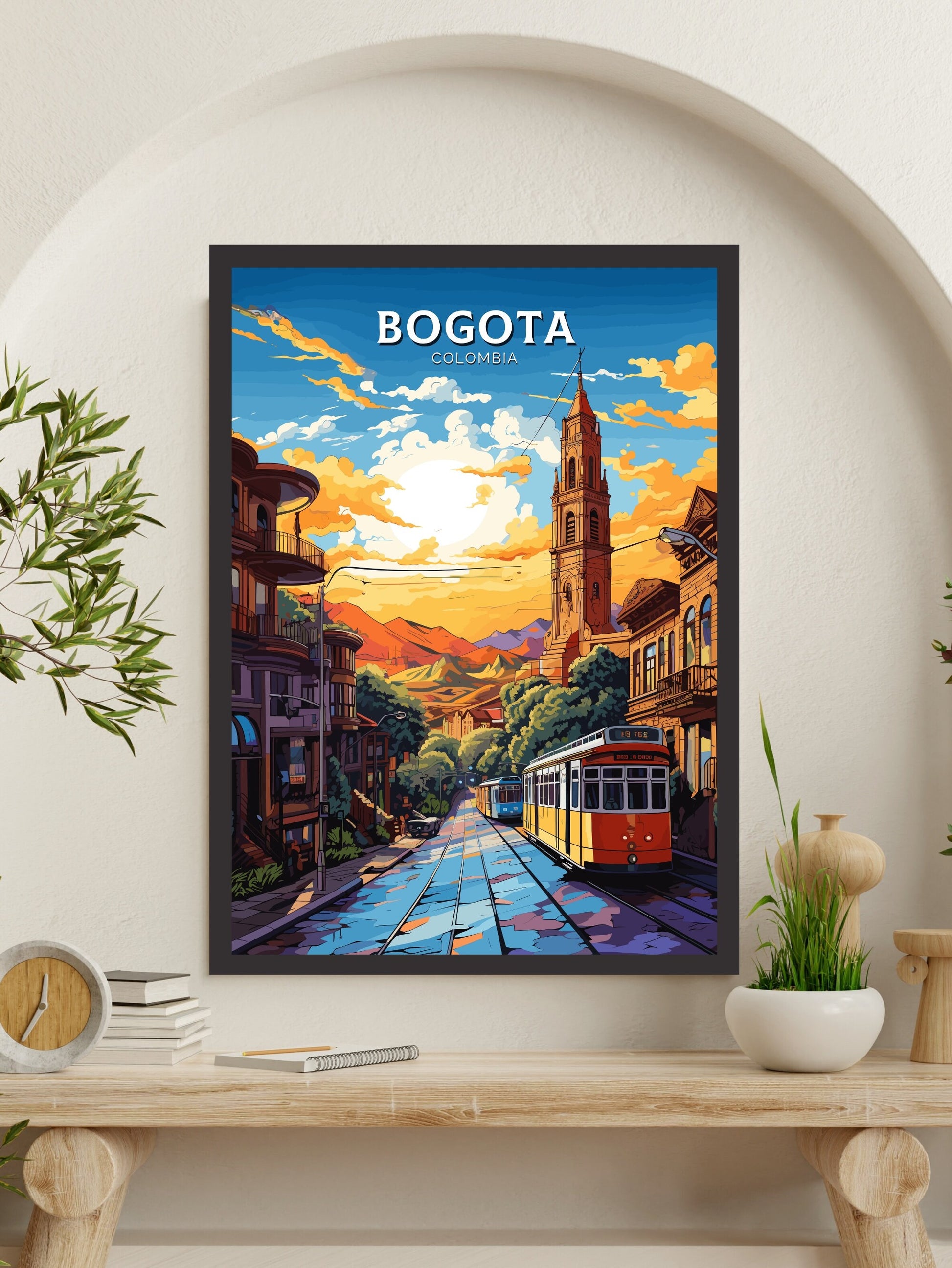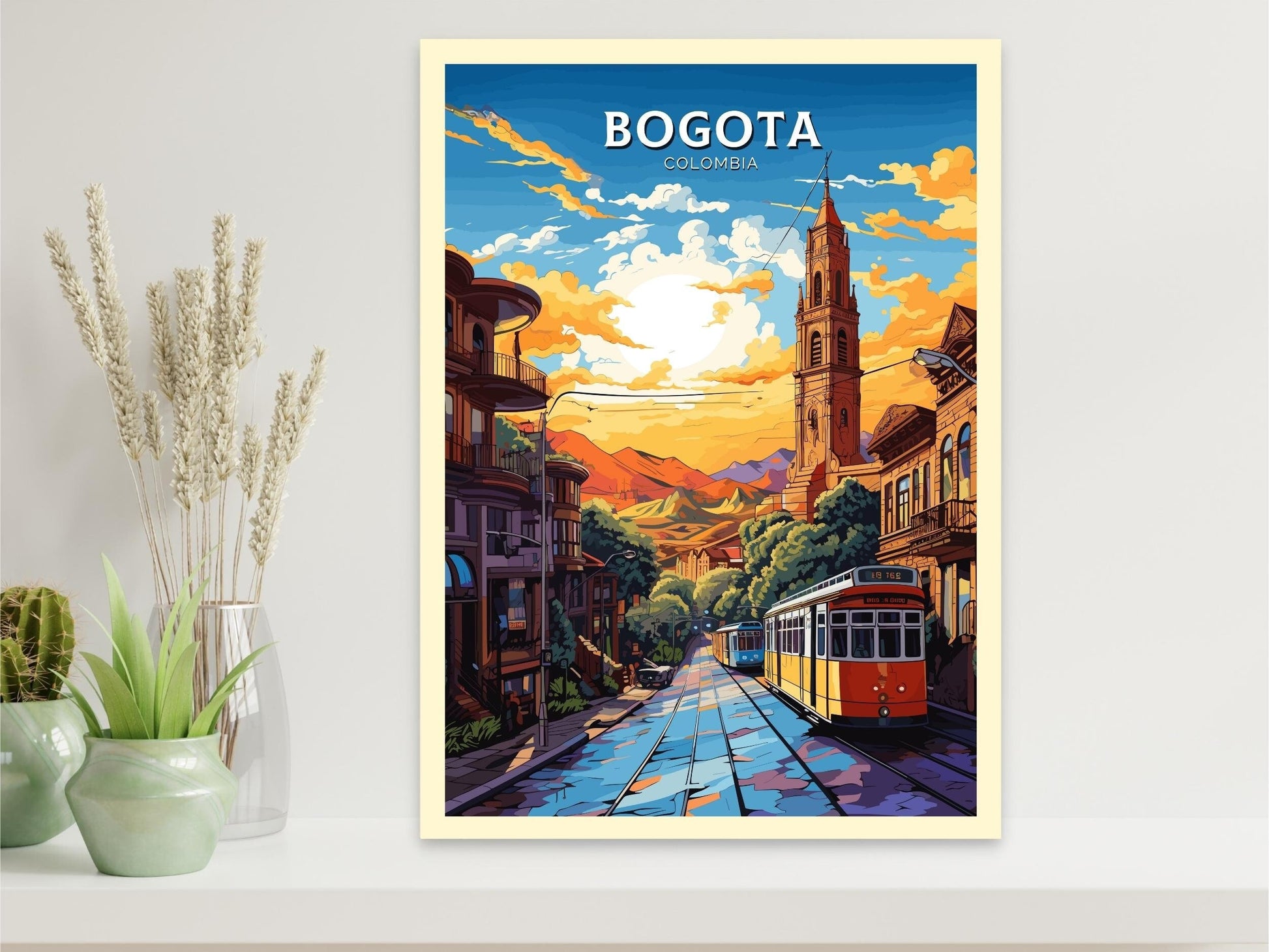 Cette affiche représentant le paysage urbain colombien donne vie à l'énergie du centre-ville de Bogotá. Les vues imprenables sur l'horizon, entouré de montagnes verdoyantes, créent un paysage dynamique qui vous transportera au cœur de la Colombie.