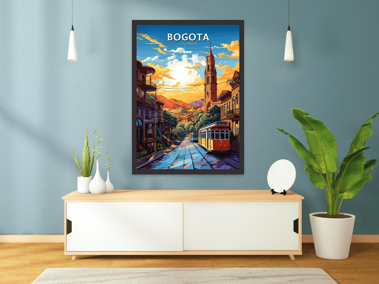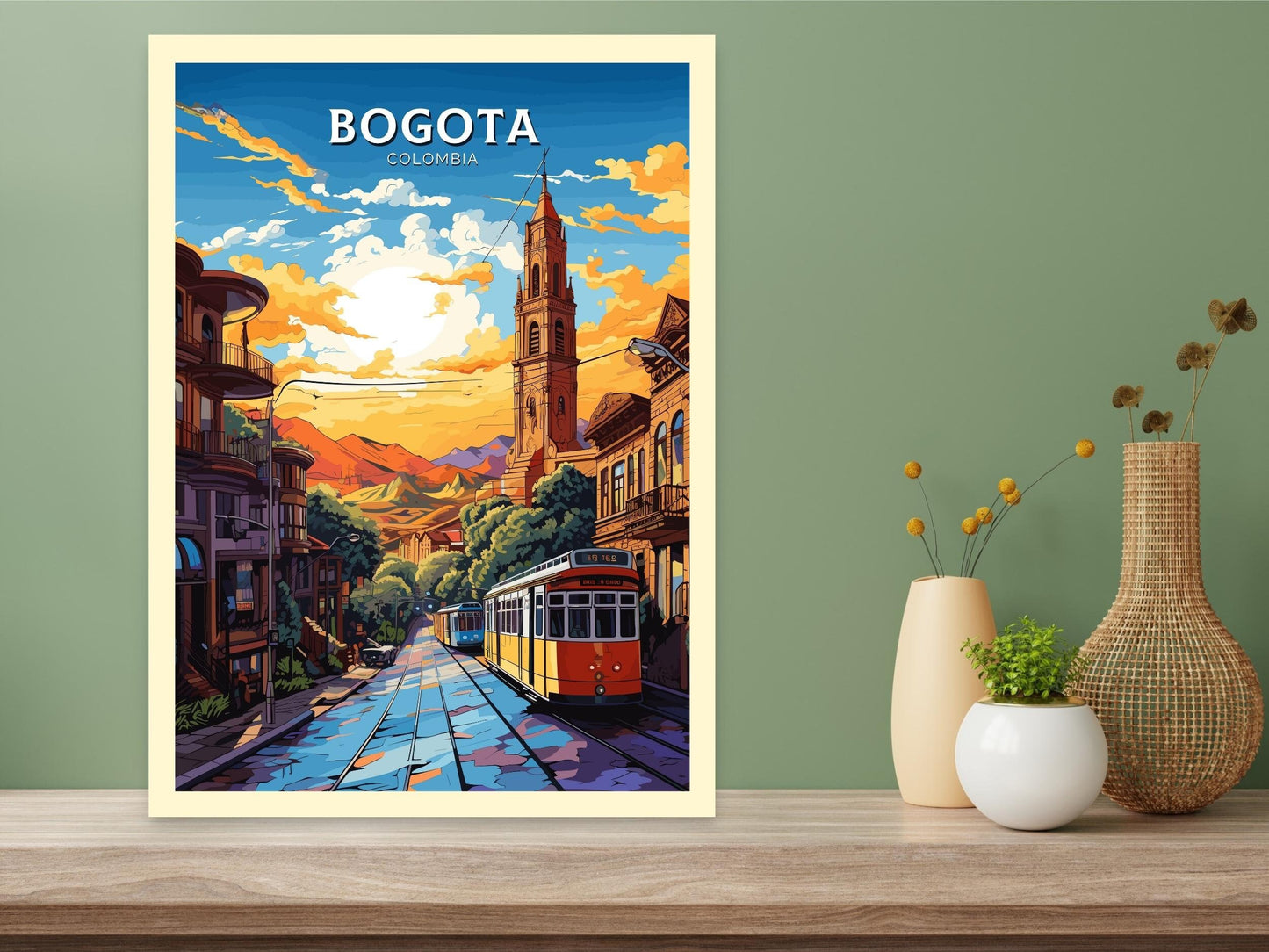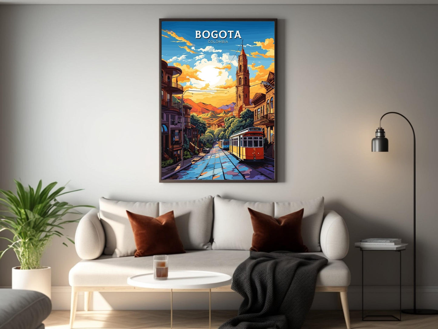 Cette affiche représentant le paysage urbain colombien donne vie à l'énergie du centre-ville de Bogotá. Les vues imprenables sur l'horizon, entouré de montagnes verdoyantes, créent un paysage dynamique qui vous transportera au cœur de la Colombie.