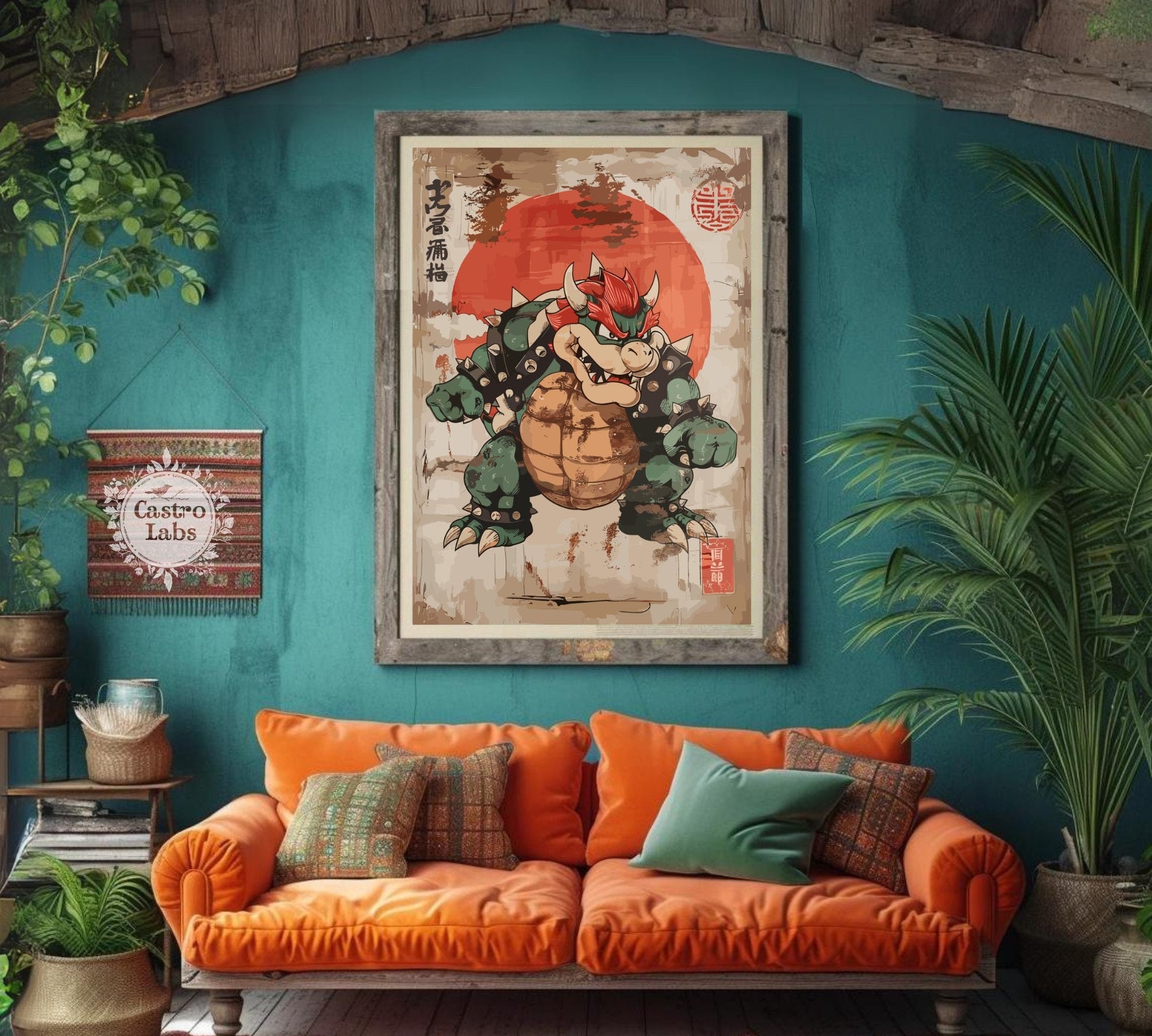 Insufflez une touche rétro gaming à vos murs avec l' affiche Bowser . Inspirée des dessins animés japonais, cette affiche met en scène le méchant emblématique Bowser dans un style animé vintage et vibrant, parfait pour apporter une touche ludique et nostalgique à votre chambre, salle de jeux ou espace dédié à la culture pop.