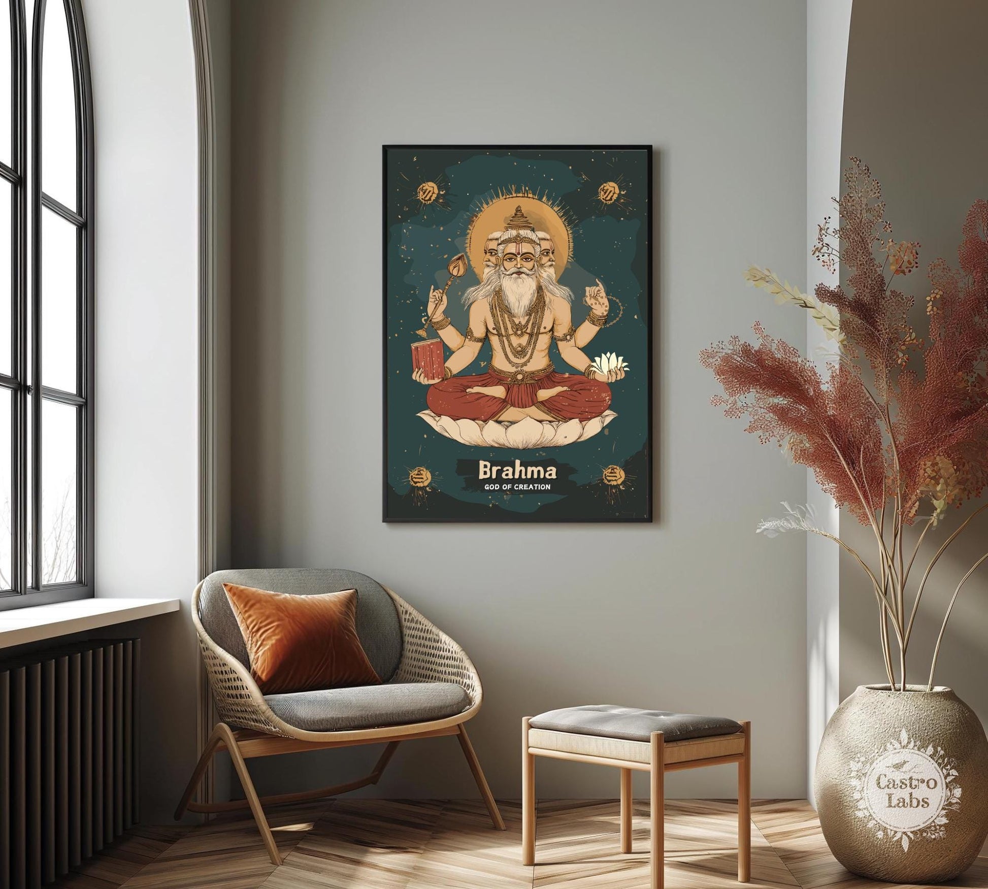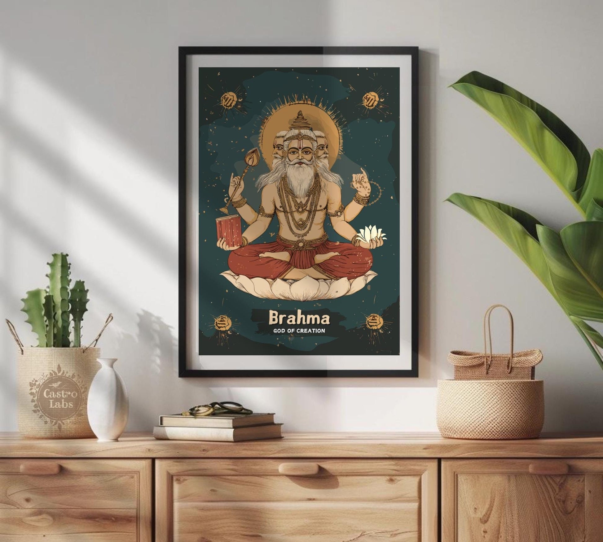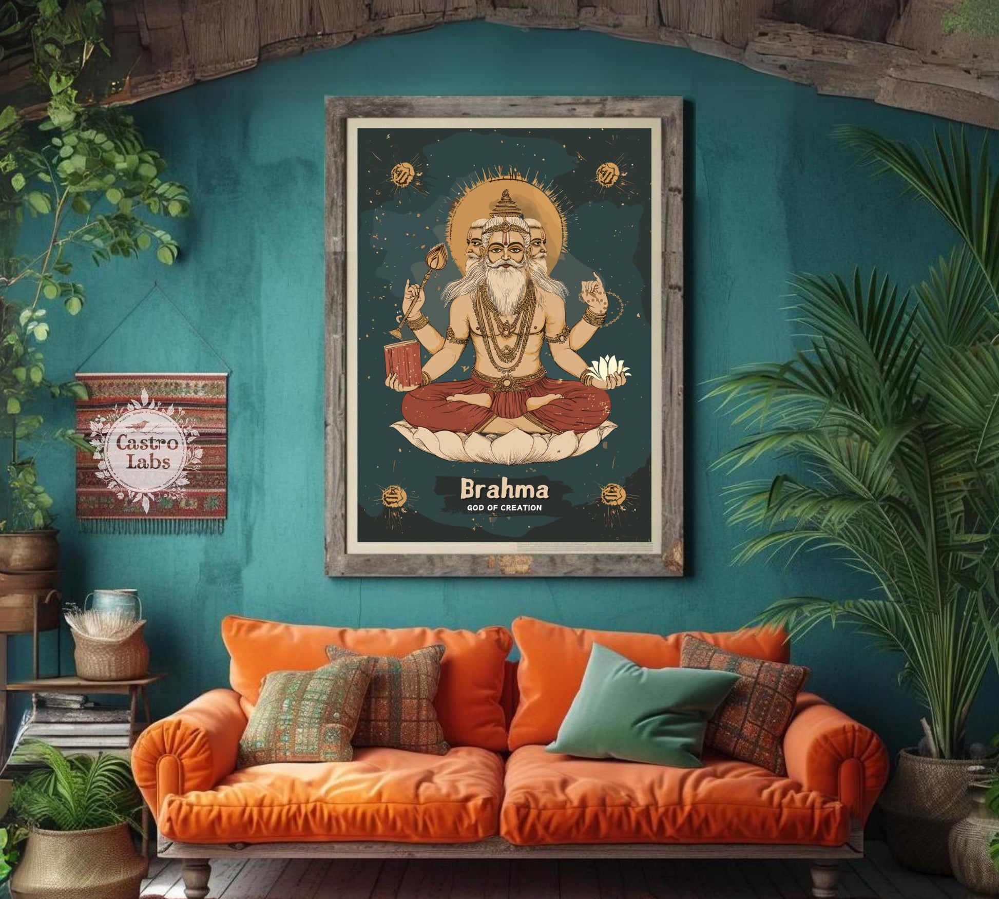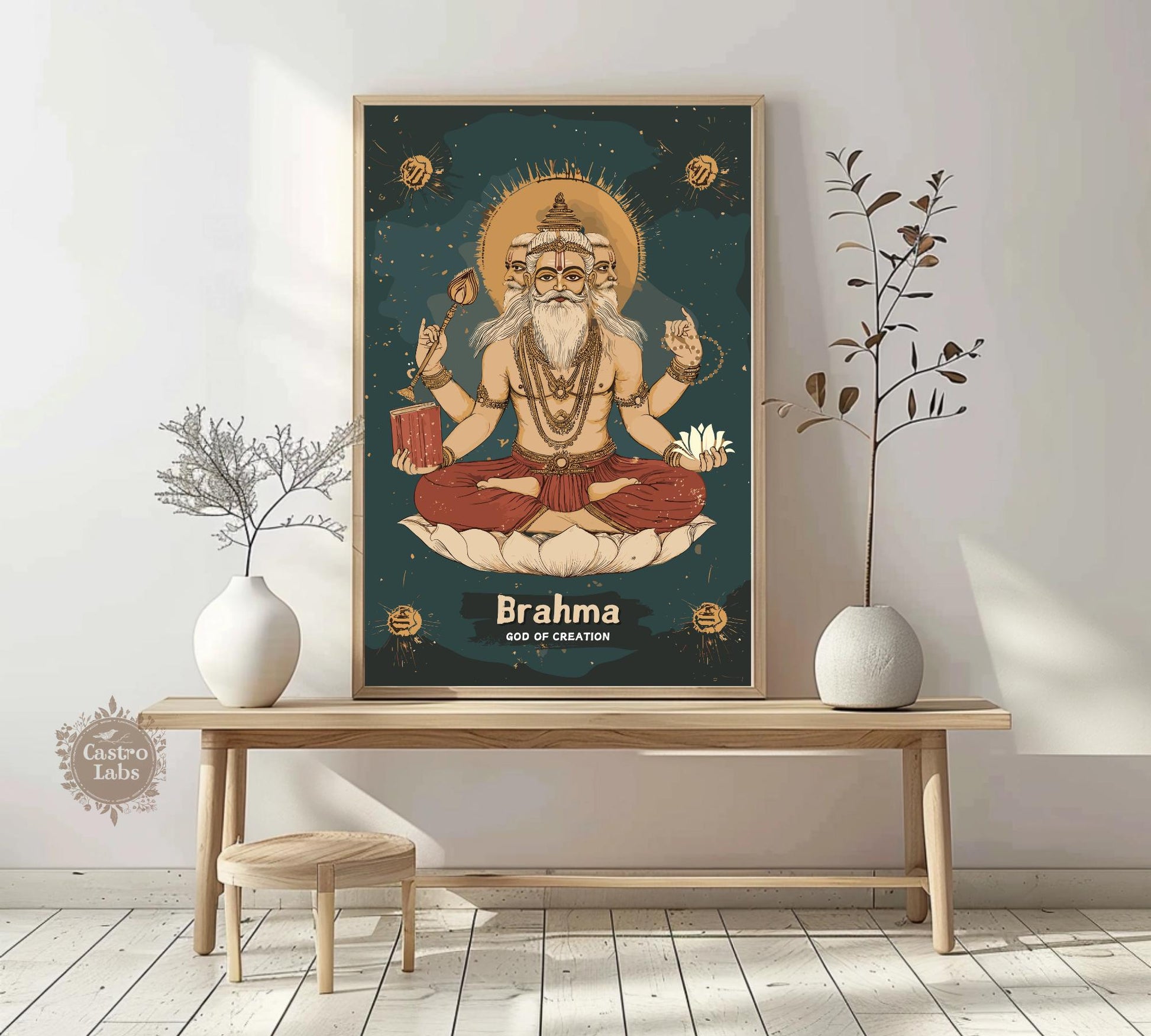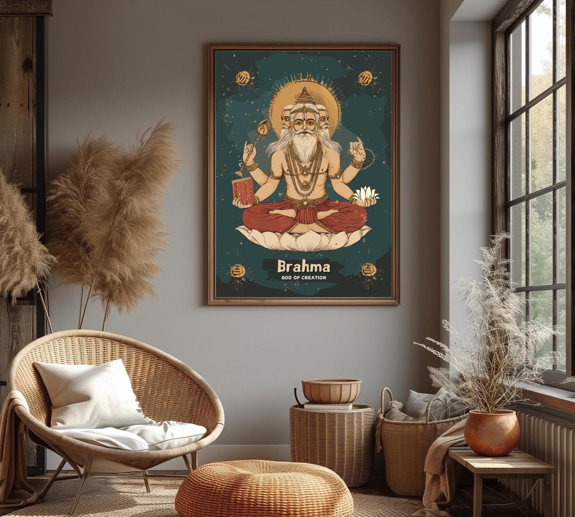 Notre affiche murale Brahma, représentant le dieu hindou de la création, imprègne votre espace de la création divine grâce à son design majestueux. Parfaite pour les passionnés de mythologie et les personnes en quête spirituelle, elle représente Brahma, le dieu hindou de la création, avec ses quatre visages rayonnant de sagesse cosmique. Que vous vénériez son essence ou que vous aimiez l'art sacré, cette affiche Brahma apportera une touche d'élégance à votre décoration.