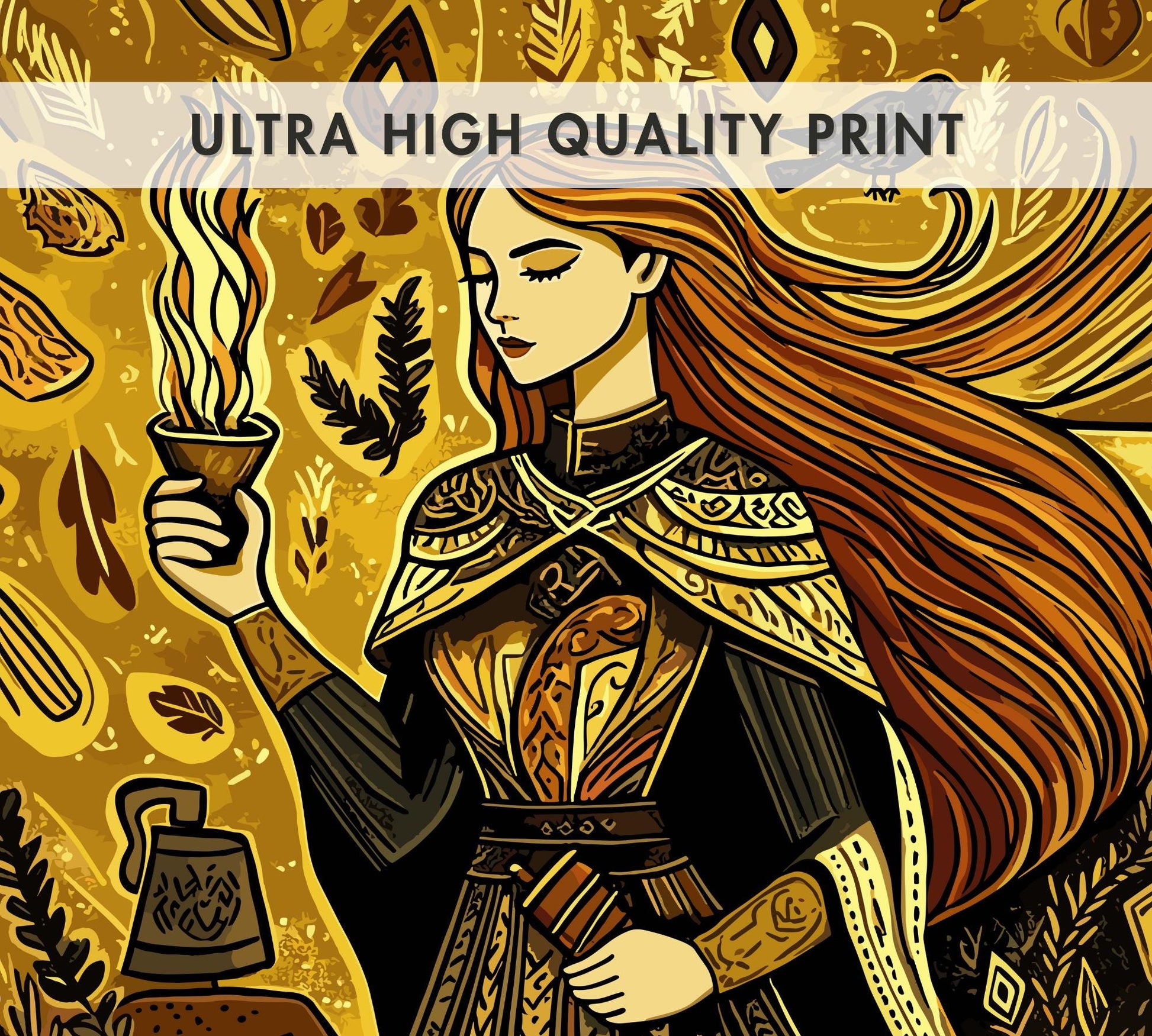 Réalisée sur un papier durable et de haute qualité, cette œuvre d'art mythologique celtique incarne son pouvoir sacré. Idéale pour les amateurs de mythes ou ceux qui recherchent une flamme murale mystique, elle est une étincelle de l'esprit de Brigid.