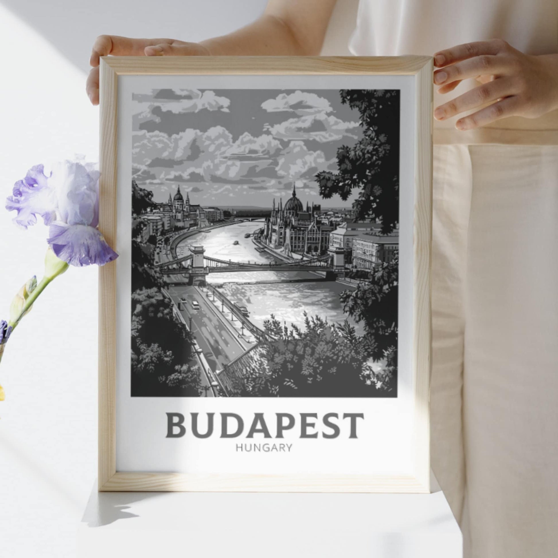 Capturez l'élégance intemporelle de la capitale hongroise avec cette affiche de voyage noir et blanc de Budapest . Représentée dans un monochrome saisissant, elle apporte une touche sophistiquée à tout espace. Parfaite pour les amateurs d'art, les voyageurs ou ceux qui recherchent une décoration murale minimaliste.