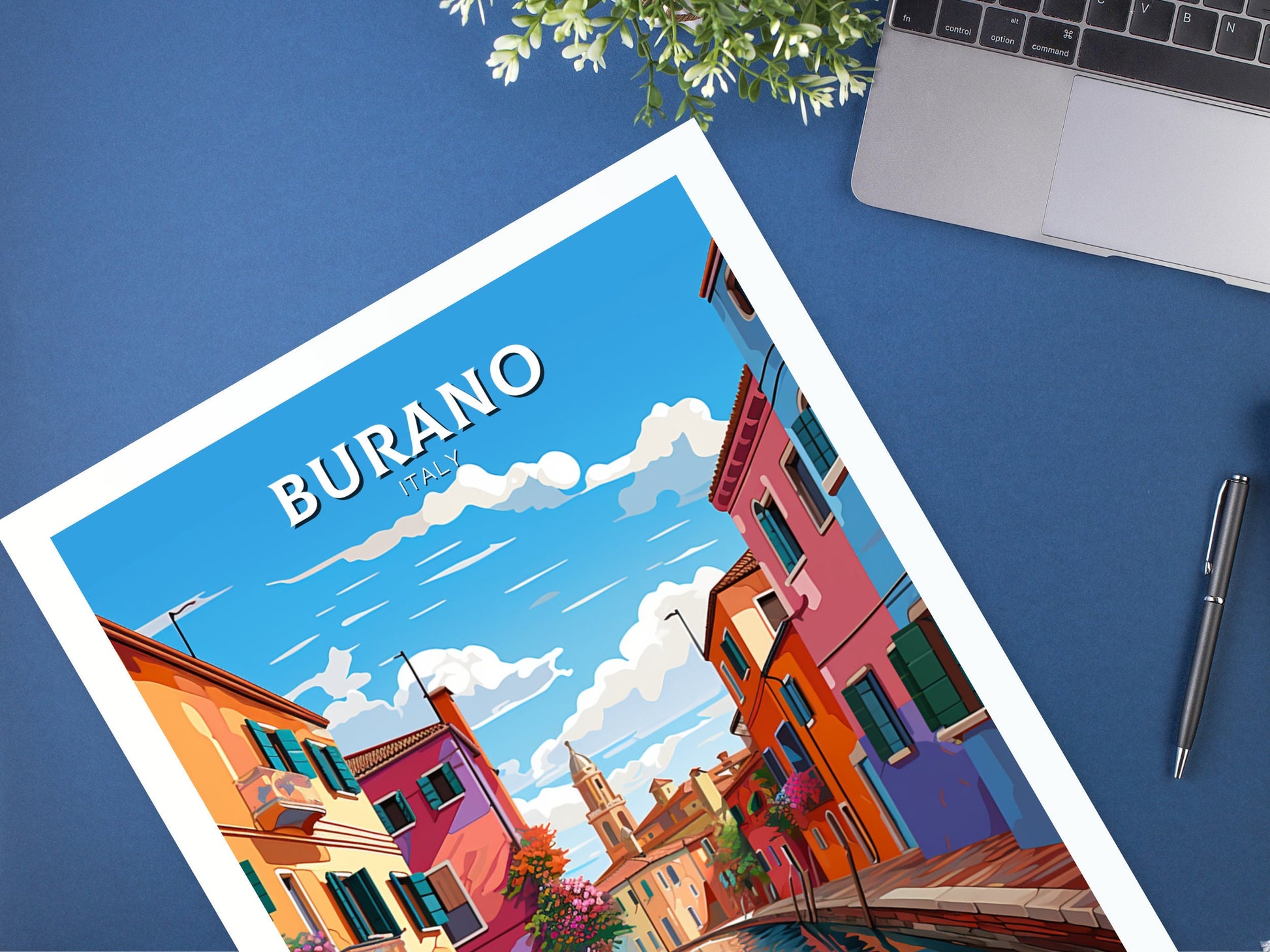 Célébrez le charme vibrant de l'Italie avec cette affiche de voyage colorée de Burano . Mettant en vedette les emblématiques maisons arc-en-ciel de Burano se reflétant le long des canaux paisibles, cette œuvre apporte l'atmosphère joyeuse de l'île et le charme vénitien directement sur vos murs.