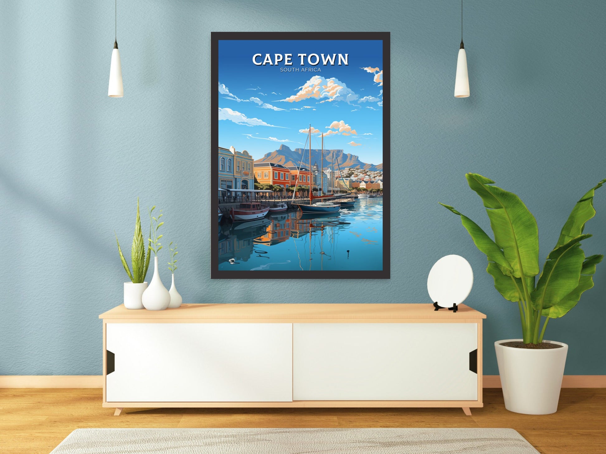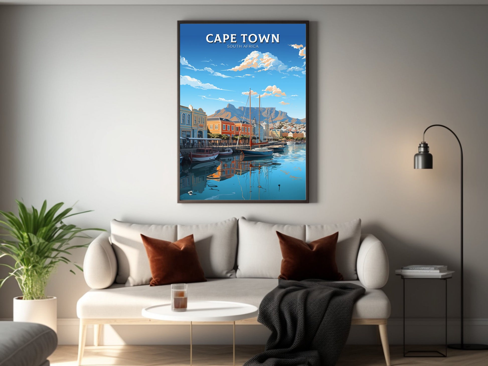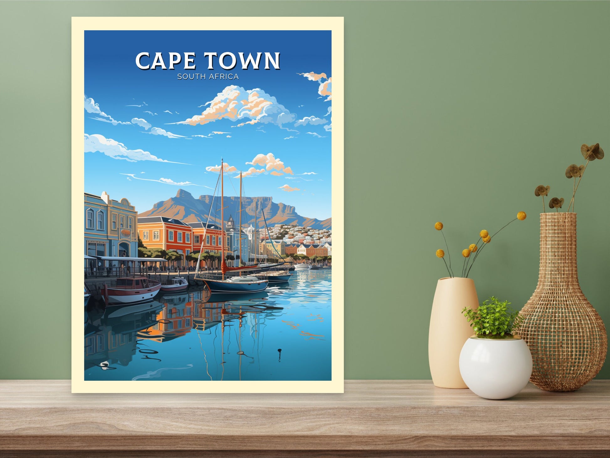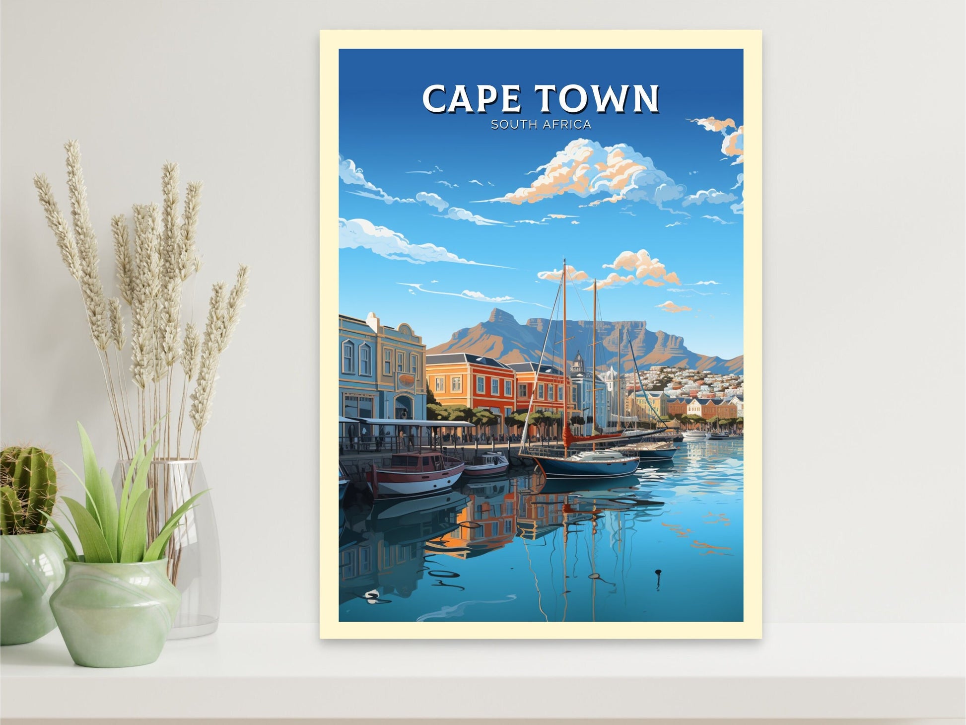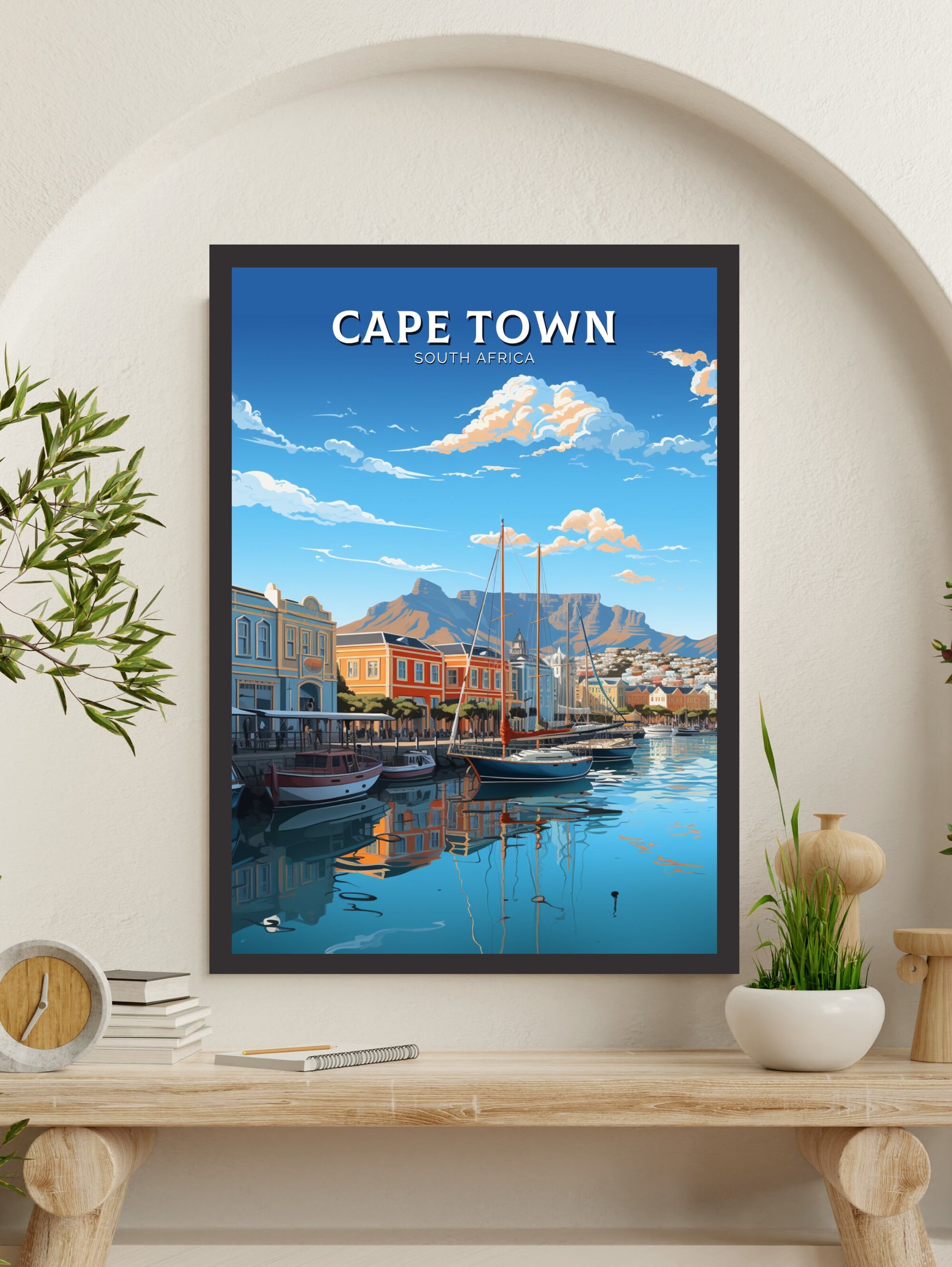 Notre affiche de voyage du Cap – Art rétro d'Afrique du Sud – plonge votre intérieur dans le charme vibrant du Cap, en Afrique du Sud, grâce à son design nostalgique. Idéale pour les passionnés de voyages et les amateurs d'art rétro, elle capture la montagne de la Table et le Bo-Kaap coloré dans un style intemporel. Que vous ayez exploré ses rues ou rêvé de sa beauté, cette affiche rétro du Cap sera un ajout magnifique à votre décoration.