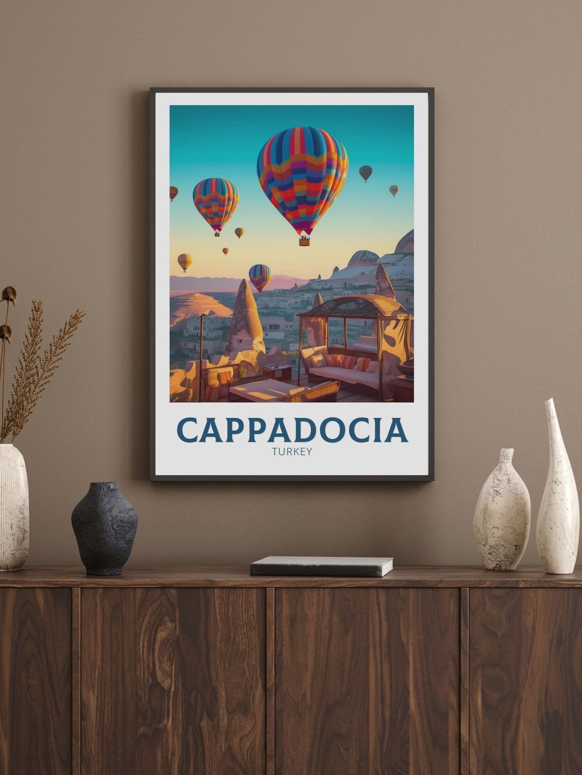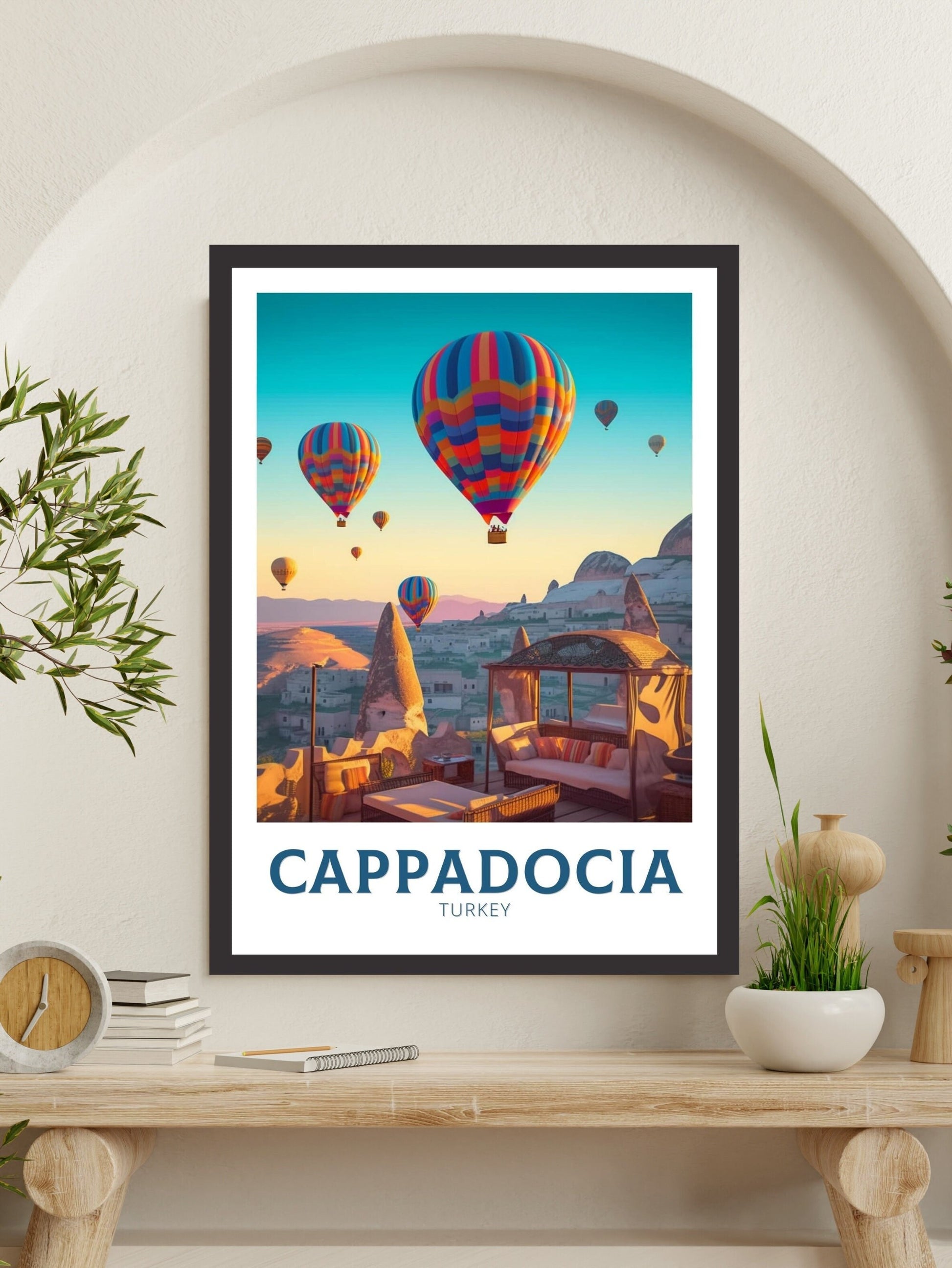 Capturez la beauté surréaliste de cette région emblématique de Turquie avec cette affiche de voyage en Cappadoce . Avec ses montgolfières oniriques survolant des cheminées de fées et des paysages escarpés, cette œuvre apporte la magie de la Cappadoce à vos murs.