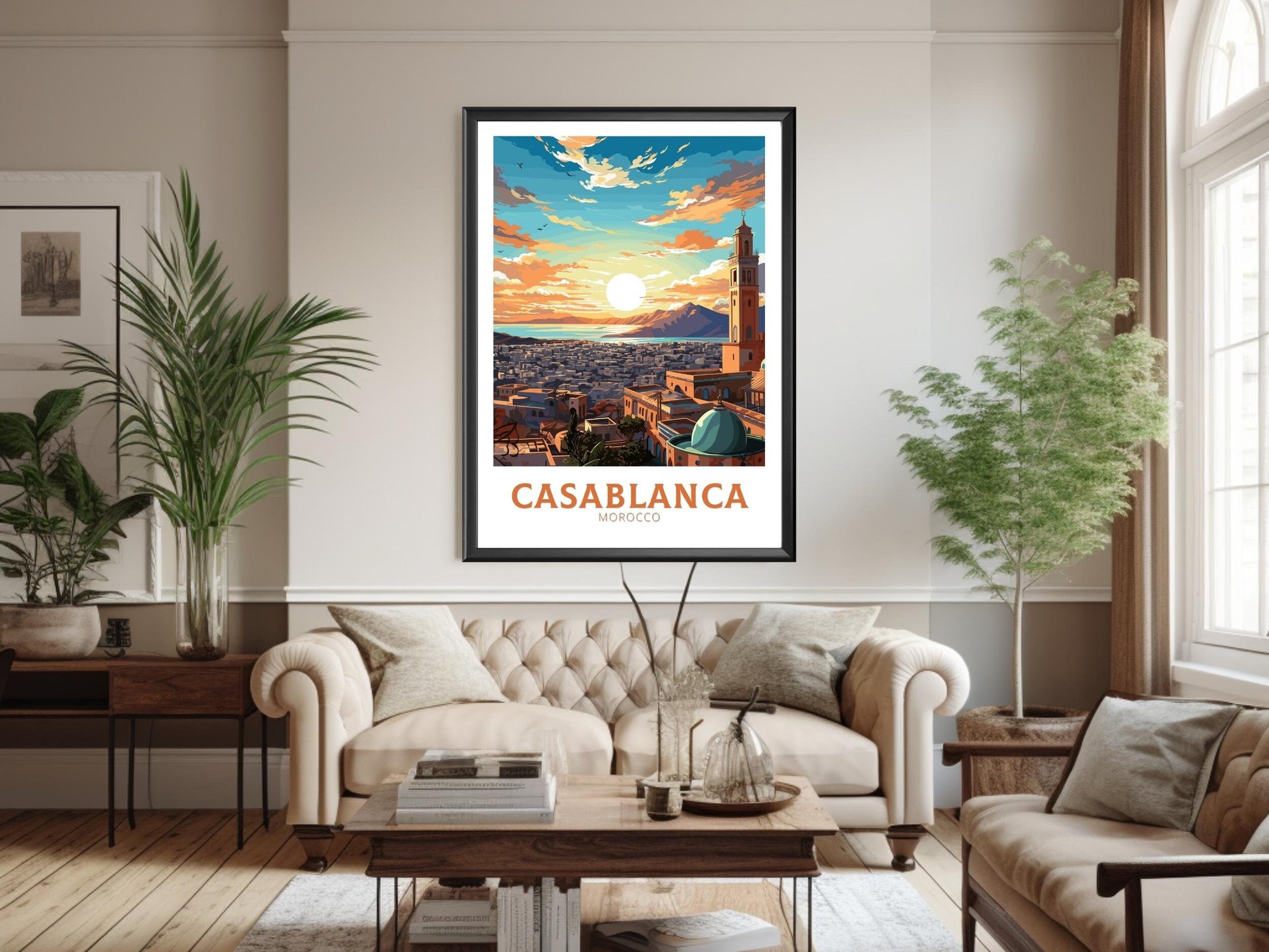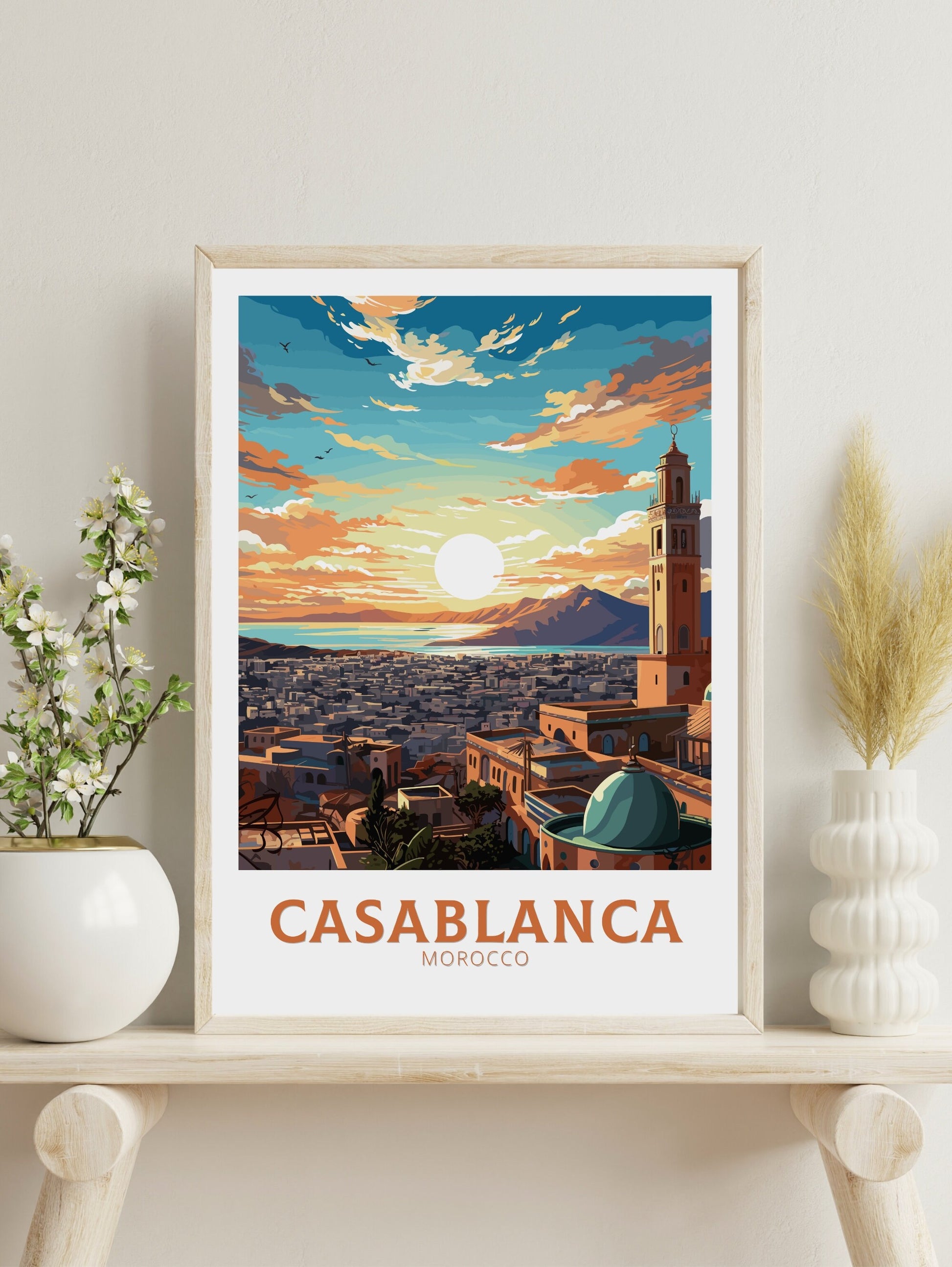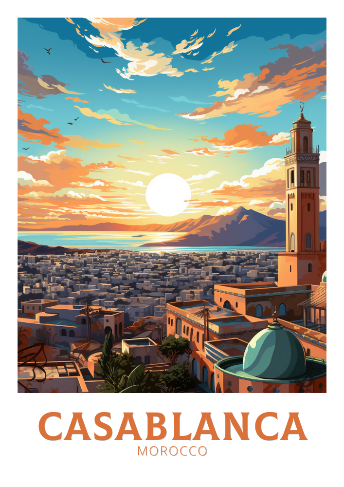 Notre affiche Casablanca rétro plonge votre intérieur dans le charme intemporel de Casablanca, au Maroc, grâce à son design nostalgique. Parfaite pour les passionnés de voyages et d'art rétro, elle capture la mosquée Hassan II et la médina animée dans un style classique. Que vous ayez arpenté ses rues ou rêvé de son charme, cette affiche Casablanca rétro sera un ajout remarquable à votre décoration.