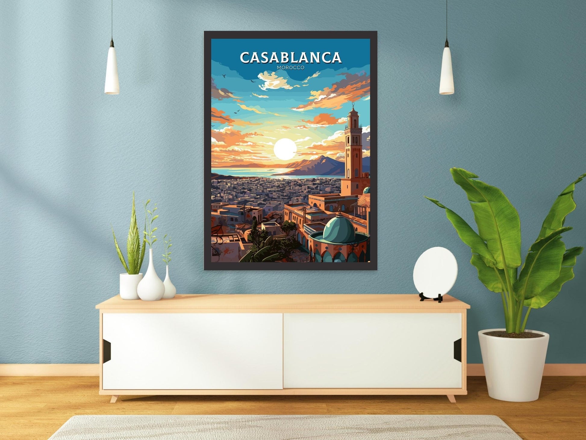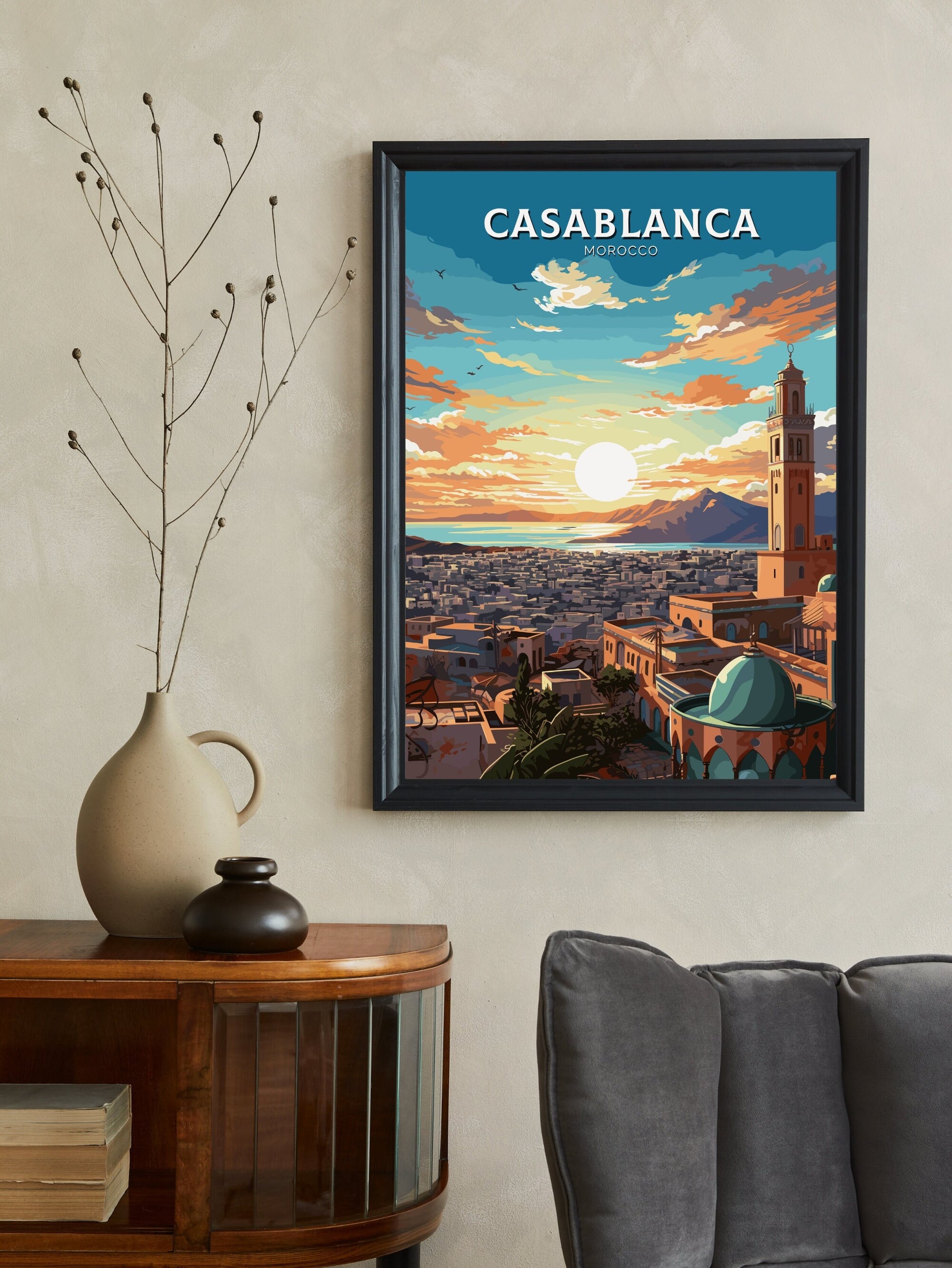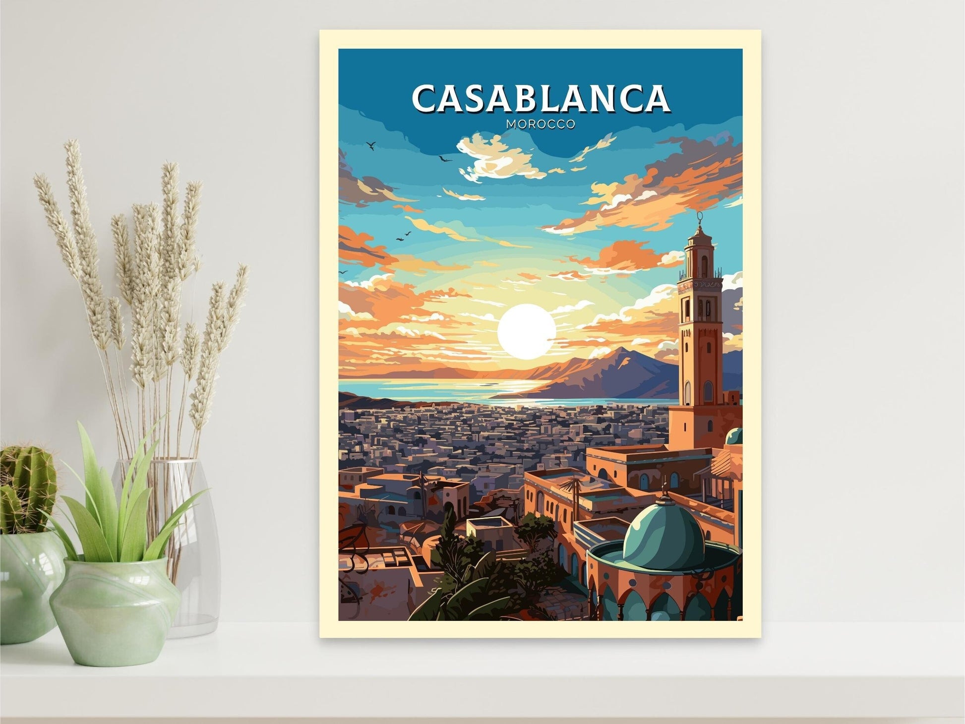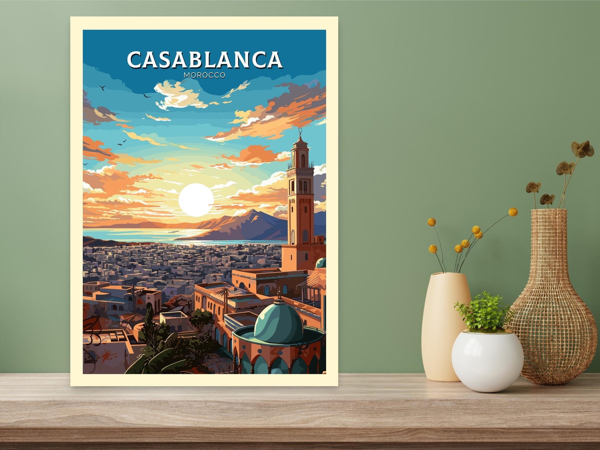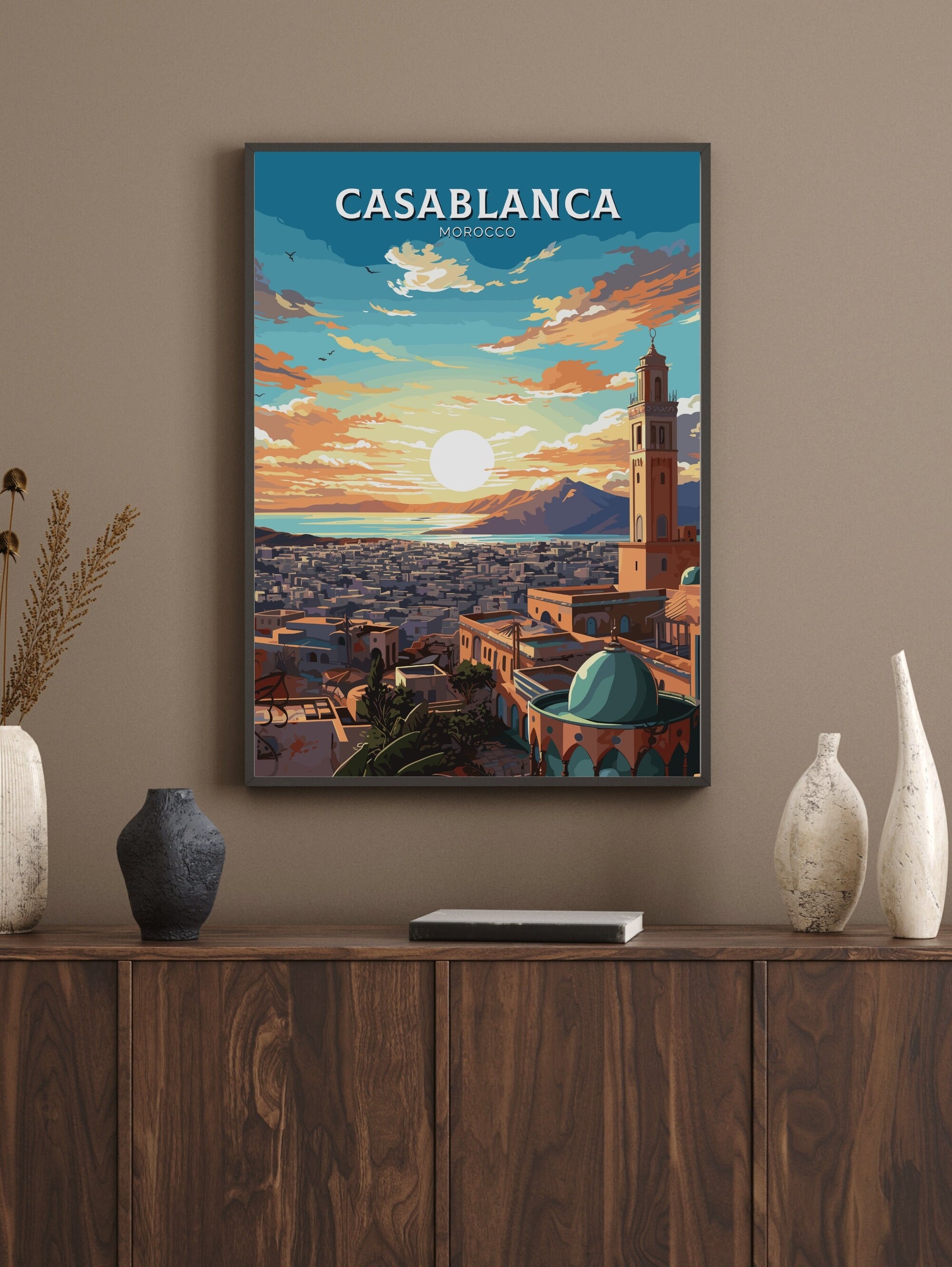 Notre affiche de voyage Casablanca – Art rétro marocain plonge votre intérieur dans le charme intemporel de Casablanca, au Maroc, grâce à son design nostalgique. Idéale pour les passionnés de voyages et d'art rétro, elle capture la mosquée Hassan II et la médina animée dans un style classique. Que vous ayez arpenté ses rues ou rêvé de son charme, cette affiche rétro Casablanca sera un atout déco exceptionnel.