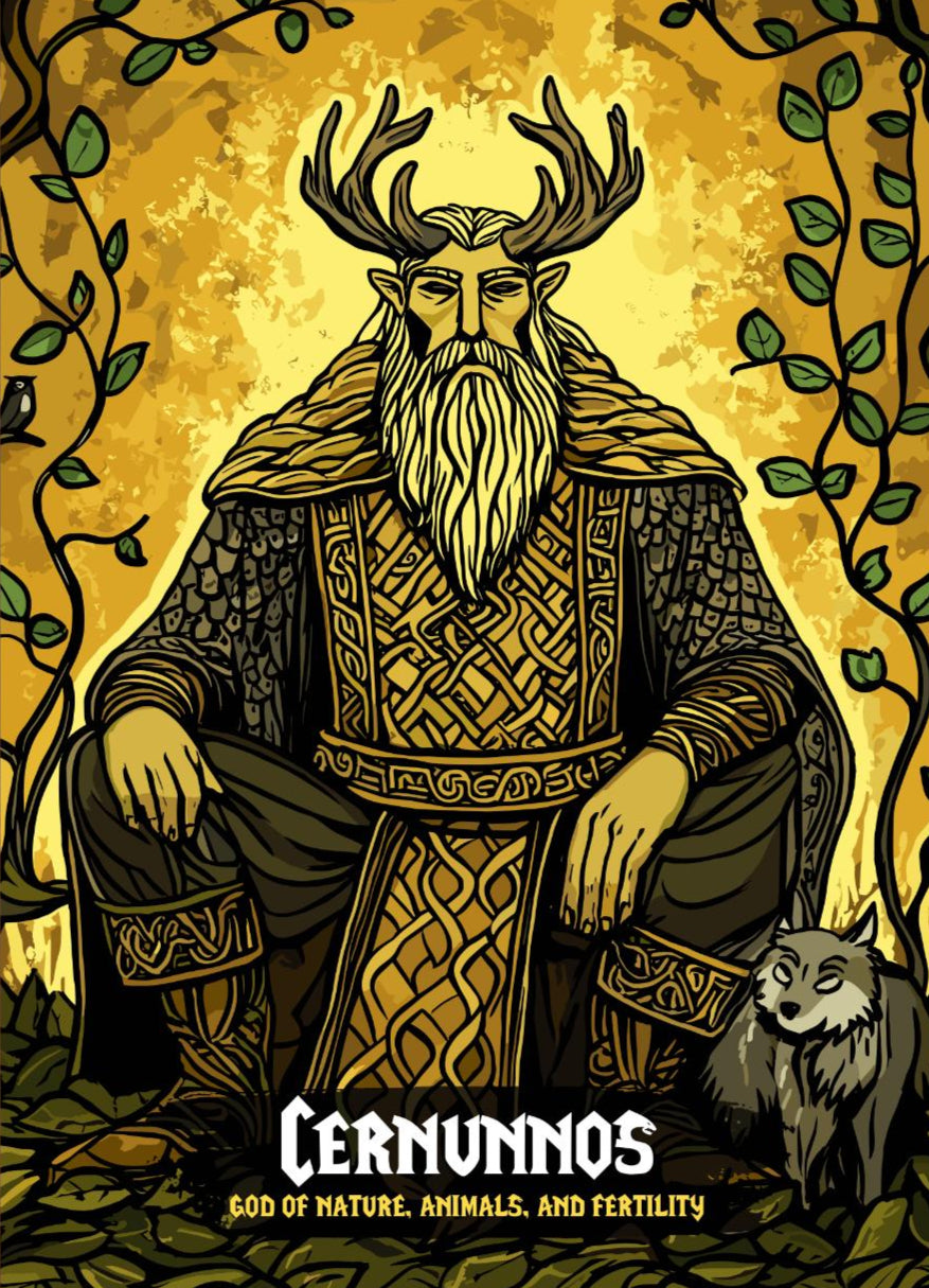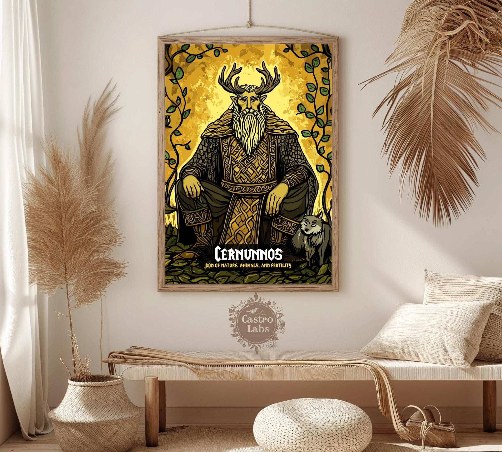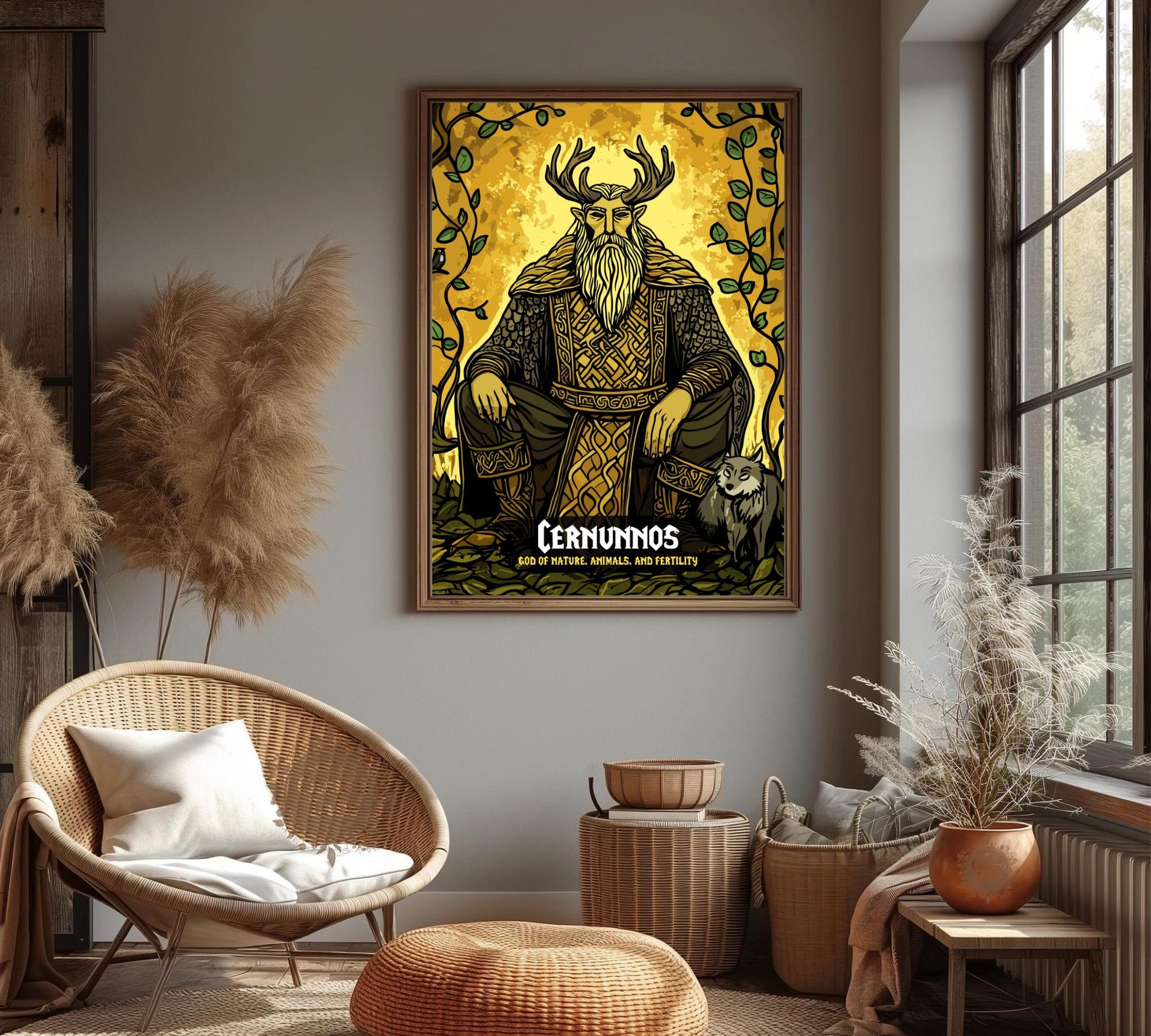 Des bois couronnent la silhouette sauvage de cette estampe du dieu Cernunnos , invoquant le dieu cornu celtique des profondeurs des forêts anciennes. Empreint des murmures indomptés du folklore celtique, il se prélasse au milieu des vignes, tel un seigneur des bêtes dont les yeux percent le voile des secrets de la nature.