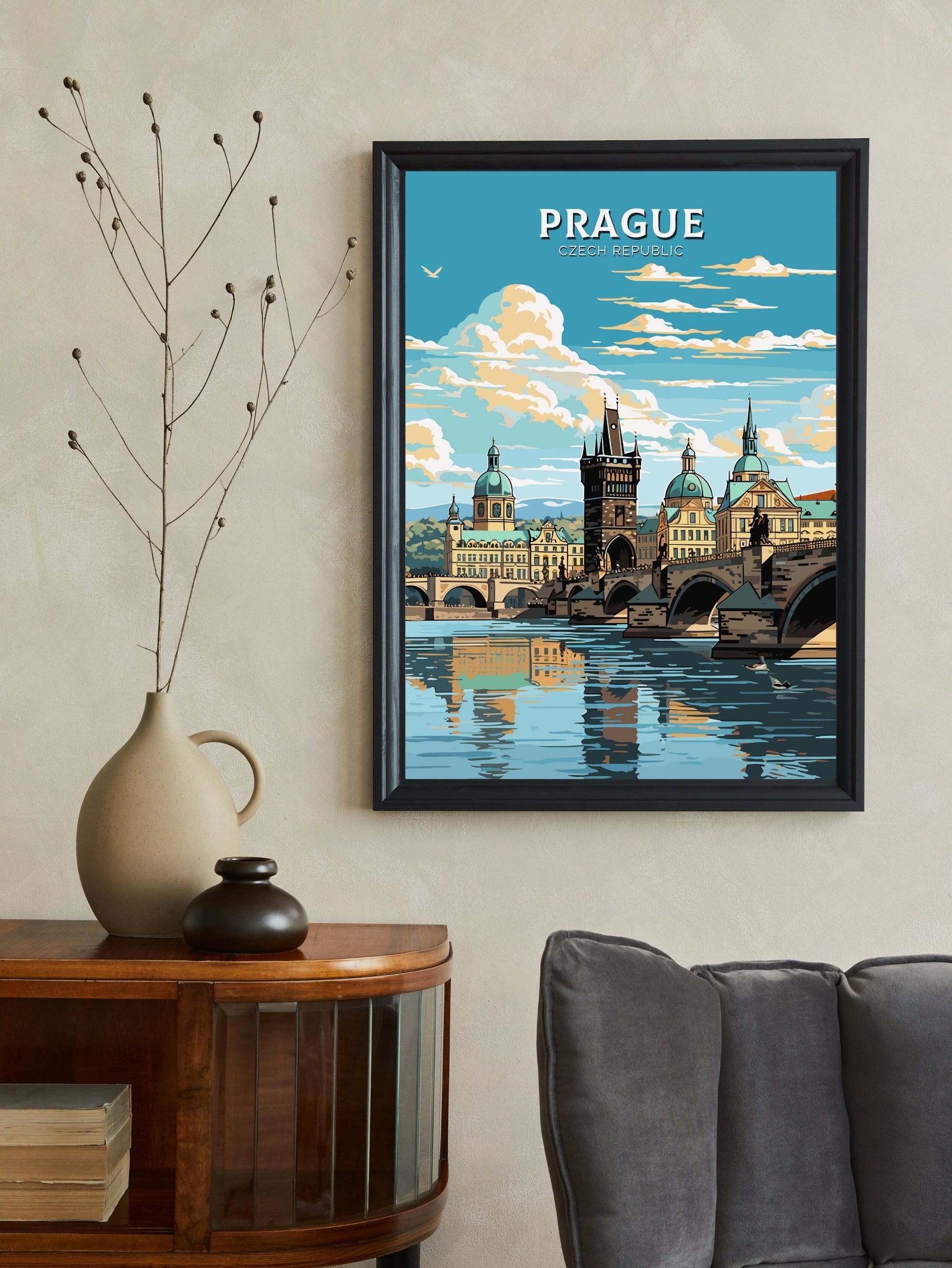 Plongez au cœur de Prague avec cette captivante affiche de voyage du pont Charles , hommage à l'un des monuments les plus précieux de la ville. Le pont Charles, qui enjambe la Vltava, est non seulement un passage historique incontournable, mais aussi un symbole intemporel du charme médiéval de Prague. Cette œuvre capture magnifiquement les emblématiques tours gothiques du pont, les statues qui bordent ses balustrades et la rivière paisible qui coule en contrebas, offrant un aperçu pittoresque du passé et du présent vibrants de la ville.