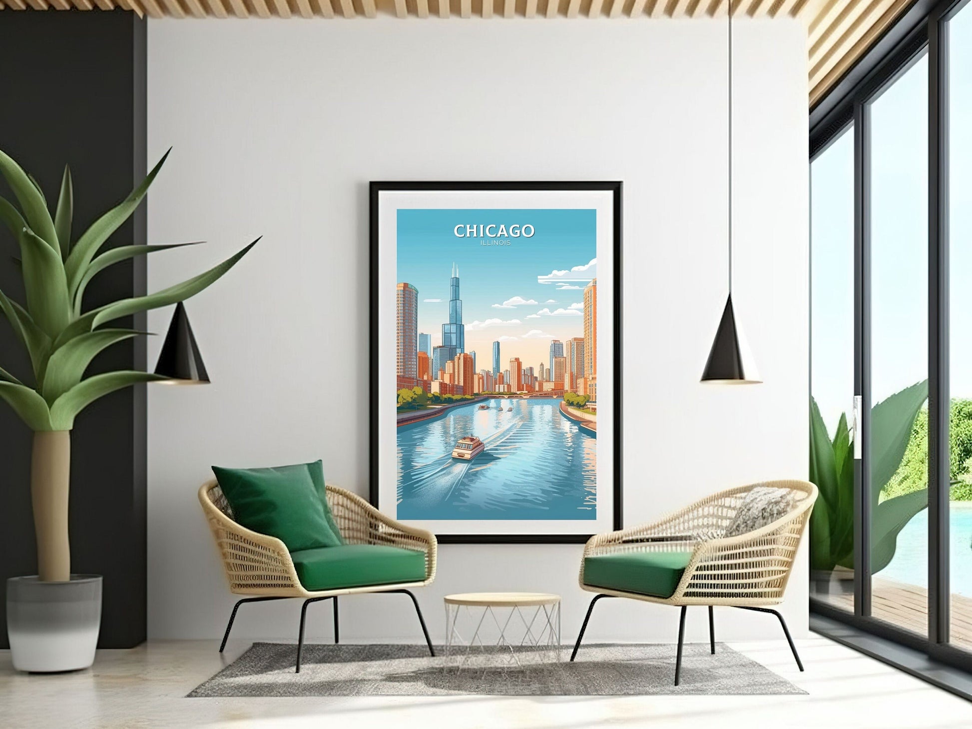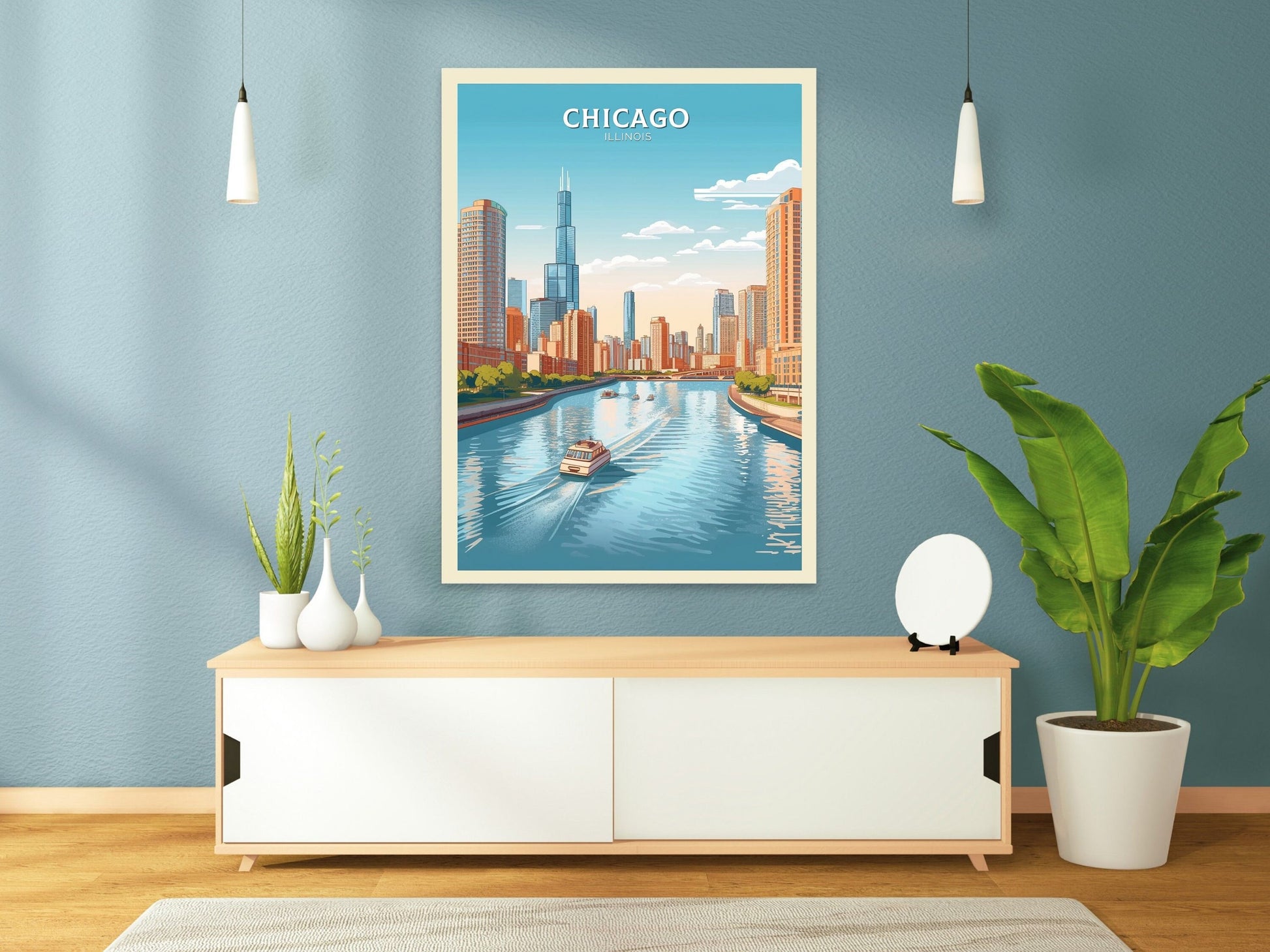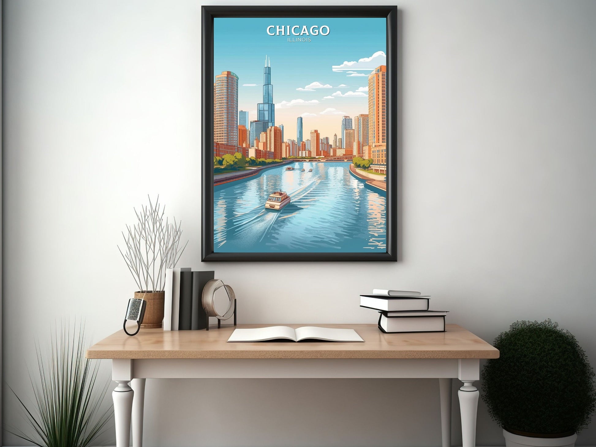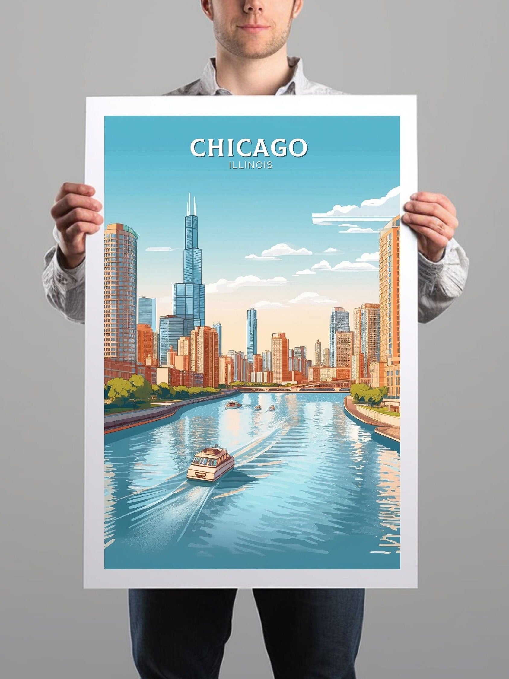 Disponible en téléchargement numérique et en tirage physique premium , cette œuvre d'art de voyage à Chicago est disponible en plusieurs formats, des formats standard de la série A aux grands formats 30 x 40 pouces. Imprimée sur du papier de haute qualité aux couleurs vives et aux détails précis, elle est idéale pour les salons, les bureaux ou comme cadeau attentionné pour toute personne inspirée par le paysage urbain emblématique de Chicago.