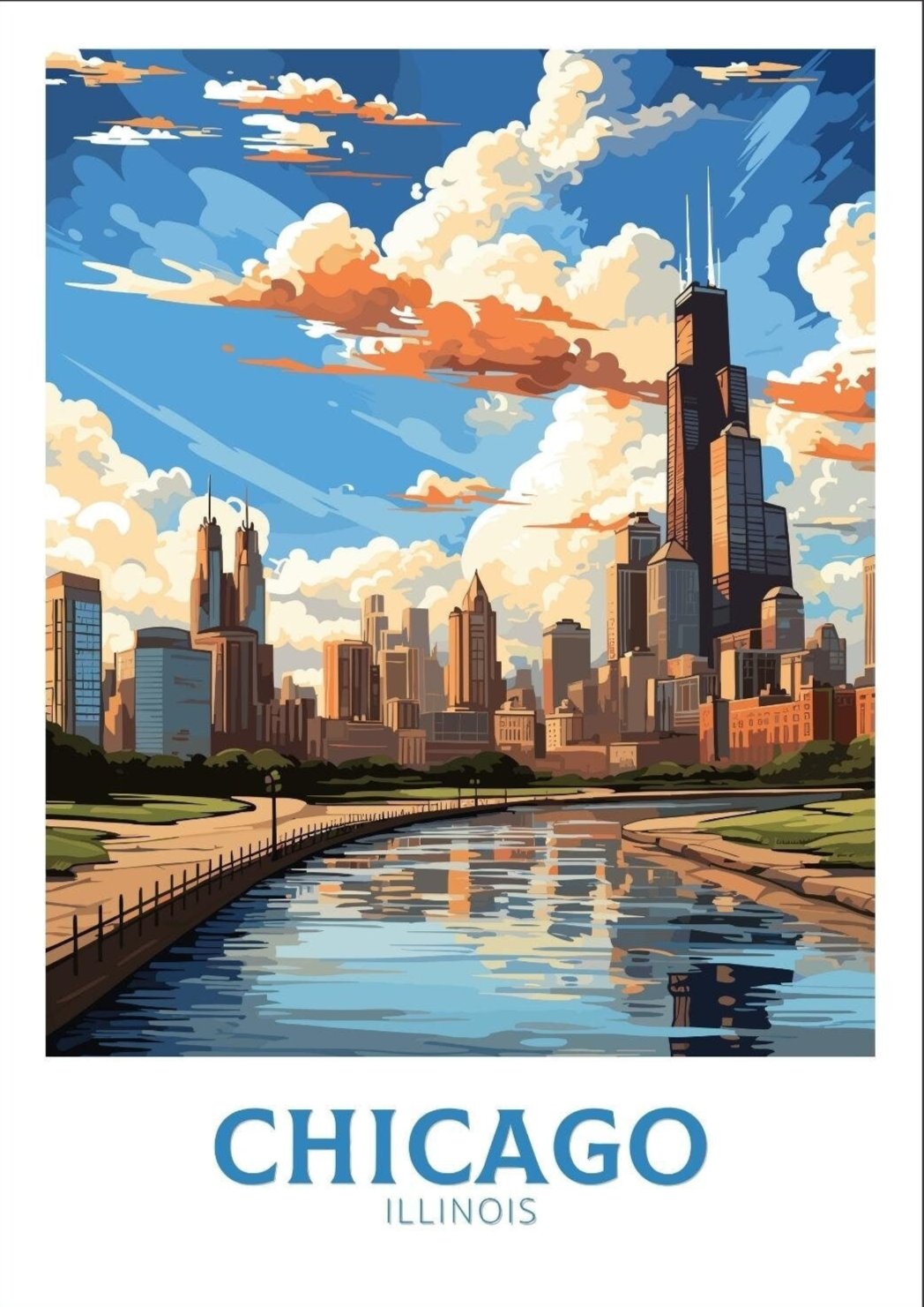 Intégrez la beauté emblématique de Chicago à votre intérieur avec notre affiche de voyage Chicago . Cette œuvre capture le lac Michigan, la silhouette de la ville et le charme vibrant des rives du lac Chicago. Elle est idéale pour les voyageurs, les amateurs d'architecture et les amateurs de décoration d'inspiration urbaine. Apportez une touche d'énergie et d'élégance de la Ville des Vents à votre maison ou à votre bureau.