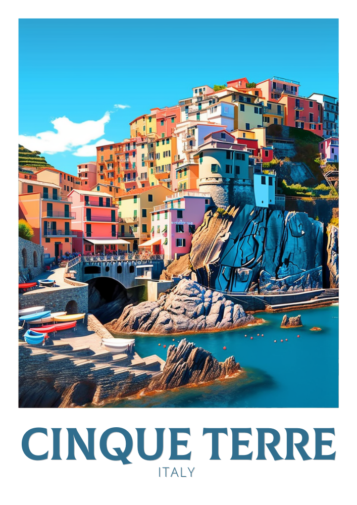 Introduisez le charme vibrant des villages côtiers italiens dans votre intérieur avec cette affiche de voyage des Cinque Terre . Avec ses maisons colorées à flanc de falaise, la mer Méditerranée scintillante et ses paysages luxuriants à flanc de colline, cette œuvre capture la magie de l'emblématique Riviera italienne.
