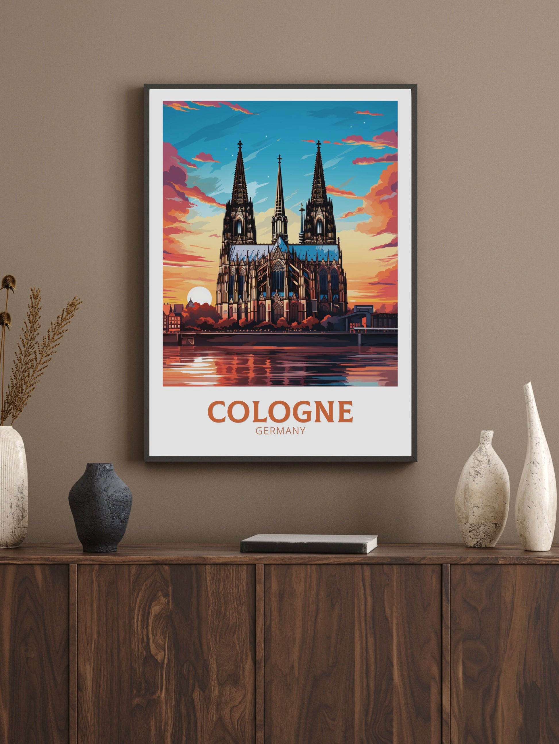 Capturez la beauté intemporelle de Cologne avec cette élégante affiche de voyage . Mettant en vedette la magnifique cathédrale de Cologne et le paisible Rhin, cette œuvre apporte une touche d'héritage allemand et de grandeur architecturale à vos murs.