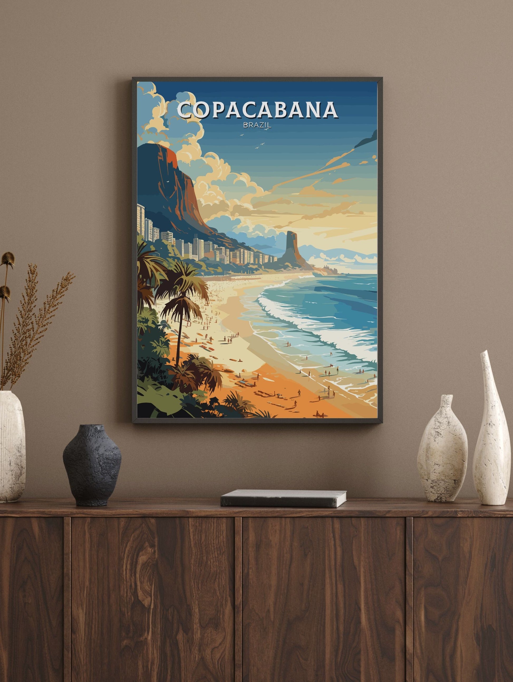 Cette affiche de Copacabana illustre l'étendue emblématique de sable blanc et de vagues qui font de la plage la plus célèbre de Rio de Janeiro un lieu apprécié dans le monde entier. Avec ses trottoirs aux motifs distinctifs et son ambiance océanique, Copacabana est plus qu'une plage : c'est un véritable monument culturel.