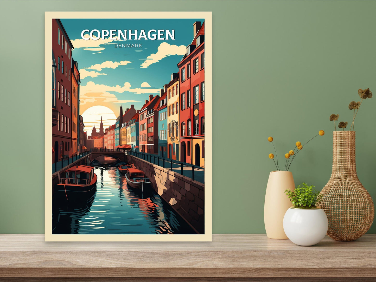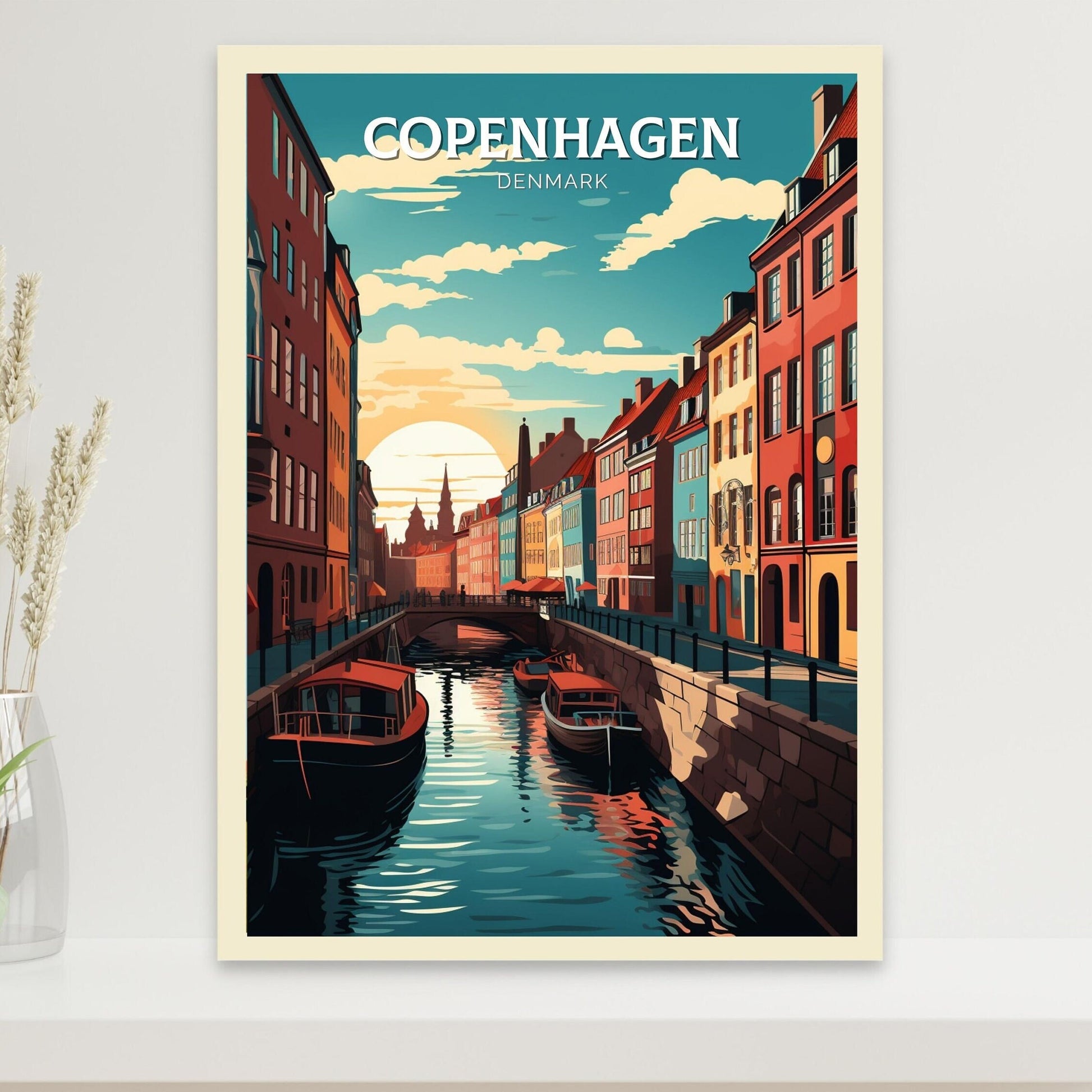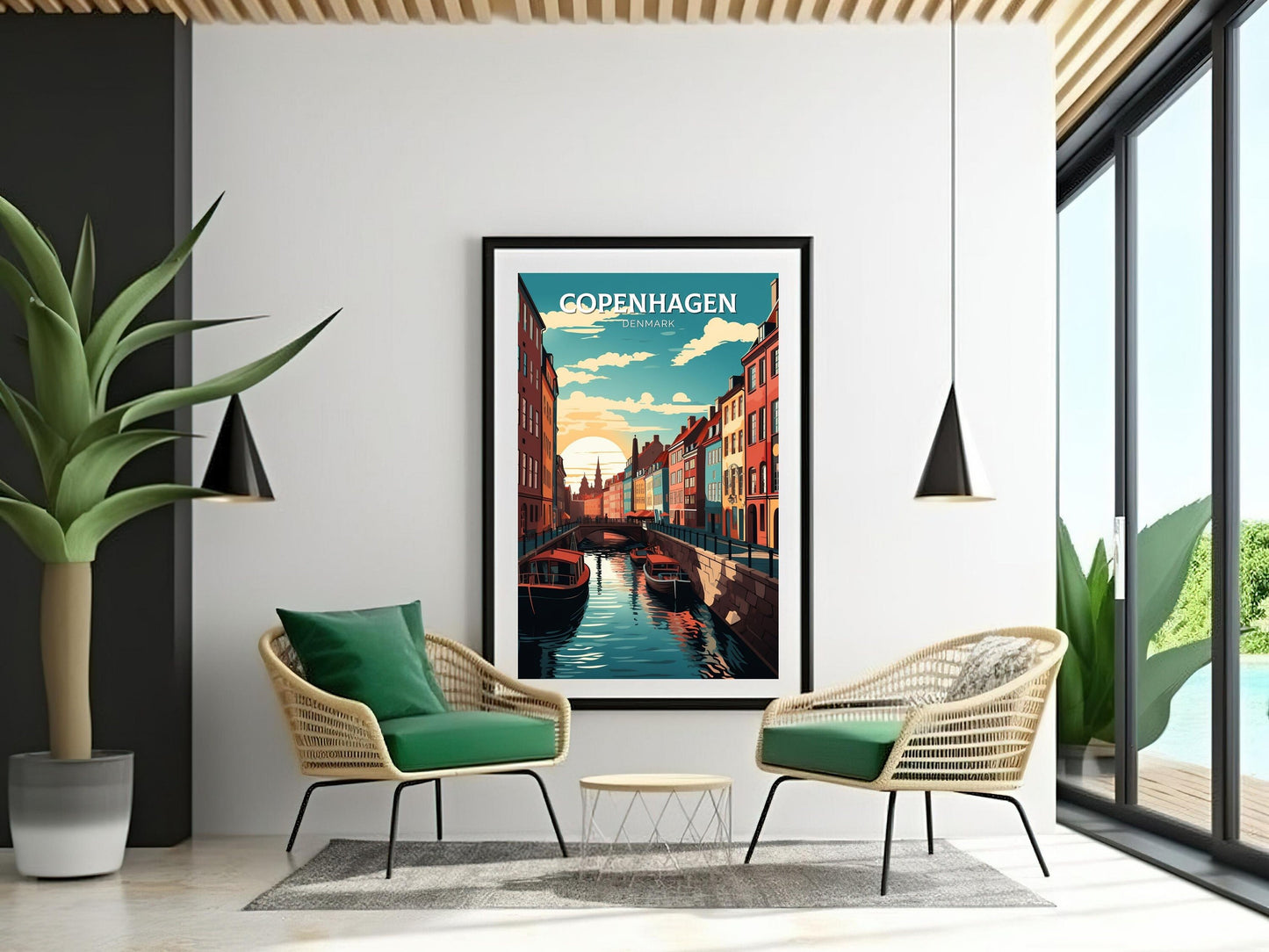 Célébrez le charme de Copenhague avec cet élégant imprimé voyage mettant en scène le front de mer coloré de Nyhavn et l'architecture danoise emblématique. Idéal pour apporter la beauté scandinave et l'esprit voyageur à votre maison ou votre espace de travail.
