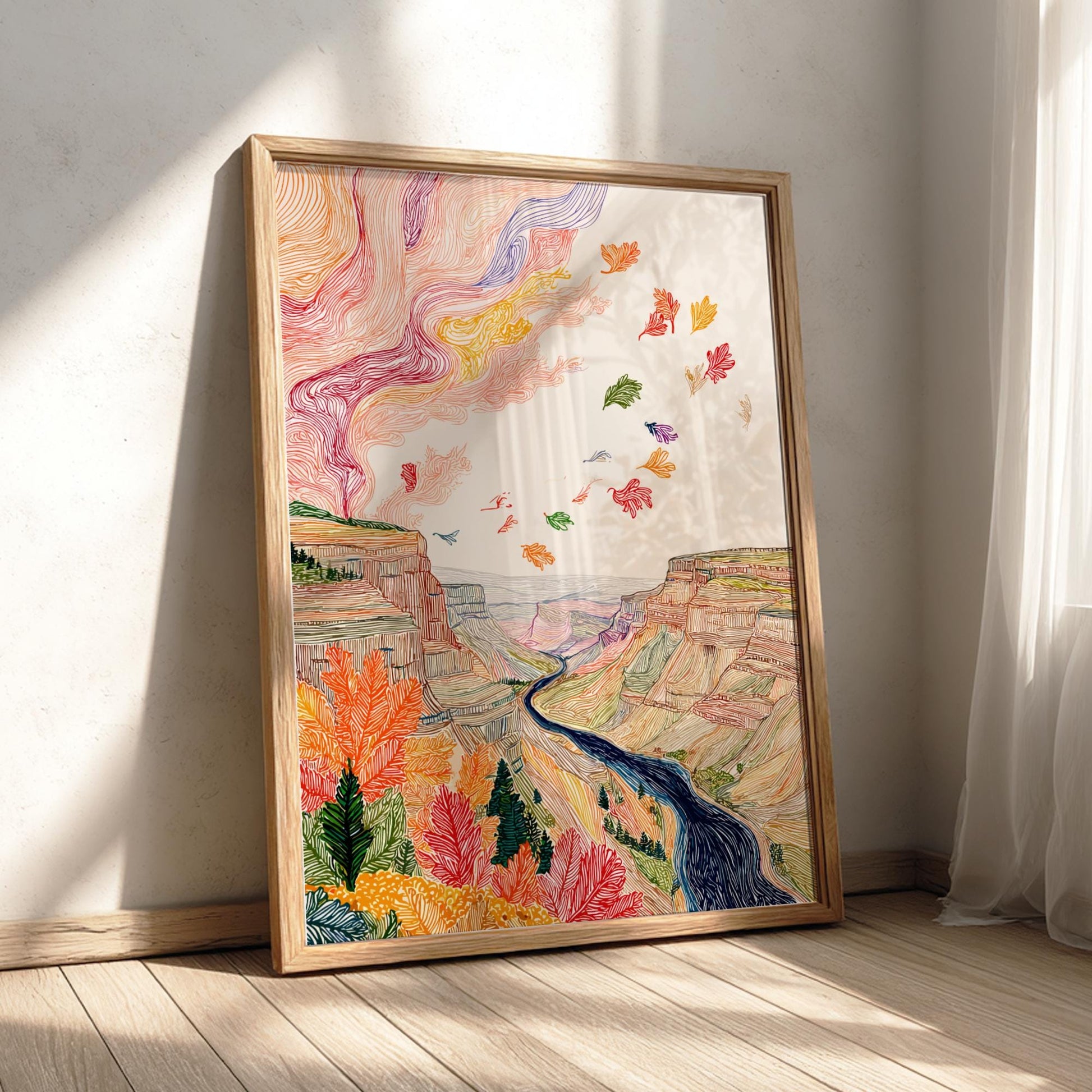 Crimson Depths – Impression d'art paysager de canyon pastel et décoration murale nature fantaisiste