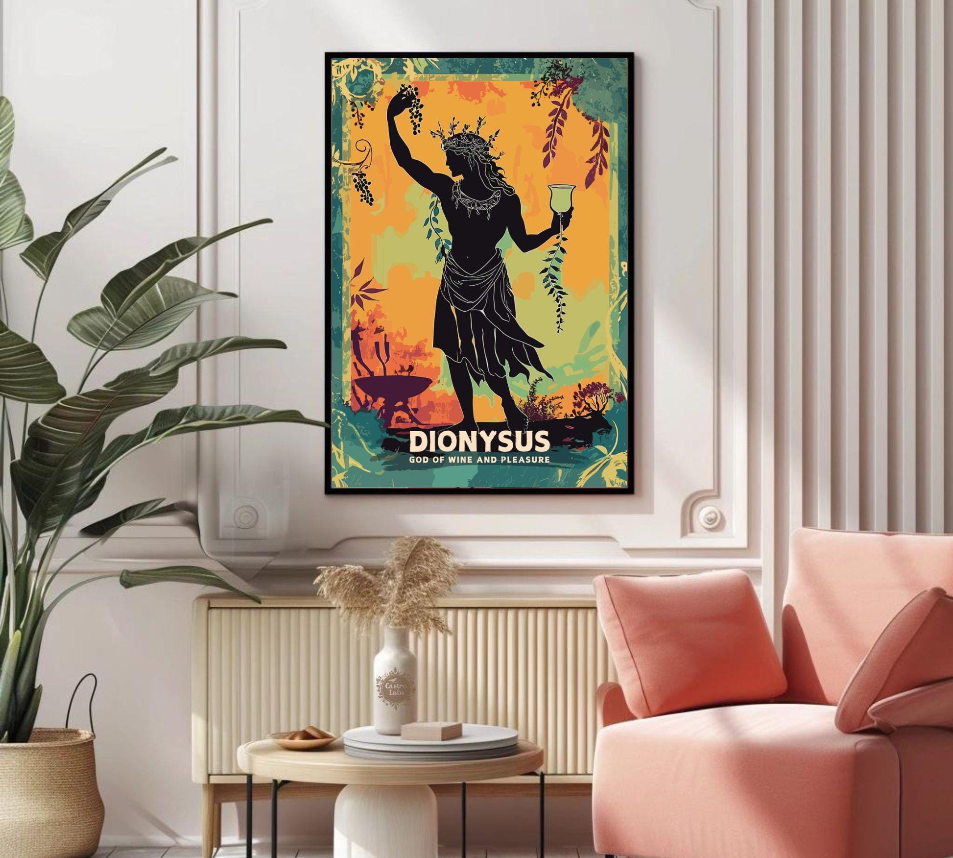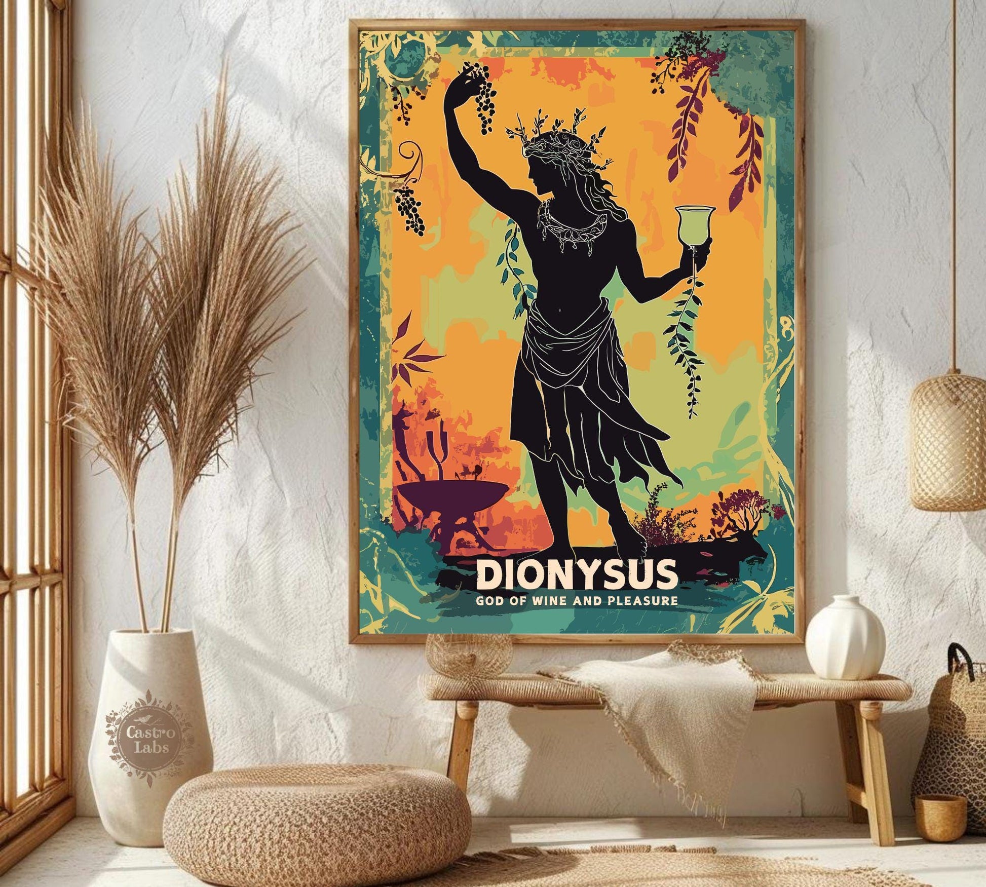 Notre affiche Dionysos – Décoration murale Mythologie grecque – embellit votre intérieur avec son design exubérant. Parfaite pour les amateurs de mythologie et les passionnés de fêtes, elle met en scène Dionysos, le dieu grec du vin et de l'extase, entouré de vignes et de joyeuses festivités. Que vous célébriez son esprit ou que vous aimiez l'art vibrant, cette affiche Mythologie Dionysos apportera une touche de gaieté à votre décoration.