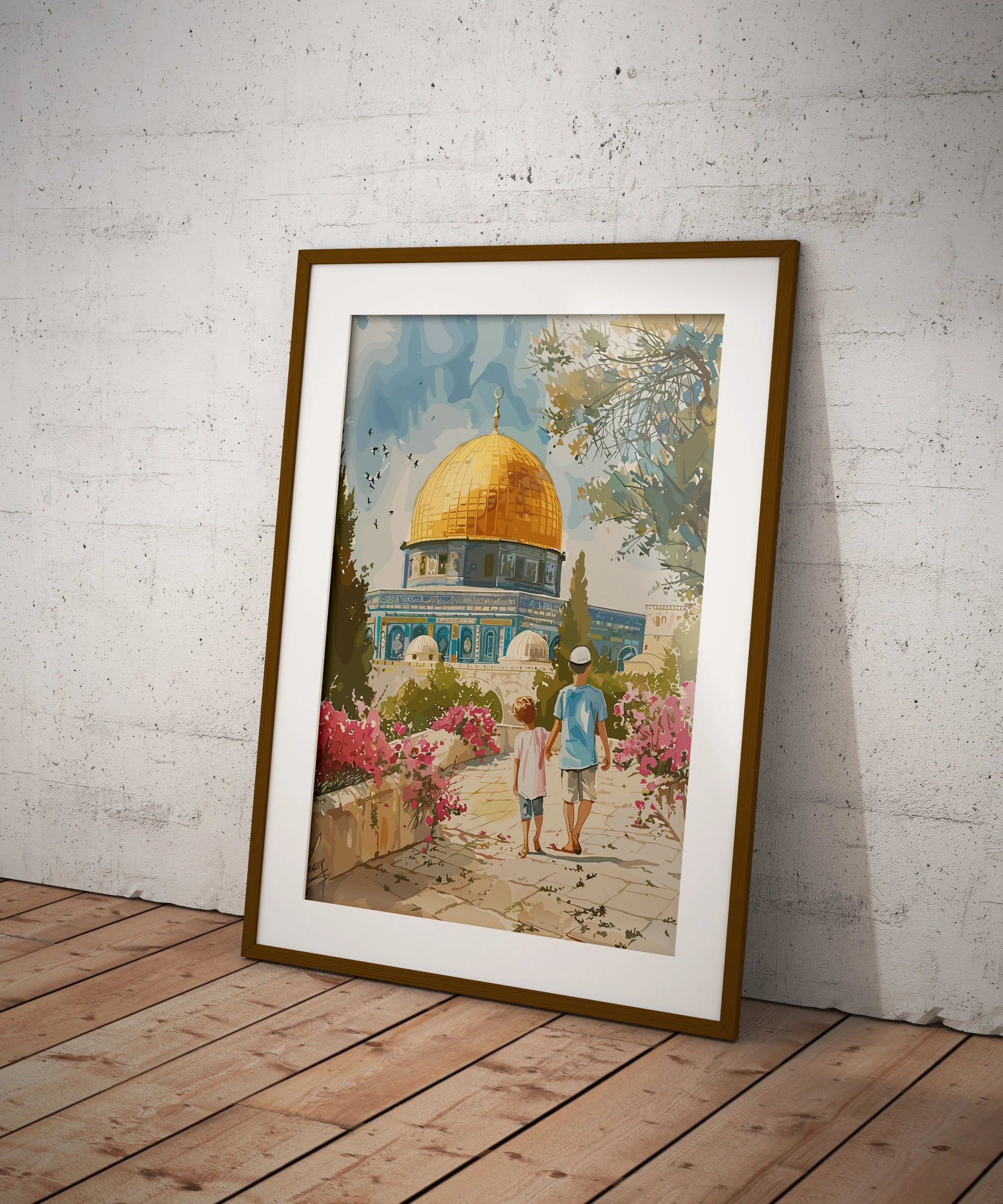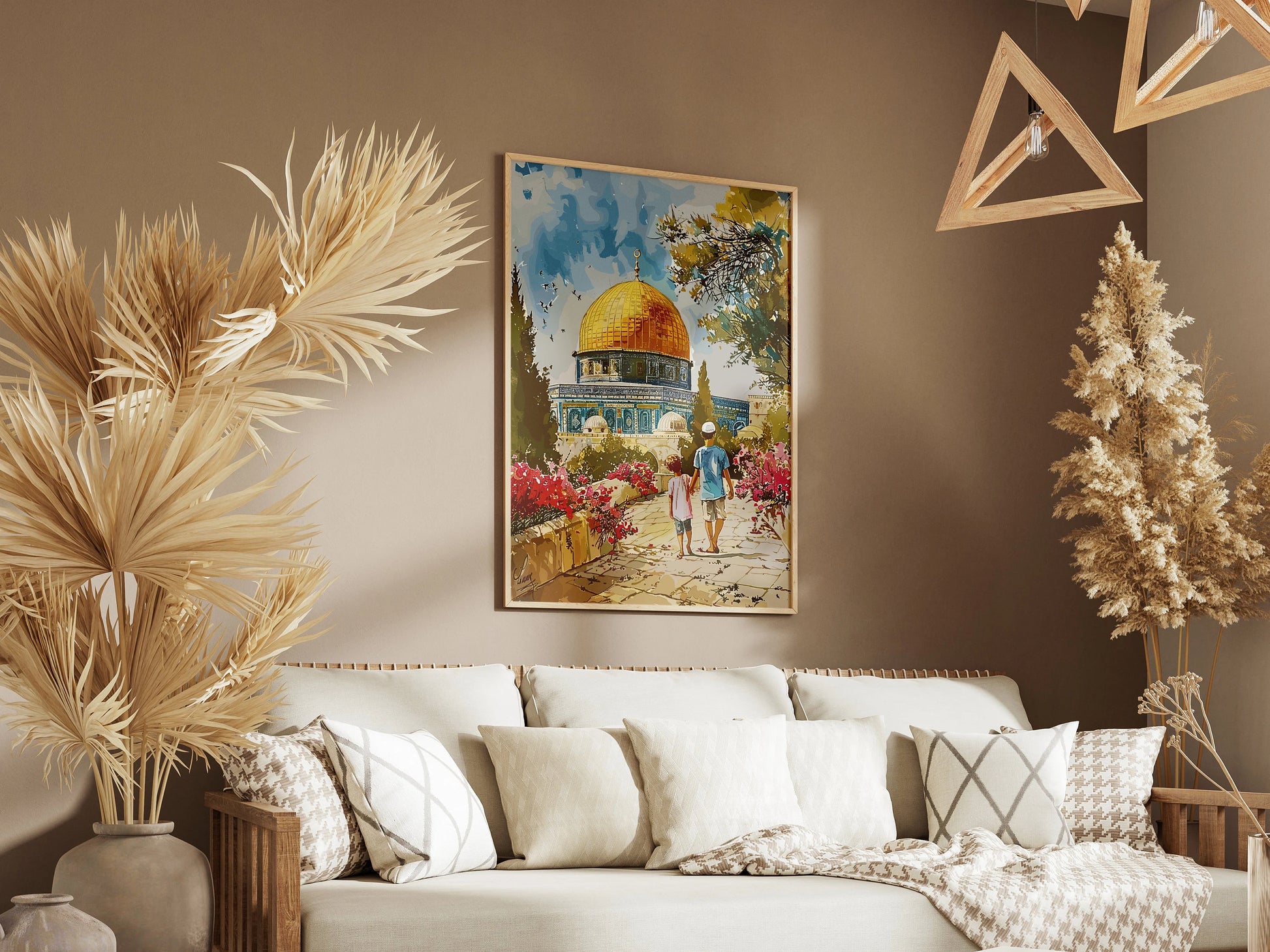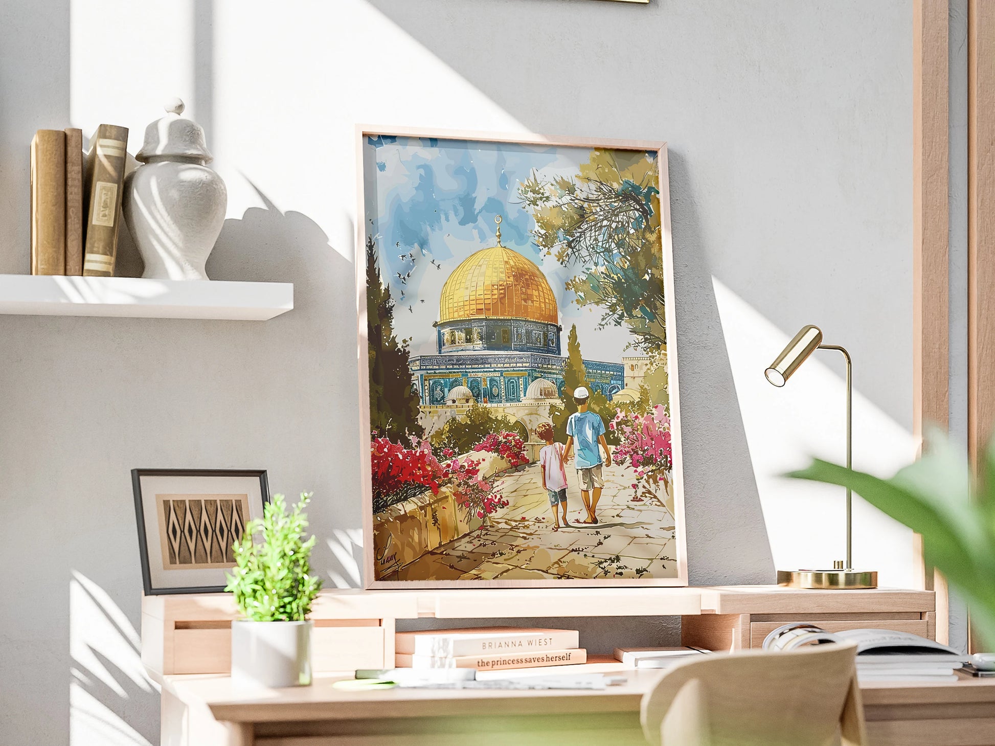 Célébrez l'un des monuments les plus sacrés du monde avec l' affiche Dôme du Rocher et Mosquée Al-Aqsa – Décoration murale de la Vieille Ville de Jérusalem . Cette œuvre époustouflante met en valeur la beauté architecturale et la signification spirituelle des lieux saints de Jérusalem, un ajout inspirant à tout espace.