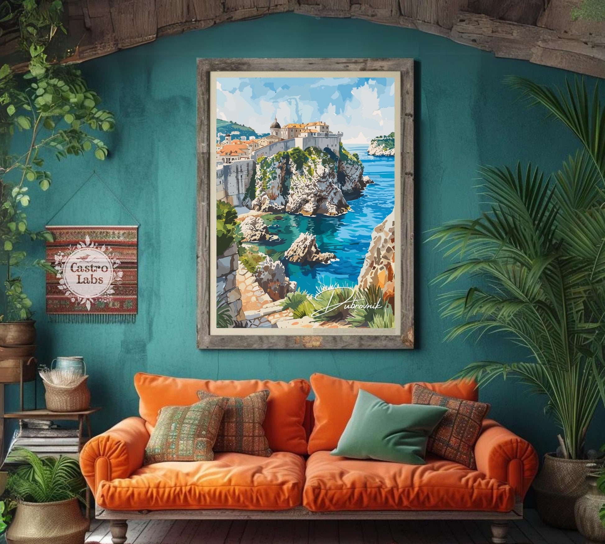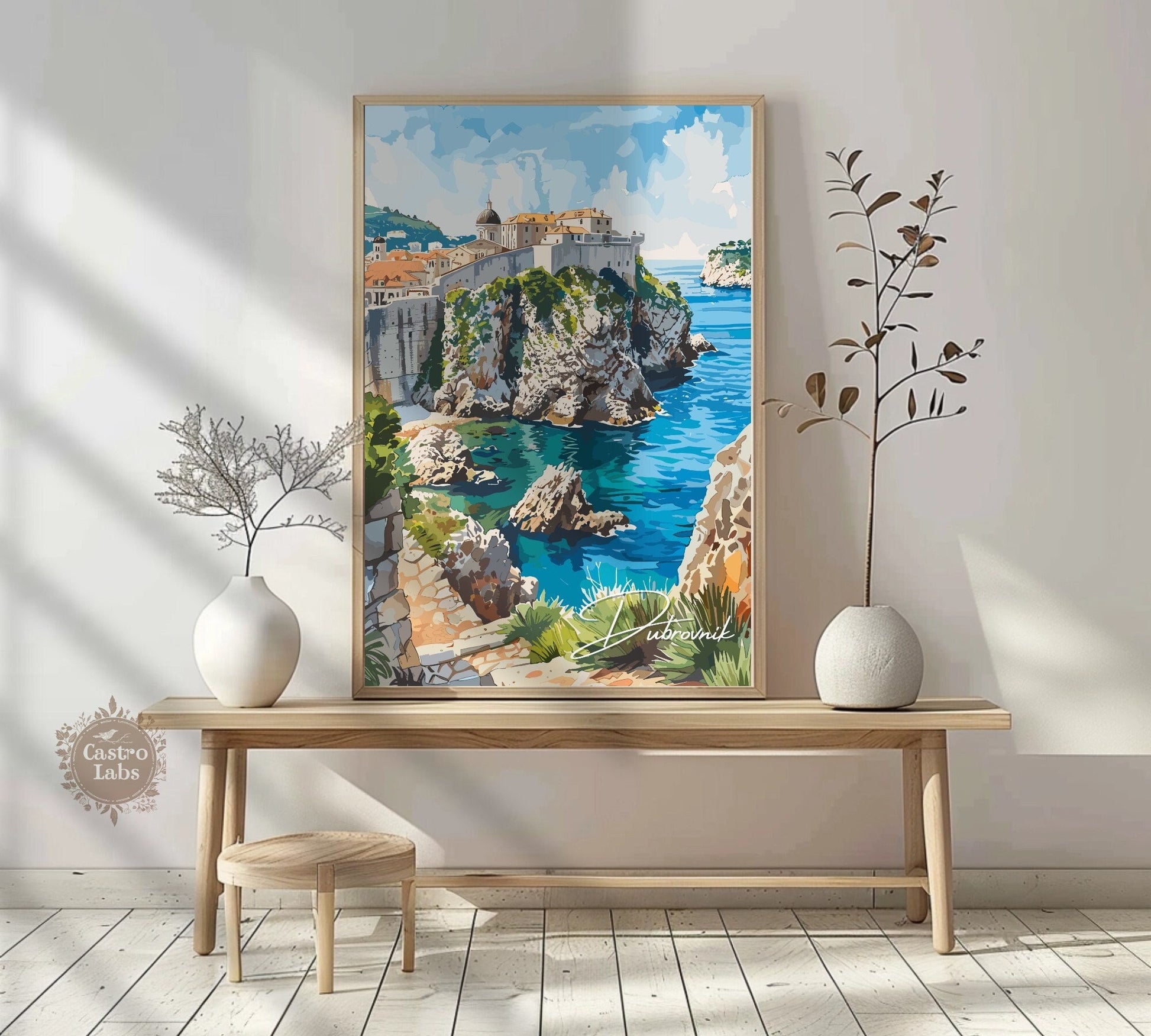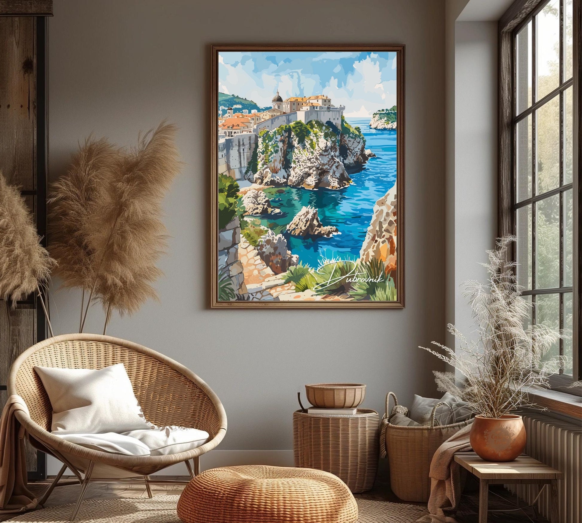 Intégrez la beauté médiévale de la côte adriatique à votre intérieur avec cette saisissante affiche de voyage de Dubrovnik . Mettant en vedette les toits rouges emblématiques de la ville, ses anciens remparts de pierre et ses eaux cristallines, cette œuvre d'art croate capture le charme intemporel de la vieille ville de Dubrovnik.