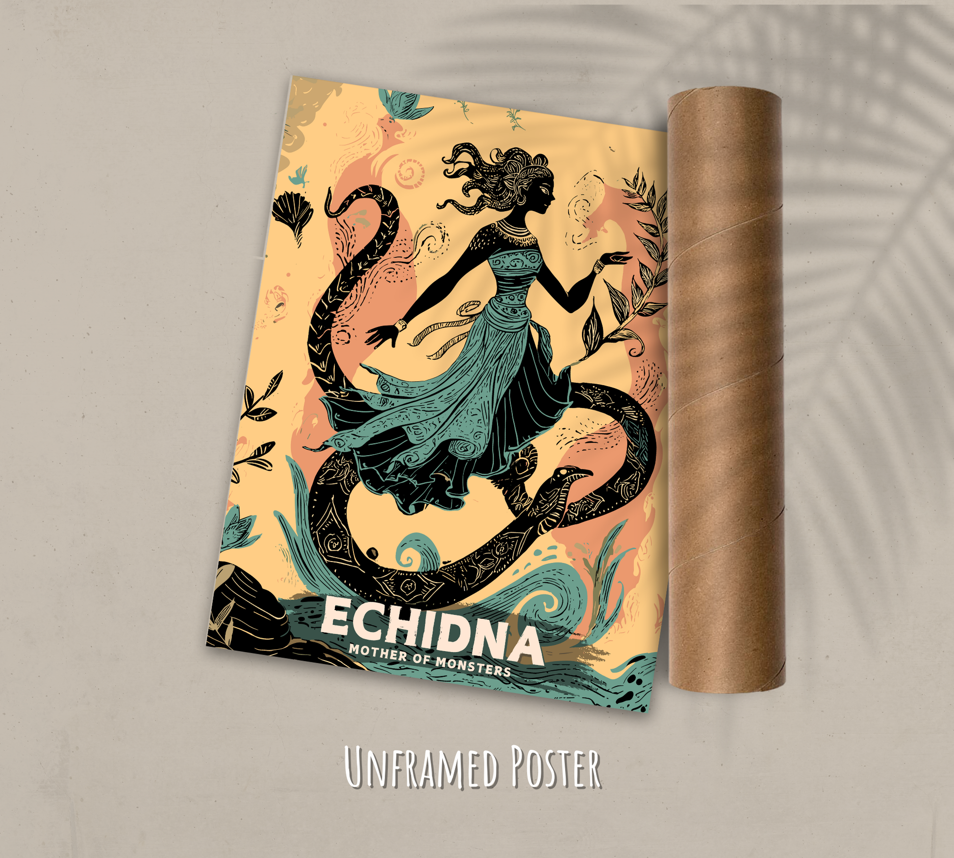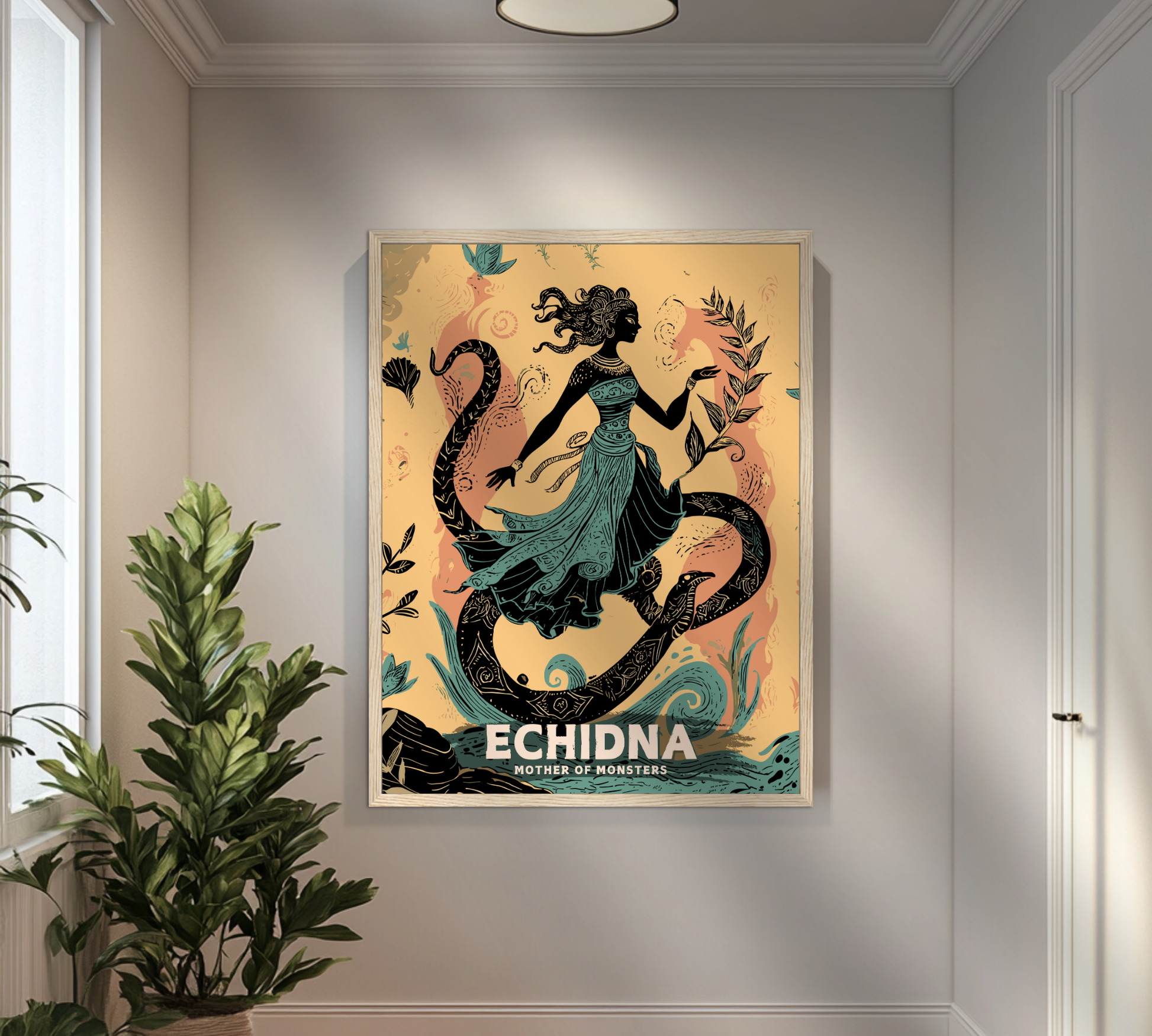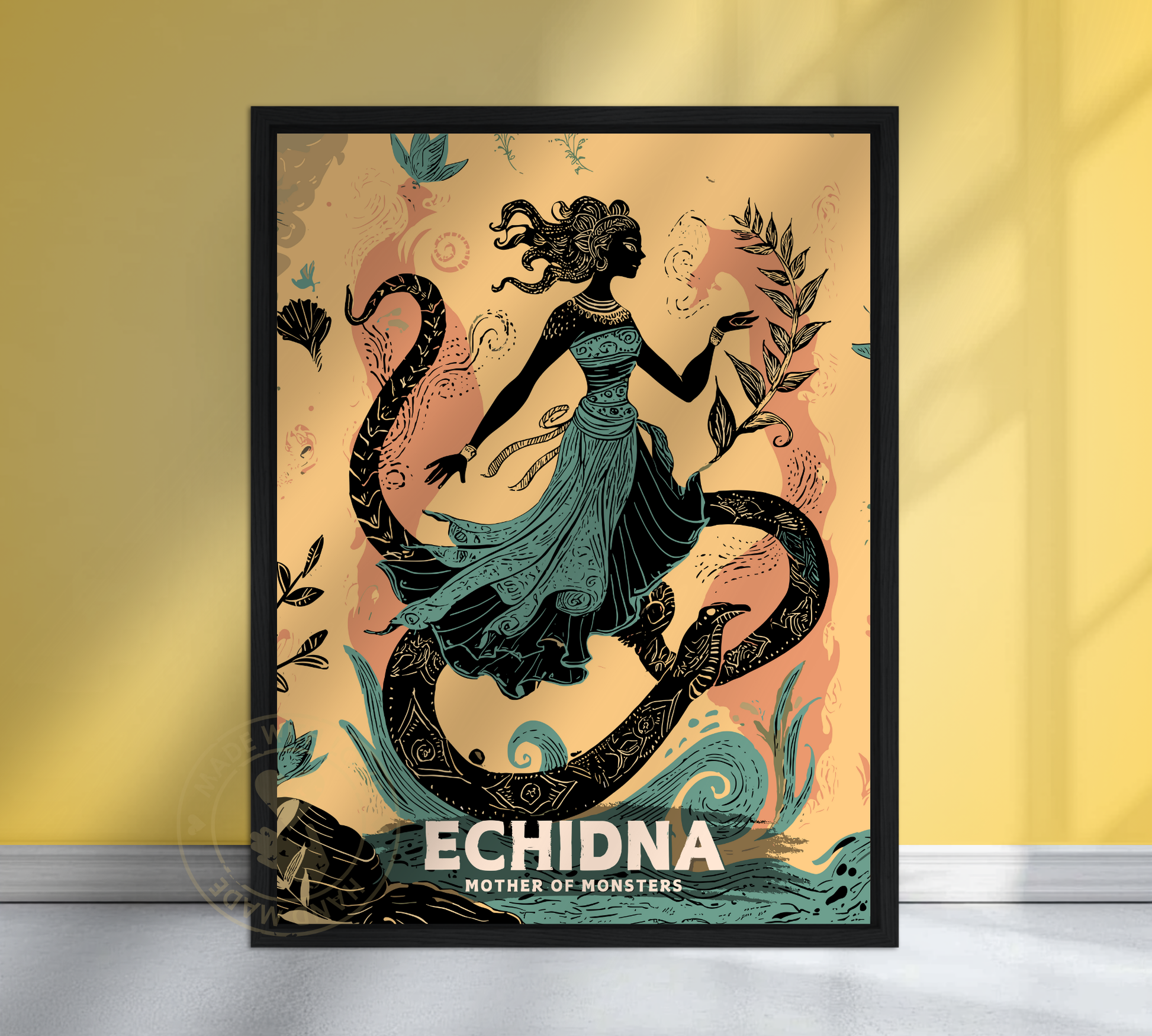 Ajoutez une touche de mythologie à votre espace avec cette superbe affiche d'Échidna , représentant la terrifiante Mère des Monstres de la mythologie grecque. Connue pour sa lignée redoutable, Échidna a donné naissance à certaines des créatures les plus célèbres, de l'Hydre à la Chimère. Cette affiche capture sa présence féroce et son rôle essentiel dans le monde des mythes antiques, ce qui en fait un incontournable pour tout passionné de mythologie.