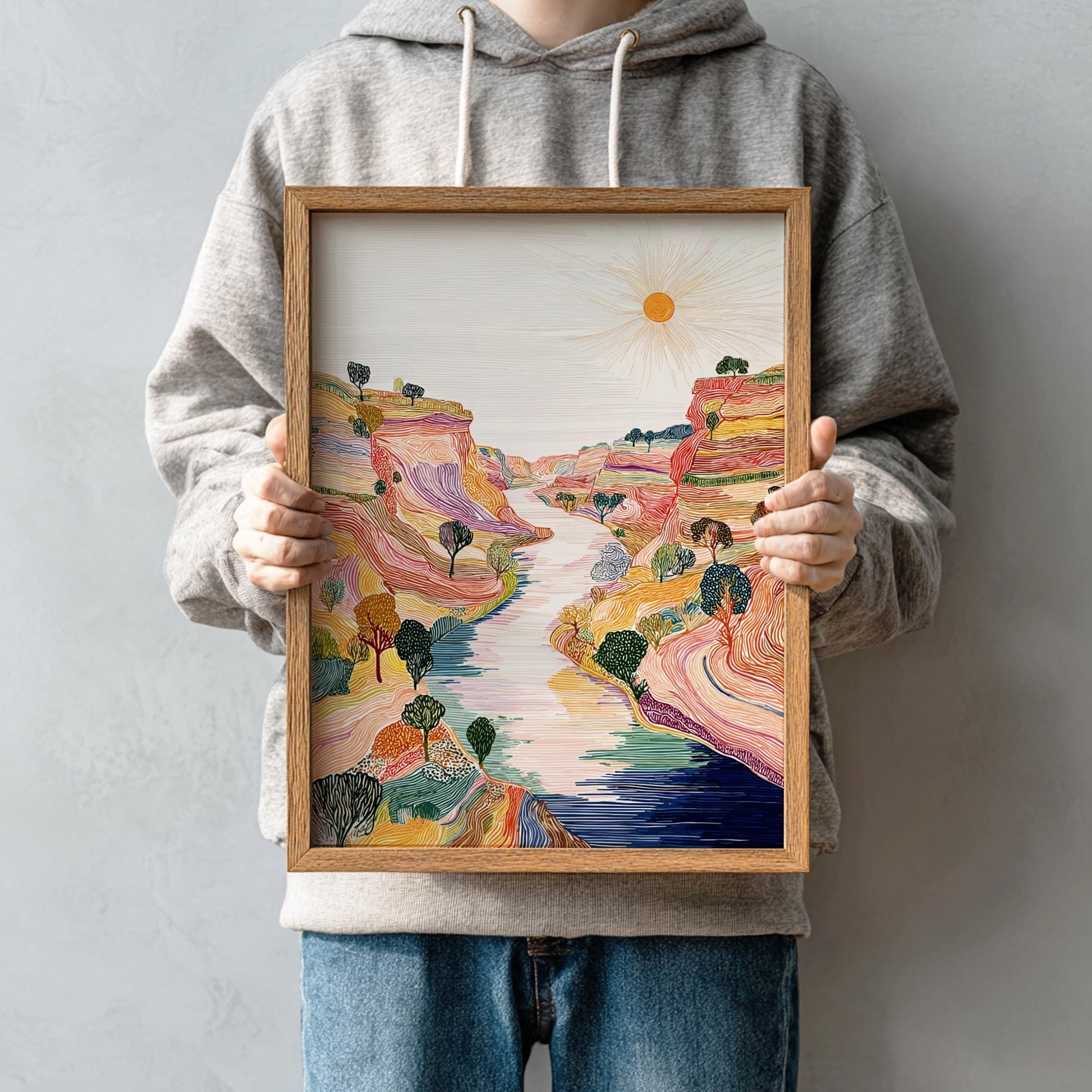 Introduisez la beauté paisible des bords de rivière dans votre intérieur avec l' affiche « Eclipse Bend » – Paysage fluvial pastel , une décoration murale captivante et fantaisiste aux tons pastel doux et au calme des eaux. Idéale pour les chambres, les salons ou les espaces créatifs, cette affiche fluviale pastel apporte une touche apaisante et fantaisiste à tout intérieur. L' affiche « Eclipse Bend » est parfaite pour les amoureux de la nature en quête d'une décoration murale paisible et inspirée par la nature, évoquant détente et harmonie.