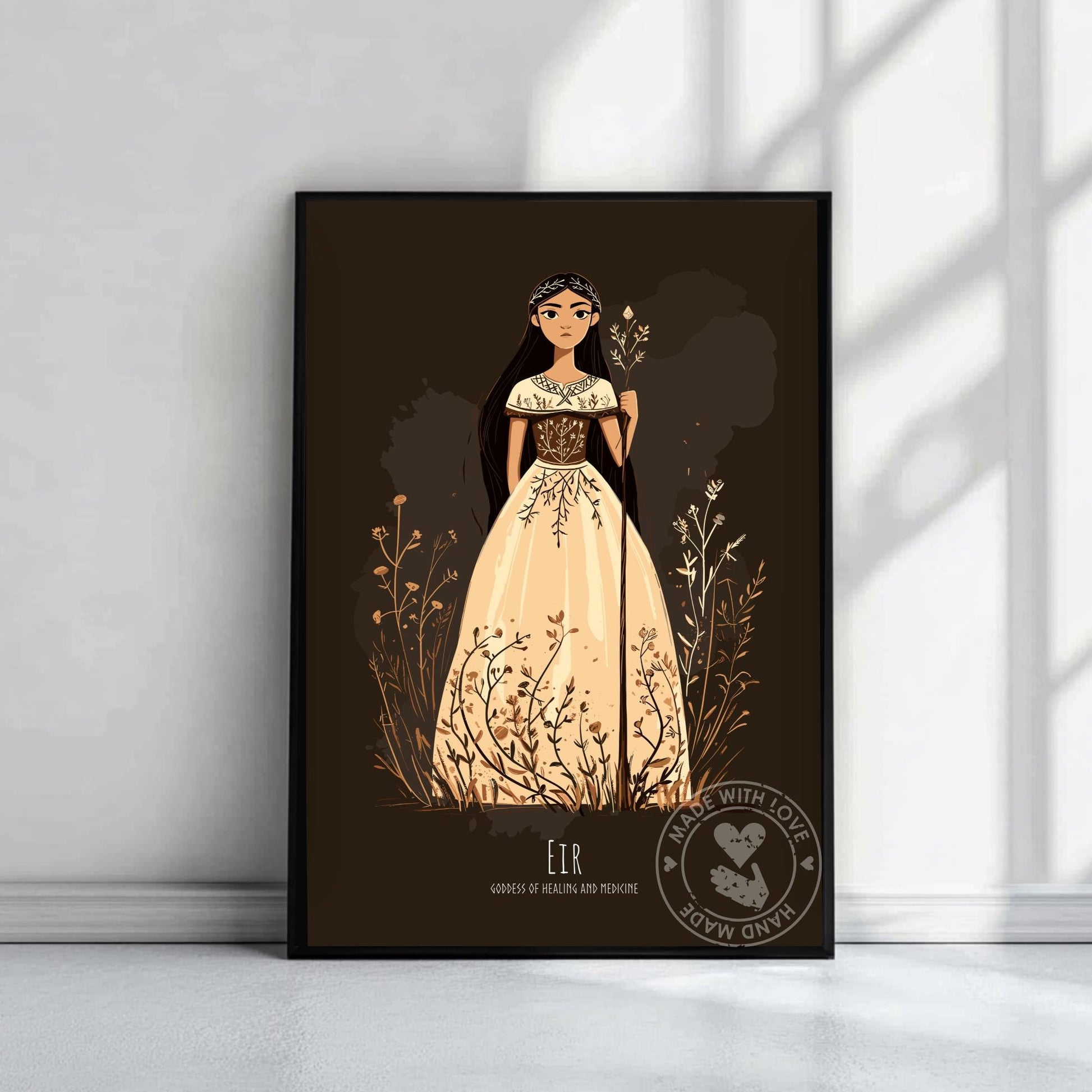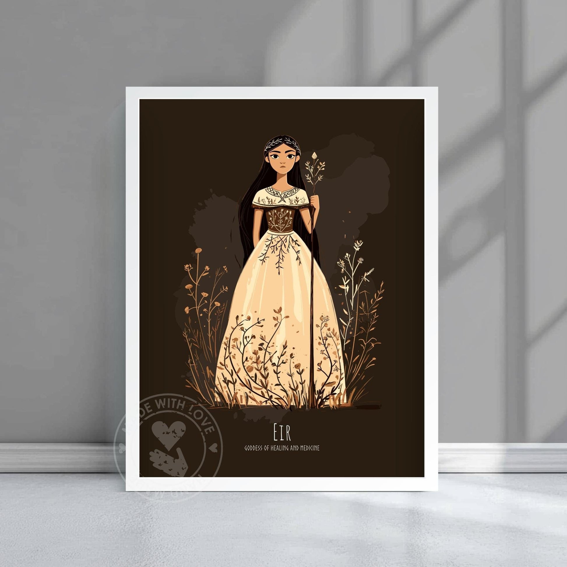Cette affiche de la déesse Eir représente la déesse guérisseuse nordique dans une posture douce, les mains posées avec soin. Elle évoque Eir avec une présence apaisante, ancrée dans les récits nourrissants du folklore nordique.