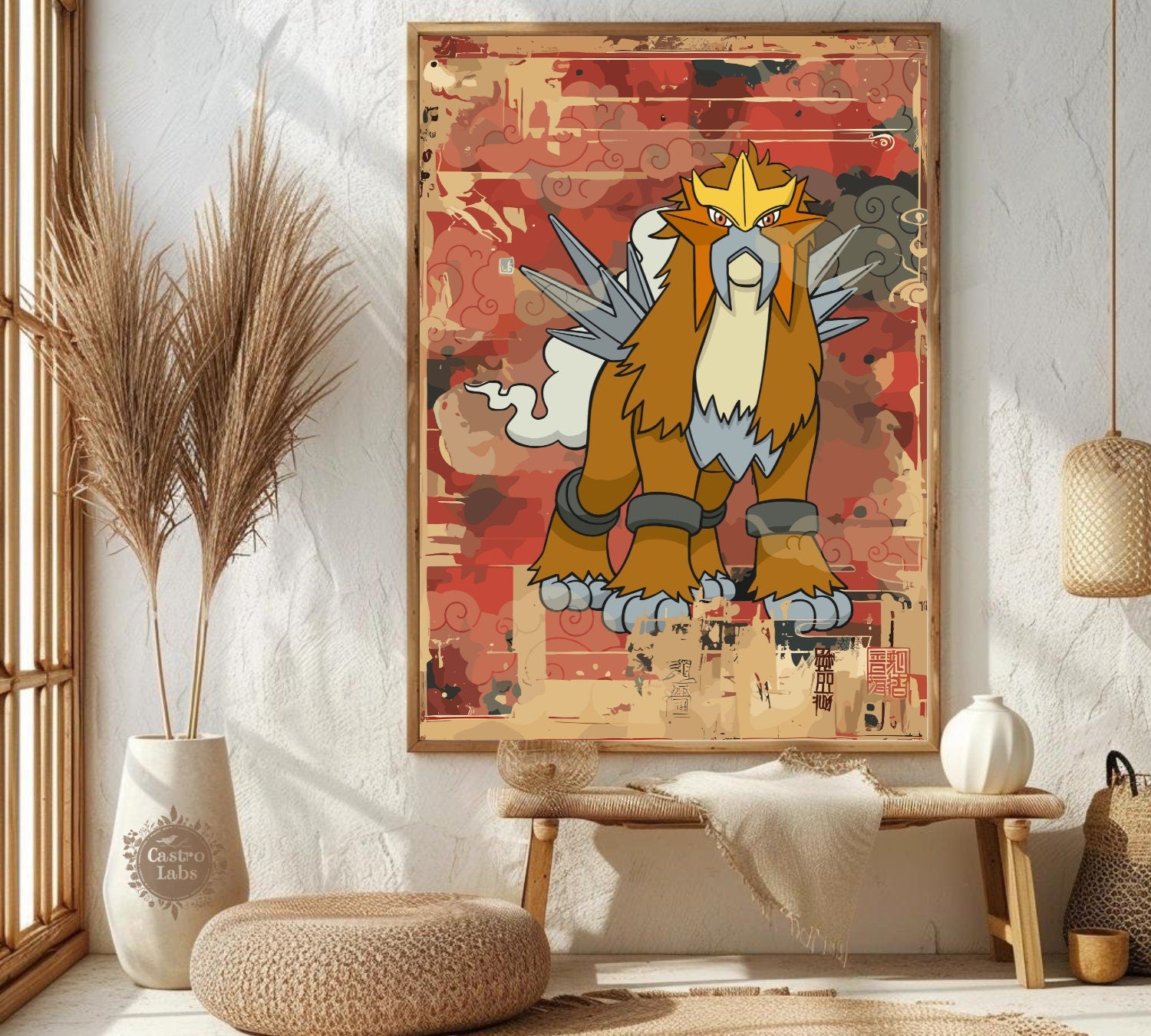Affiche Pokémon Entei - Illustration de style tapisserie japonaise animée