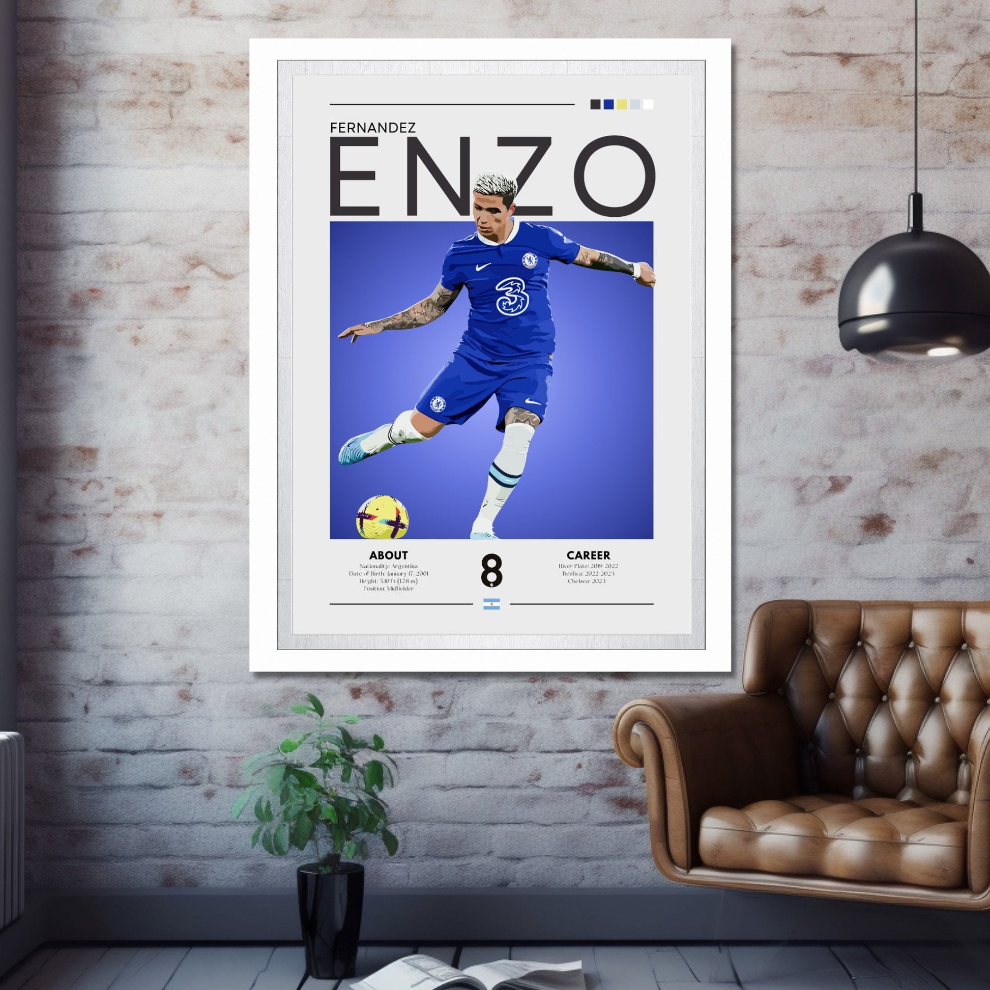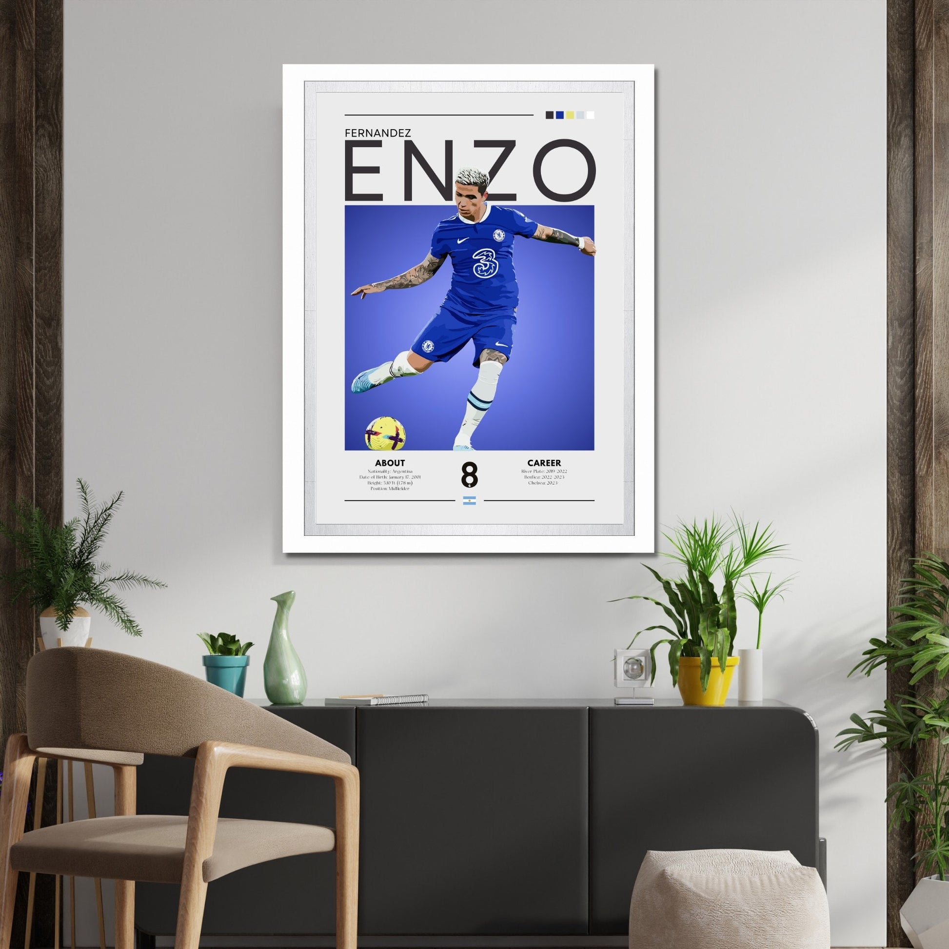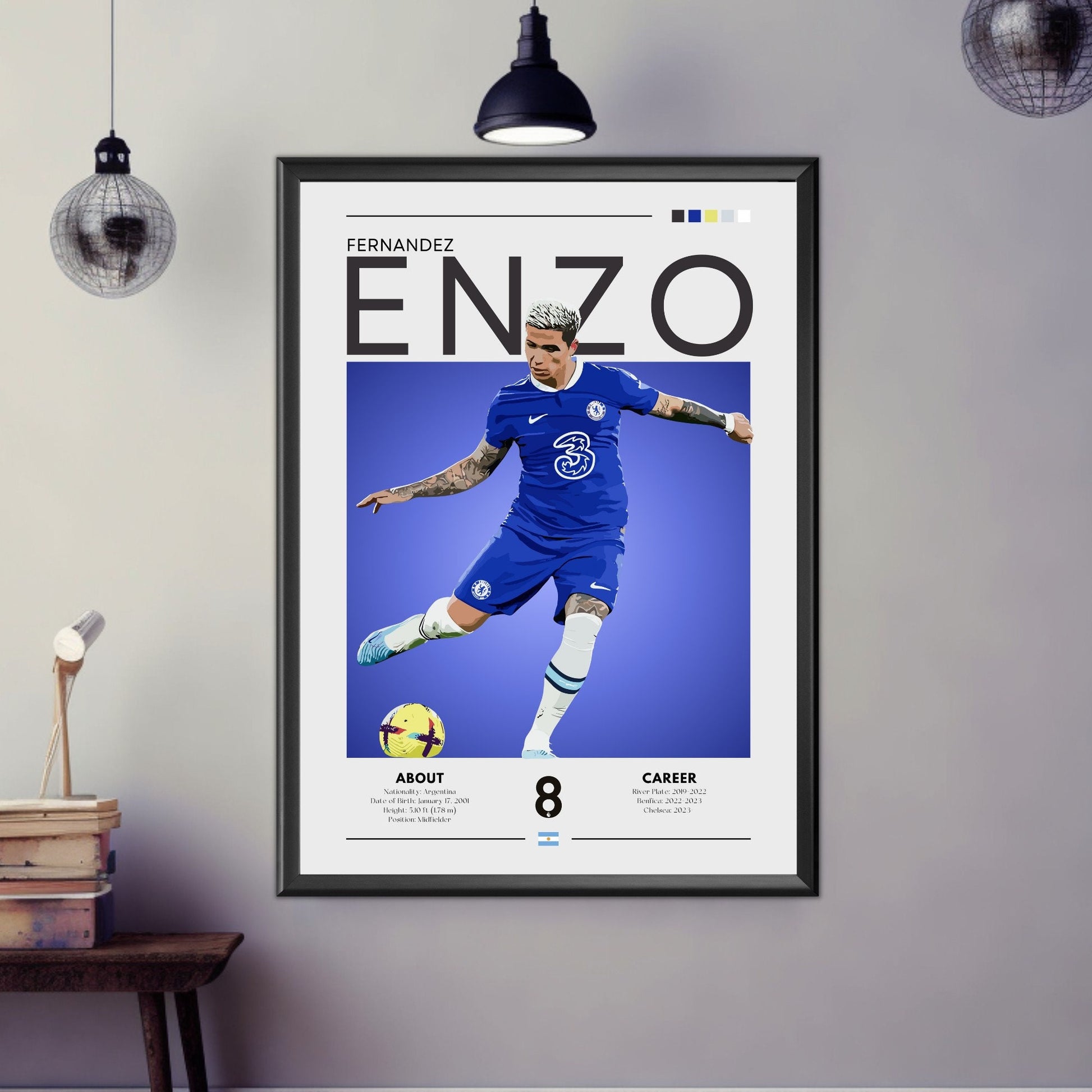 Affichez votre soutien à Enzo Fernández , le milieu de terrain dynamique qui a fait vibrer Chelsea FC et l' équipe nationale argentine , avec cette affiche de football élégante et stylée de Brighton Posters. Connu pour son sang-froid, sa polyvalence et son esprit de vainqueur de la Coupe du monde, Enzo est rapidement devenu un favori des fans.