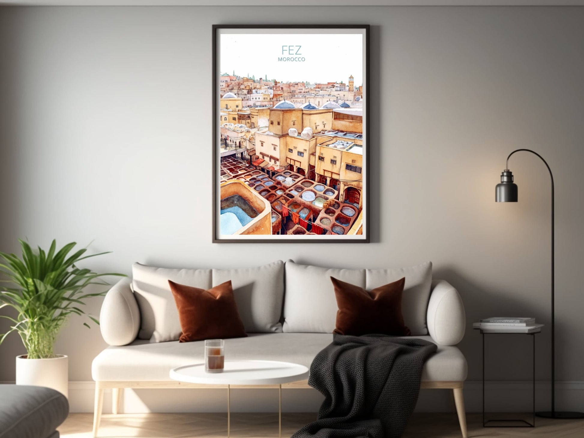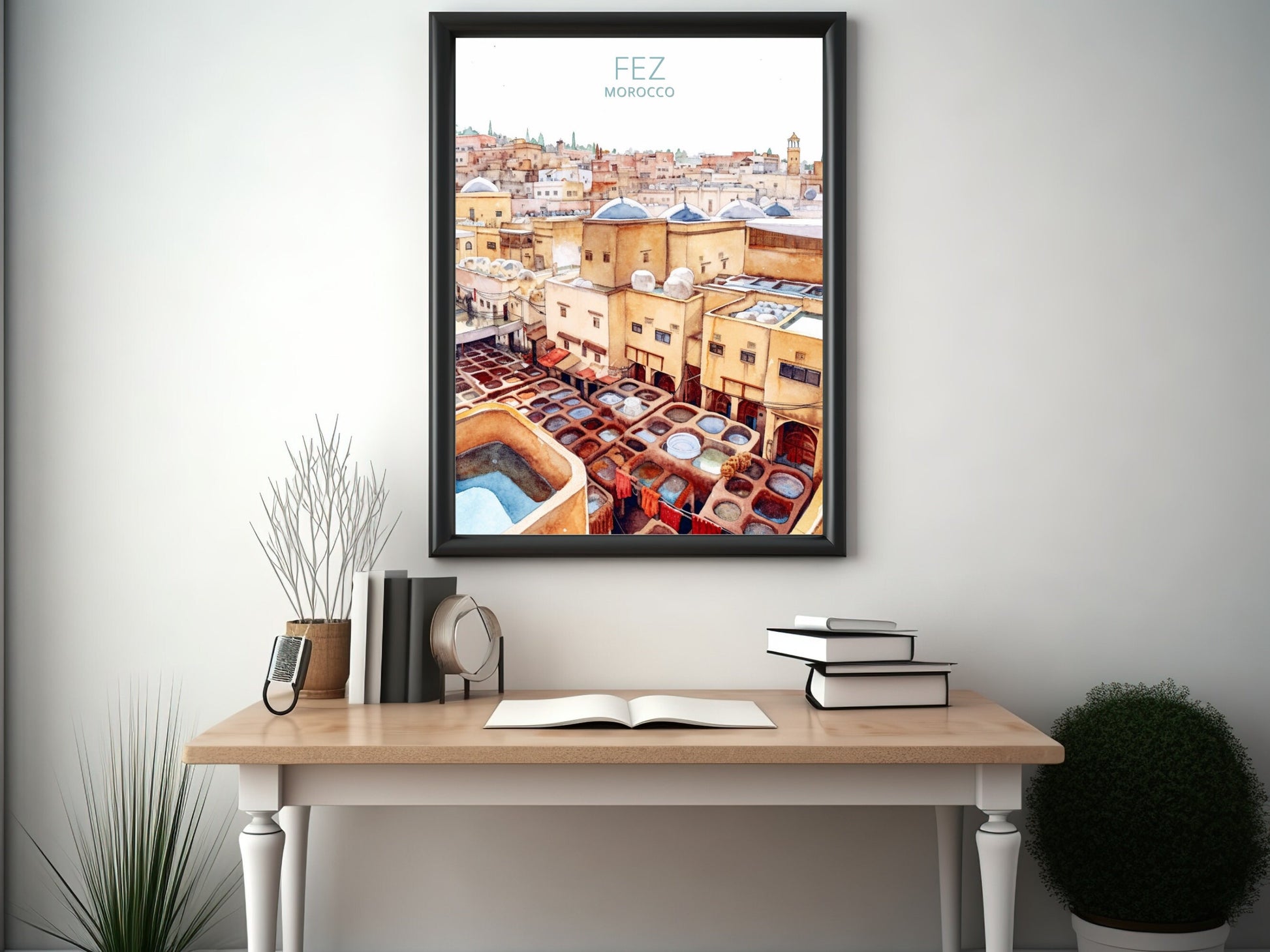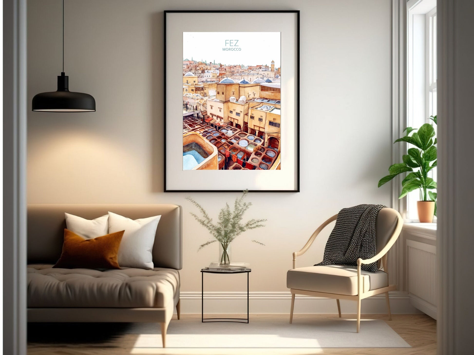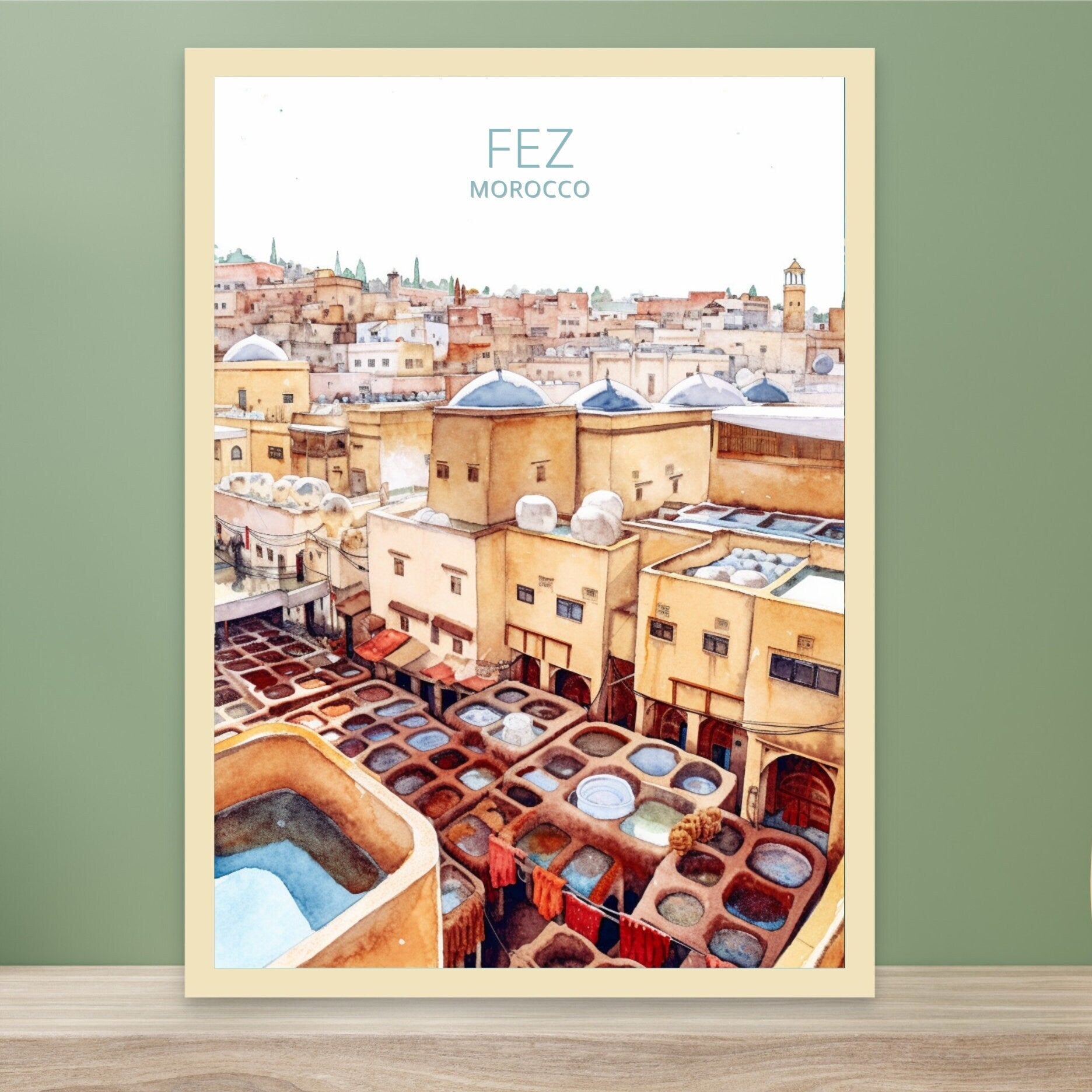 Notre affiche rétro Fès - Travel Morocco Design plonge votre intérieur dans le charme ancien de Fès, au Maroc, grâce à son design nostalgique. Idéale pour les passionnés de voyages et d'art rétro, elle capture les ruelles labyrinthiques et les tanneries ornées de la médina dans un style intemporel. Que vous ayez exploré ses souks ou rêvé de son patrimoine, cette affiche rétro Fès sera un ajout remarquable à votre décoration.