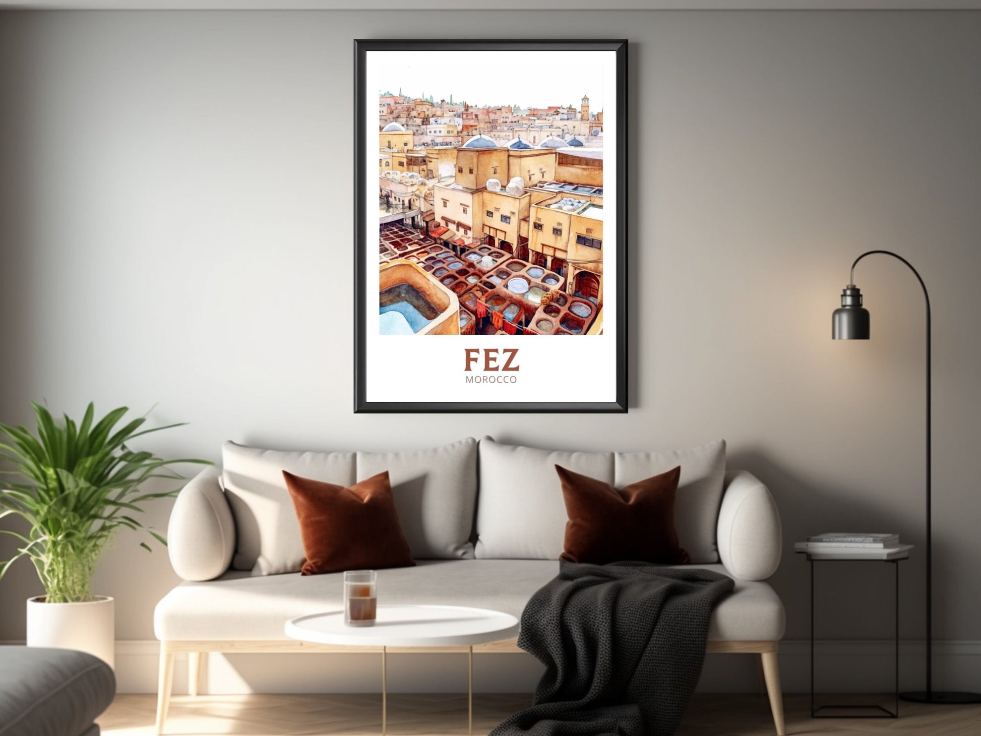Notre affiche vintage de Fès – Art du patrimoine marocain – plonge votre intérieur dans le charme ancien de Fès, au Maroc, grâce à son design nostalgique. Parfaite pour les passionnés de voyages et d'art rétro, elle capture les ruelles labyrinthiques et les tanneries ornées de la médina dans un style intemporel. Que vous ayez exploré ses souks ou rêvé de son patrimoine, cette affiche vintage de Fès sera un ajout magnifique à votre décoration.