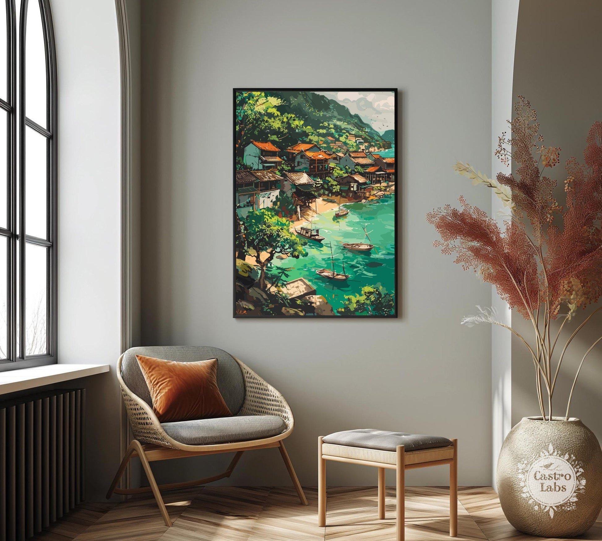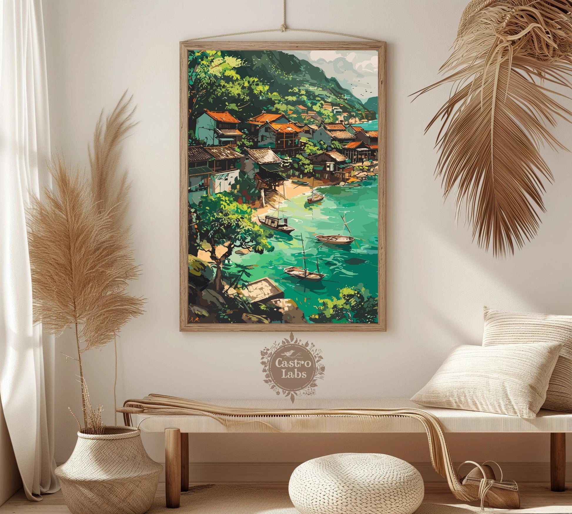 Capturez le charme de la vie côtière avec l'affiche « Village de pêcheurs au Vietnam » . Cette œuvre représente magnifiquement des bateaux de pêche traditionnels, des villages côtiers et les paysages sereins du littoral vietnamien. Parfaite pour les amateurs d' art mural d'Asie du Sud-Est , d'affiches de voyage au Vietnam et d'impressions de paysages côtiers , elle apporte une touche culturelle authentique à n'importe quelle pièce.