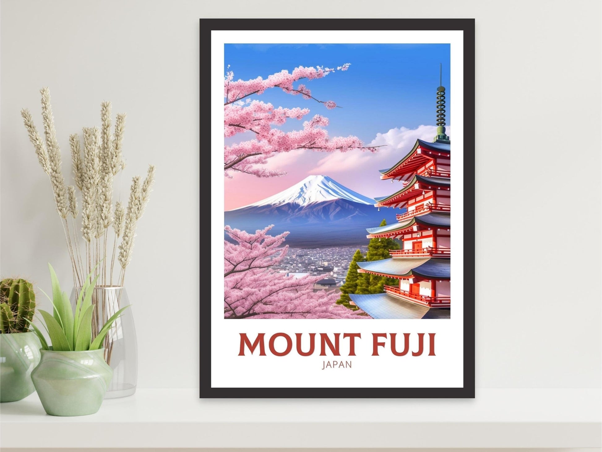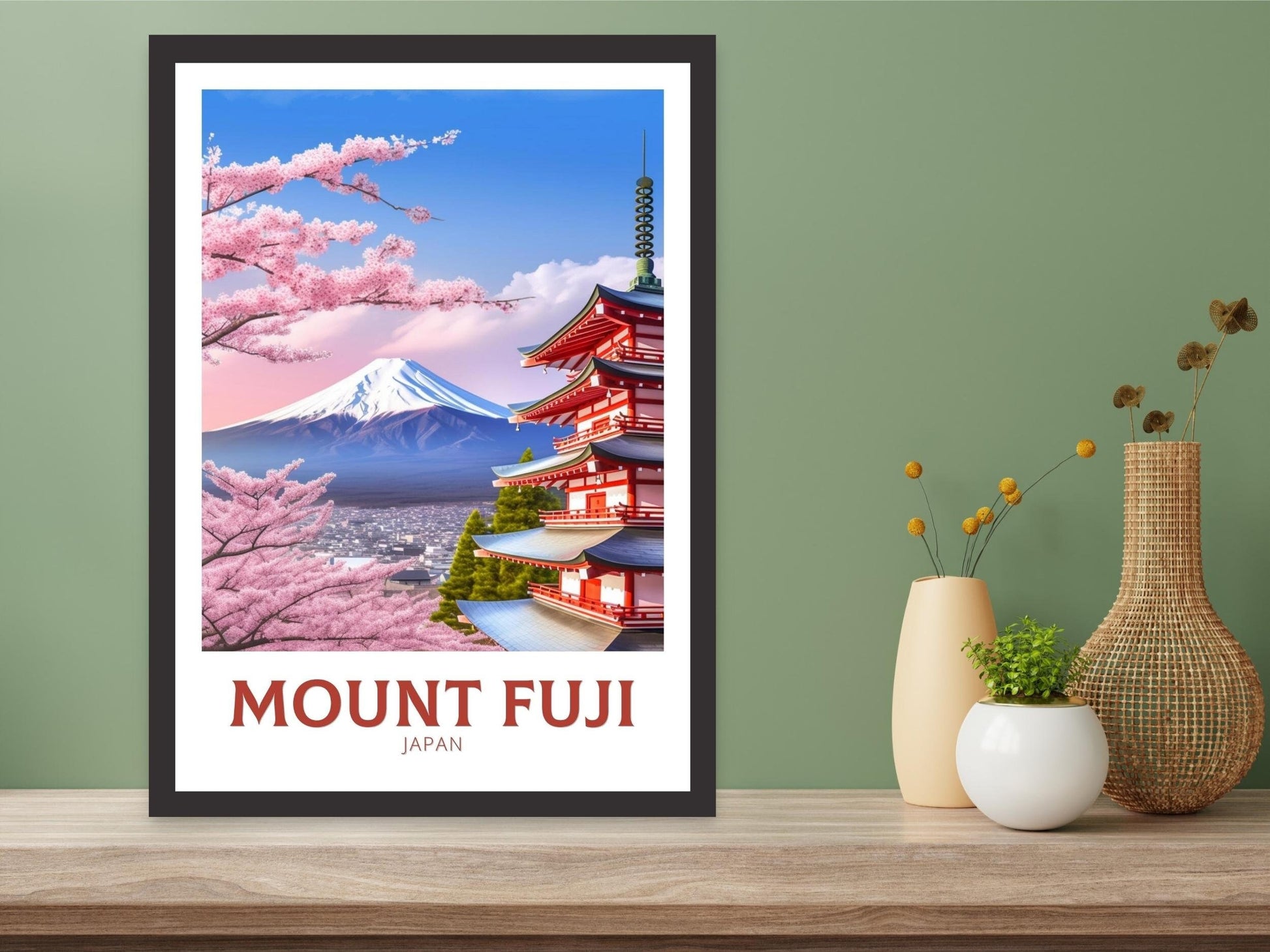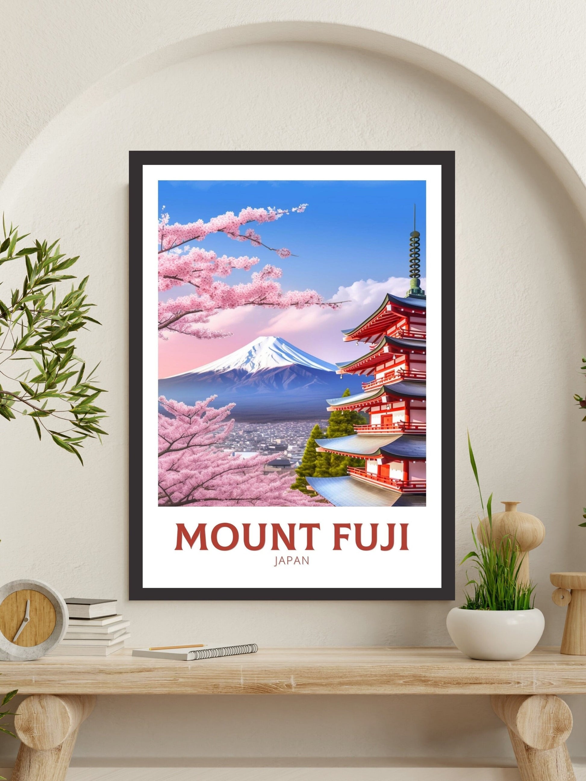Notre affiche de voyage Fuji - Art rétro japonais plonge votre intérieur dans la beauté emblématique de la montagne sacrée du Japon grâce à son design nostalgique. Idéale pour les passionnés de voyages et les amateurs d'art rétro, elle capture le sommet enneigé du mont Fuji et ses cerisiers en fleurs dans un style intemporel. Que vous ayez admiré ses pentes ou rêvé de sa sérénité, cette affiche rétro Fuji embellira votre décoration.