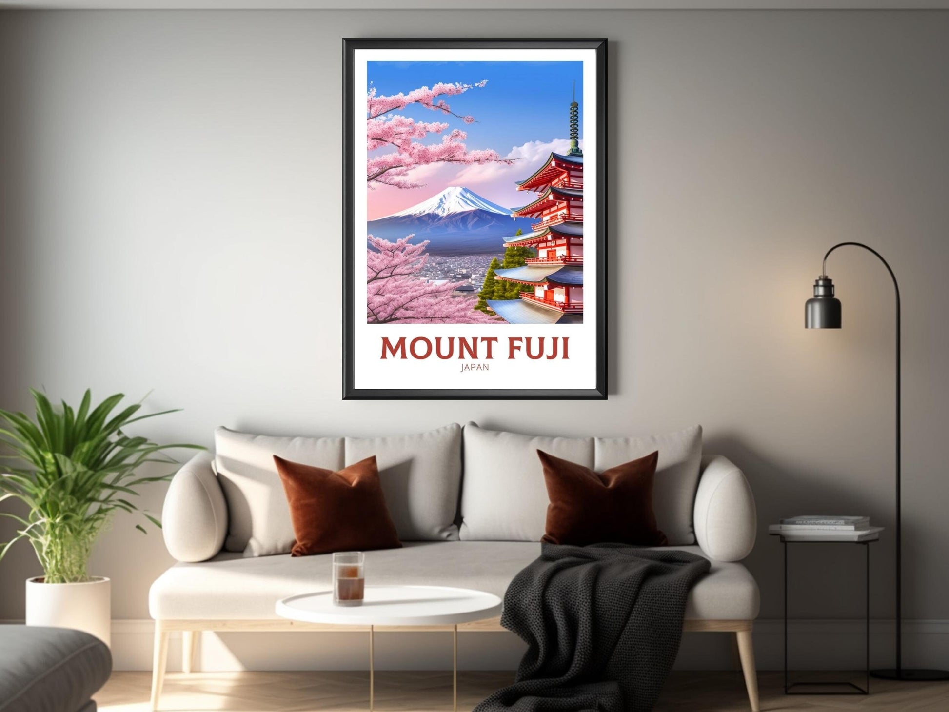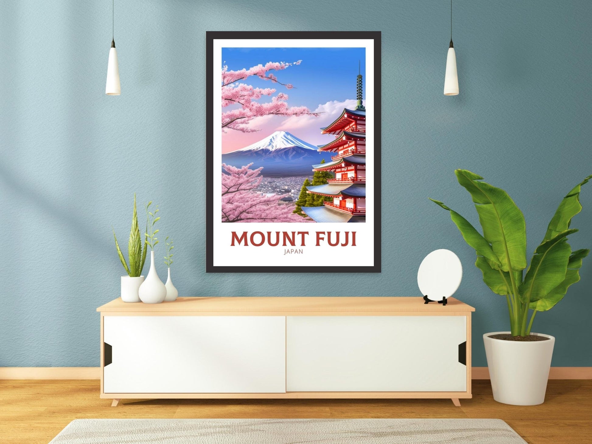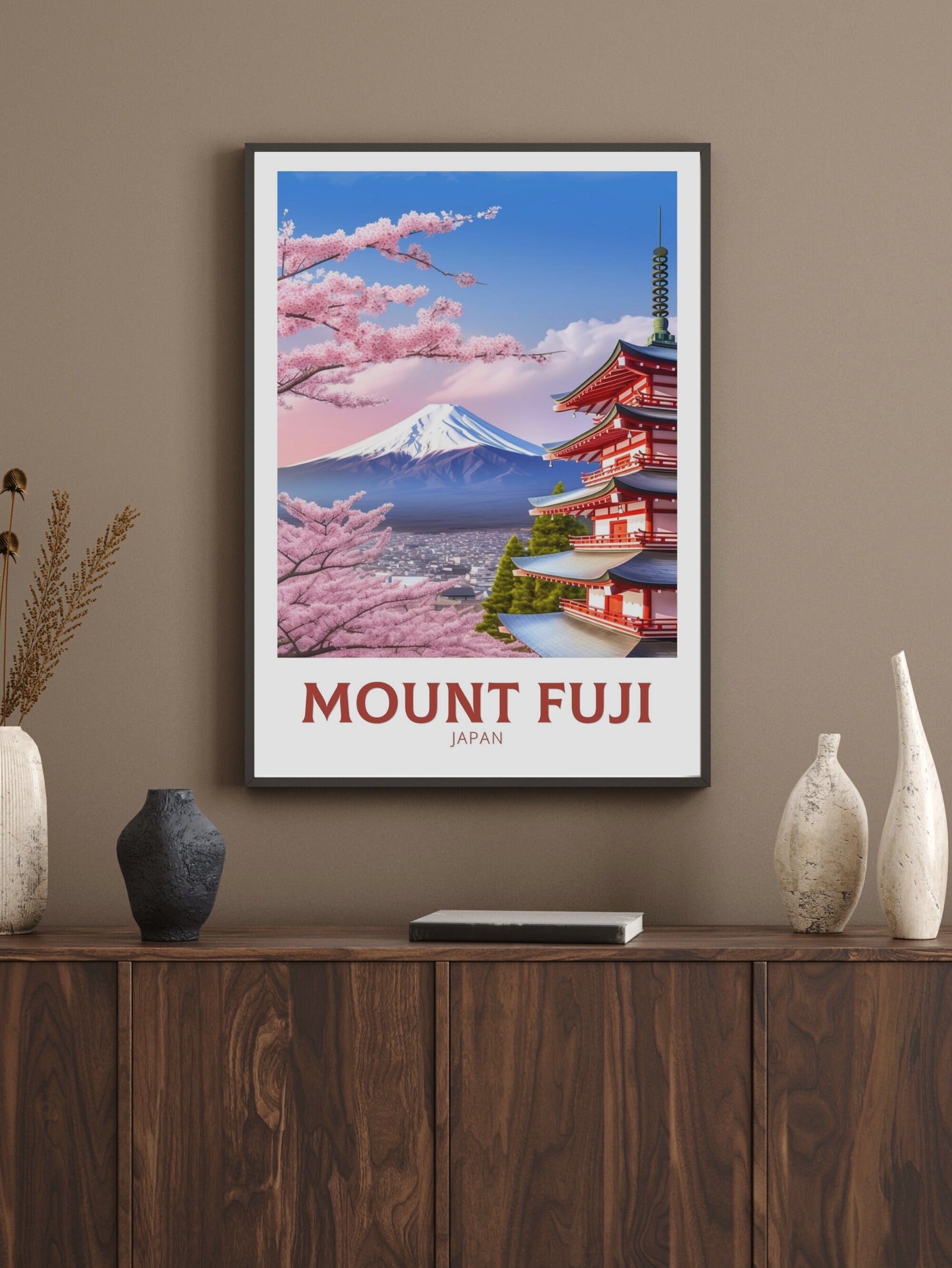 Notre affiche de voyage Fuji - Art rétro japonais plonge votre intérieur dans la beauté emblématique de la montagne sacrée du Japon grâce à son design nostalgique. Idéale pour les passionnés de voyages et les amateurs d'art rétro, elle capture le sommet enneigé du mont Fuji et ses cerisiers en fleurs dans un style intemporel. Que vous ayez admiré ses pentes ou rêvé de sa sérénité, cette affiche rétro Fuji embellira votre décoration.