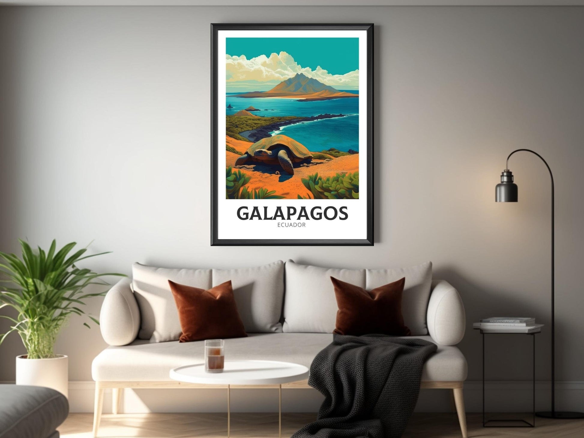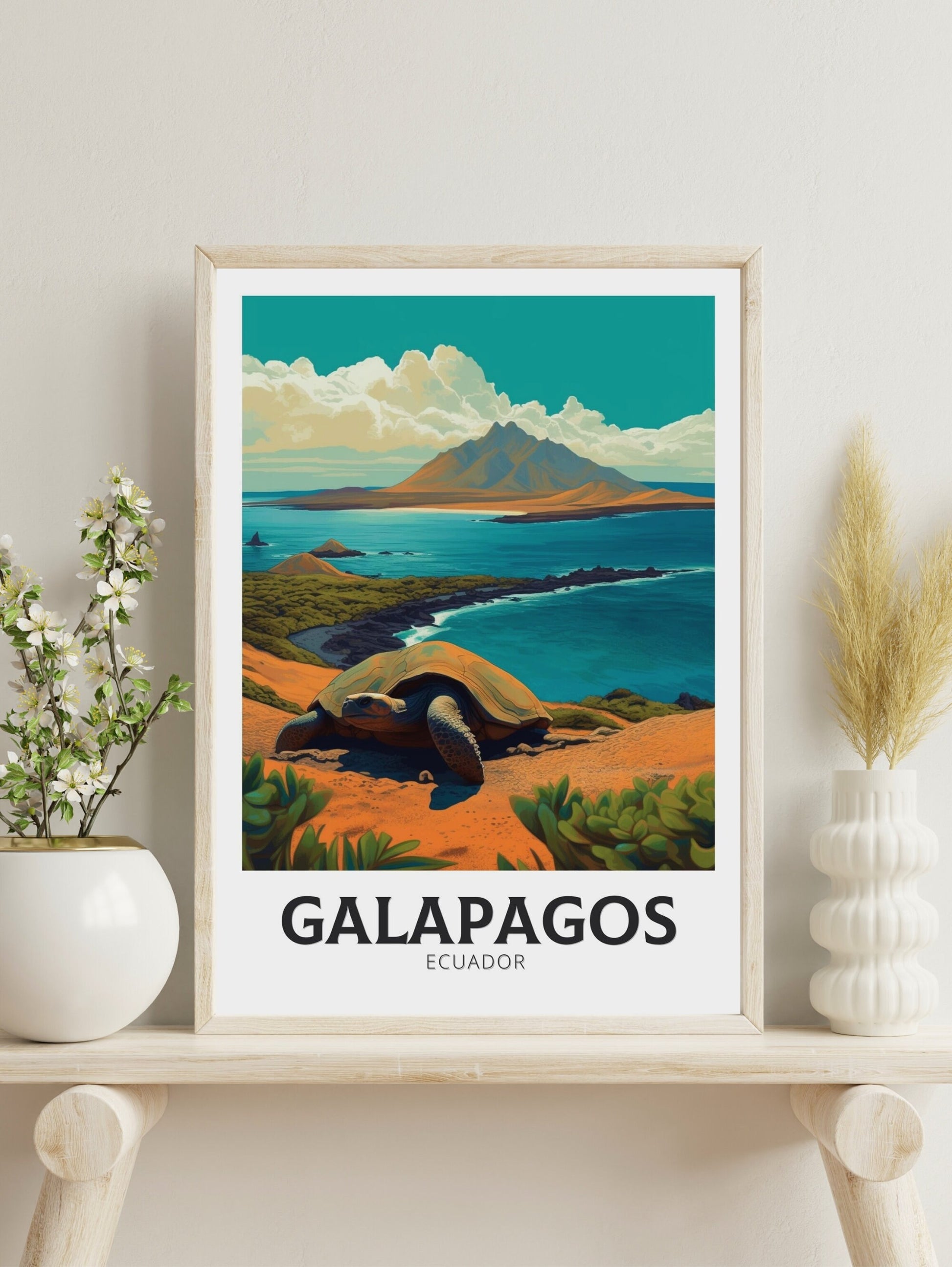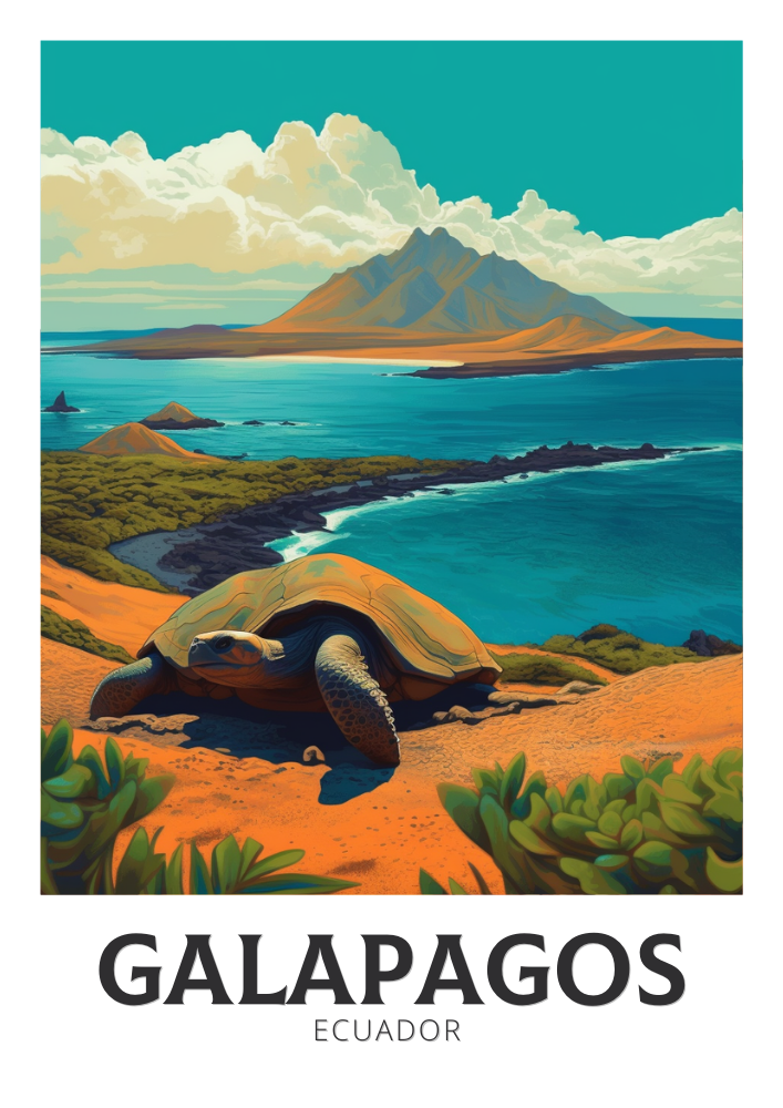 Notre affiche Galápagos – Illustration de voyage – plonge votre intérieur dans les merveilles sauvages des îles Galápagos, en Équateur, grâce à son design vibrant. Idéale pour les passionnés de voyages et les amateurs d'art, elle capture les volcans escarpés et la faune rare avec un détail saisissant. Que vous ayez exploré ses côtes ou rêvé de ses merveilles, cette affiche des Galápagos sera un ajout magnifique à votre décoration.