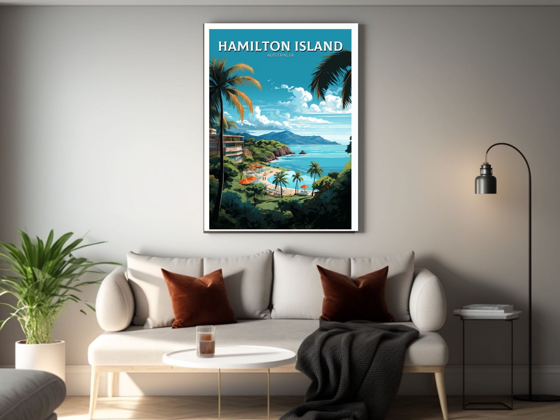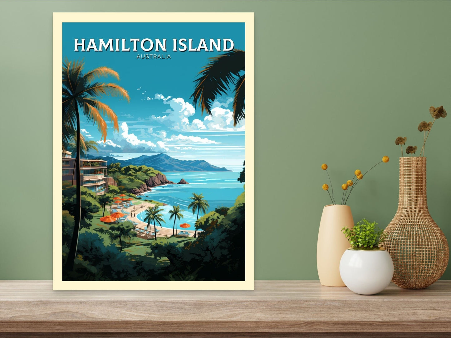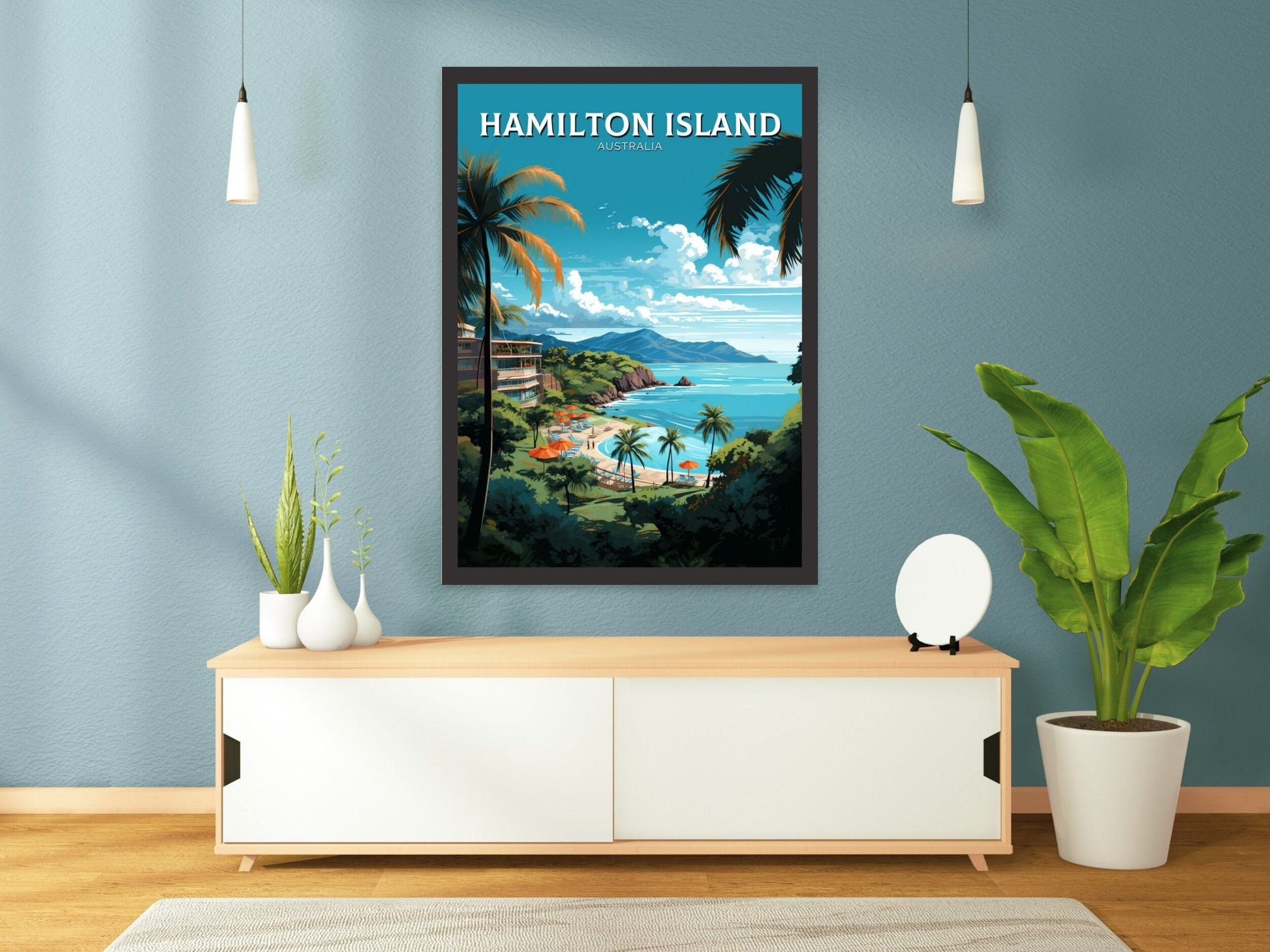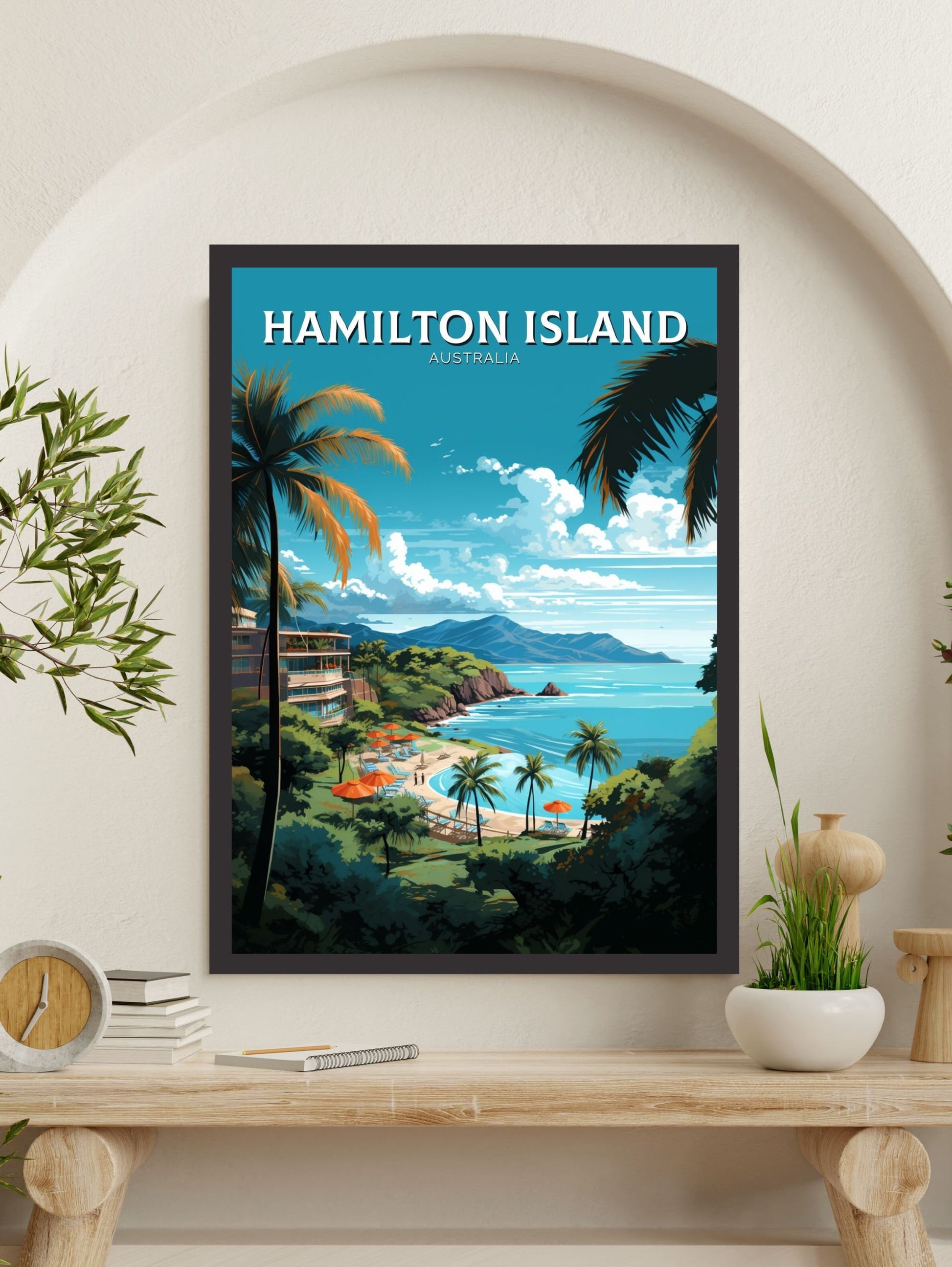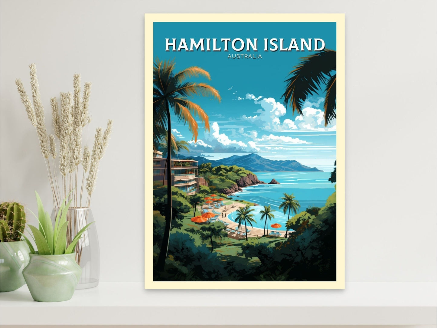 Célébrez l'atmosphère paisible et luxueuse de l'île Hamilton avec cette élégante affiche de voyage.