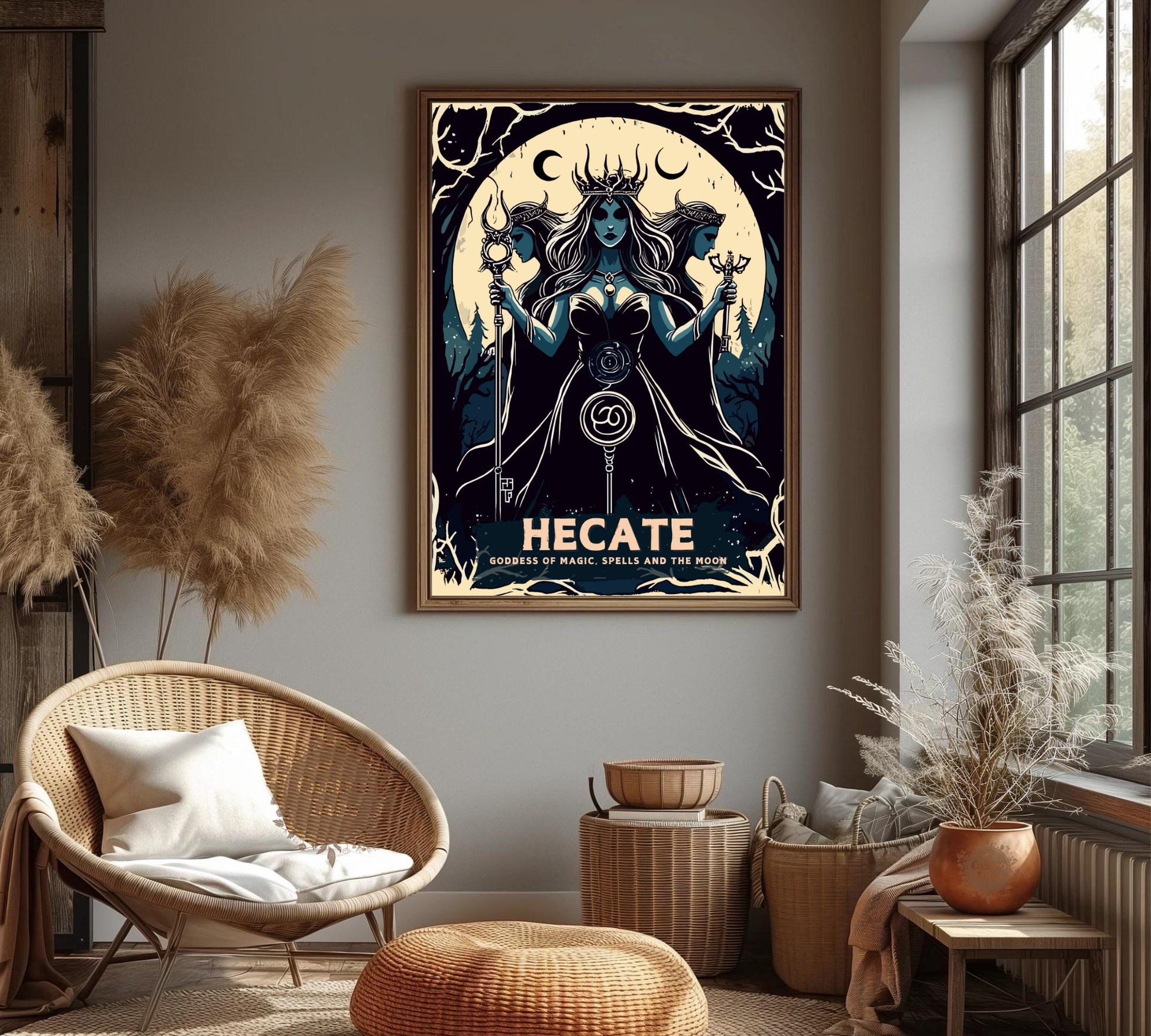 Notre affiche de la déesse Hécate projette une aura mystique dans votre espace grâce à son design enchanteur. Parfaite pour les passionnés de mythologie et les personnes en quête de spiritualité, elle représente Hécate, la déesse grecque de la magie, avec ses torches et sa présence éthérée. Que vous vénériez ses traditions ou que vous aimiez l'art mythique, cette affiche mythologique d'Hécate apportera une touche captivante à votre décoration.