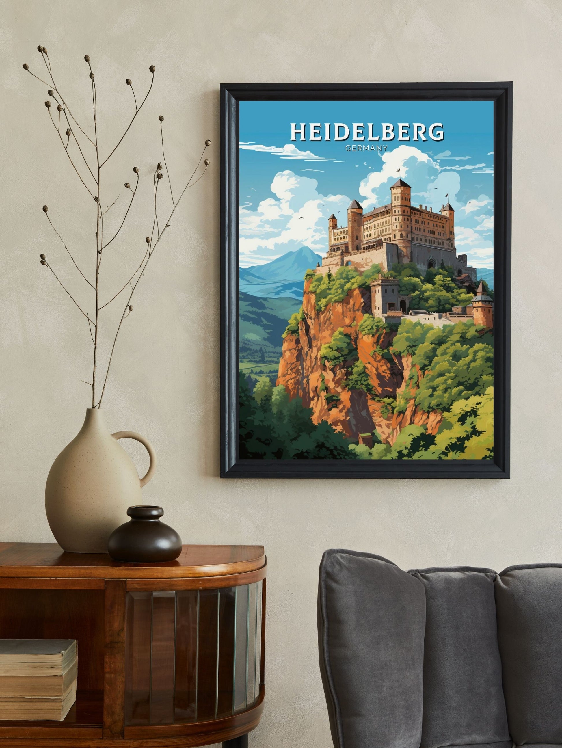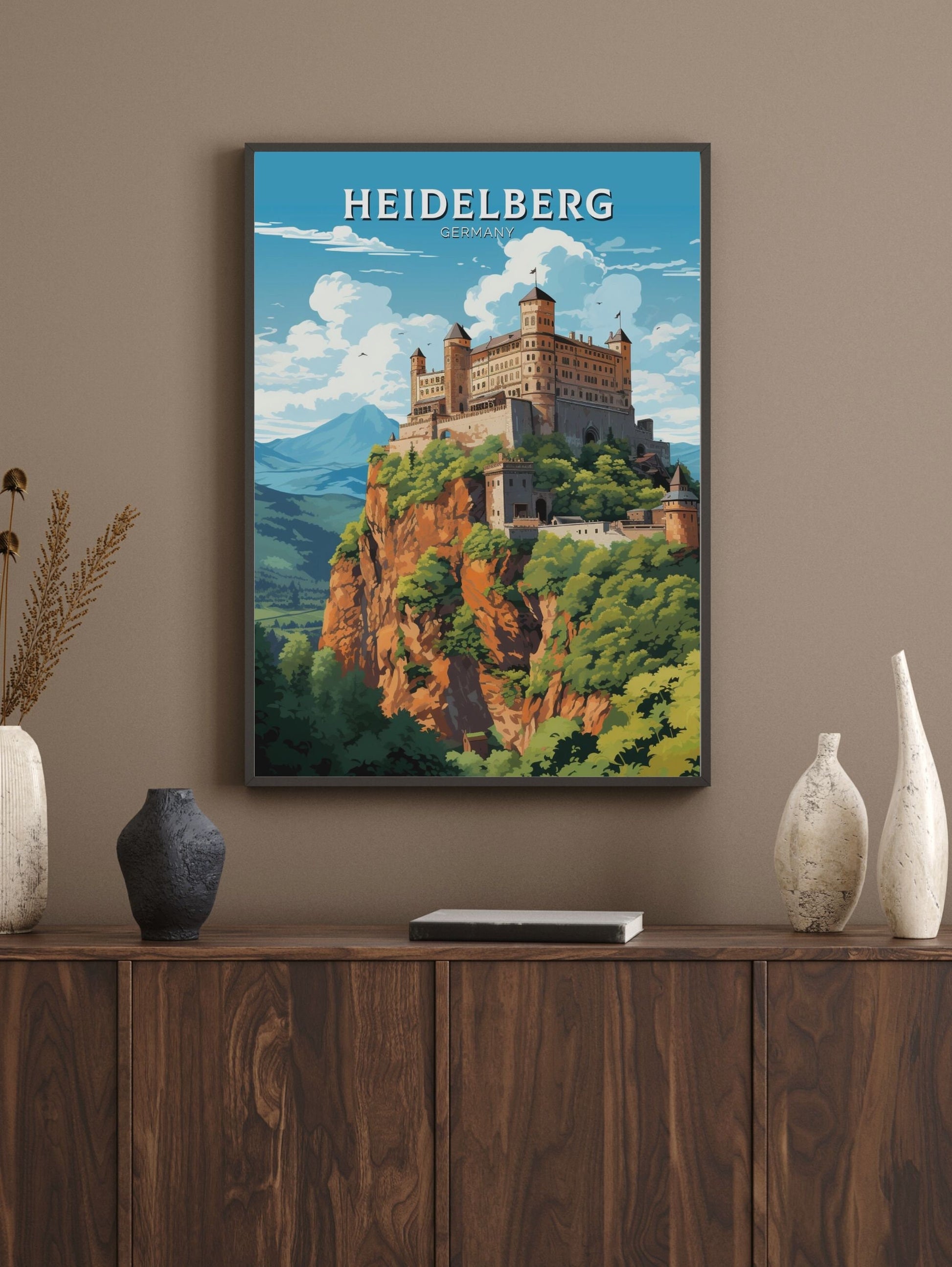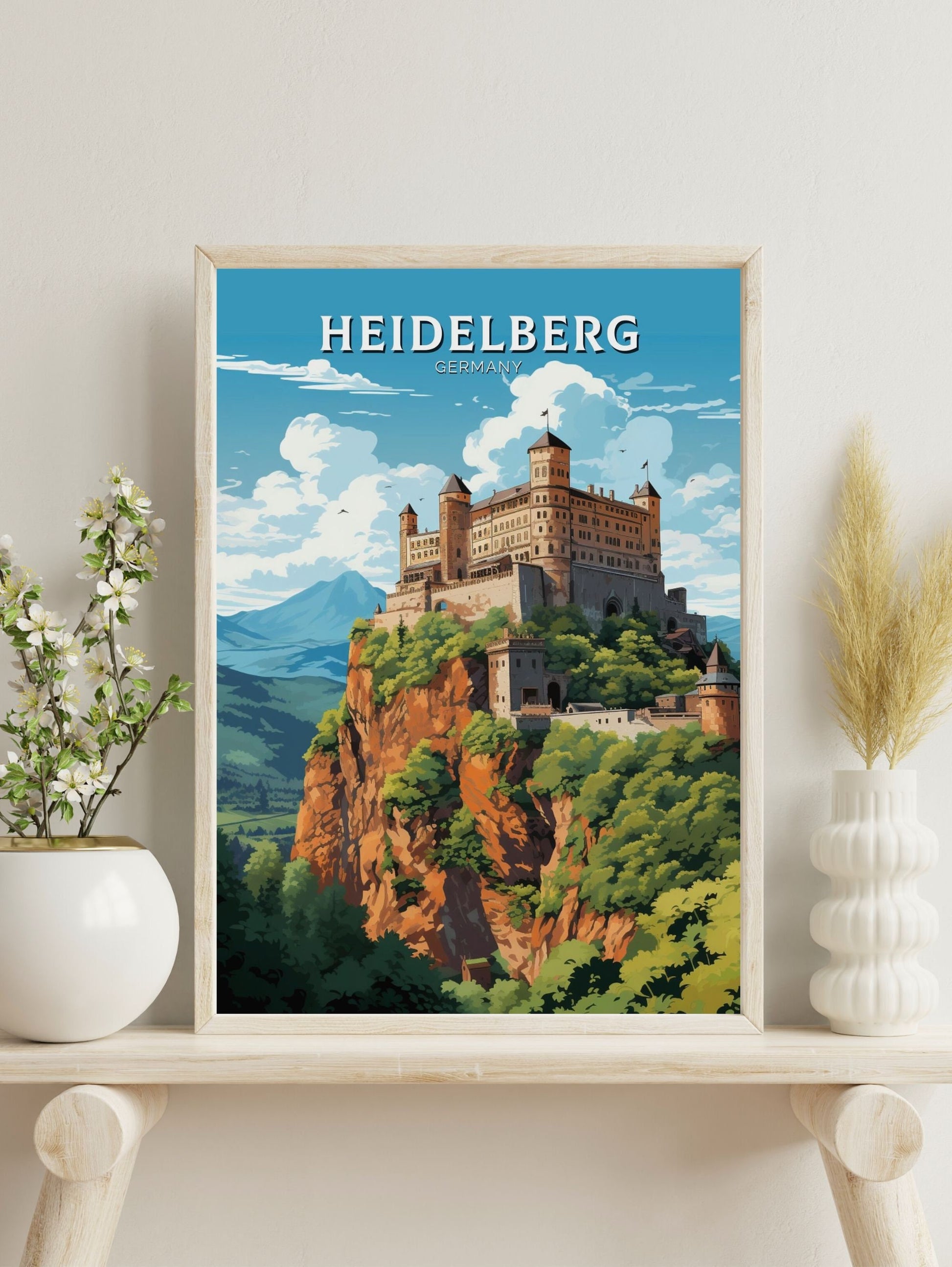 Que vous ayez flâné dans ses rues pavées ou rêvé de visiter cette ville enchanteresse, l' affiche de voyage Heidelberg fait entrer la beauté intemporelle et la richesse culturelle de l'Allemagne chez vous ou au bureau. Imprimée sur du papier de qualité supérieure avec des encres vives et résistantes à la décoloration, elle apporte une touche élégante et inspirante à n'importe quelle pièce, un hommage à l'esprit captivant de Heidelberg .